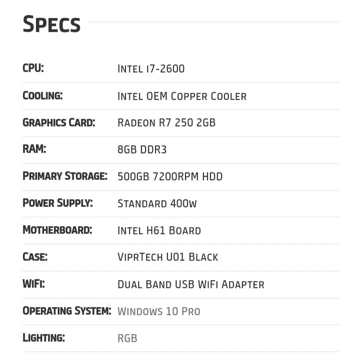ViprTech Gaming PC Desktop Computer Intel i5-650 Radeon R7 250 2GB DDR3 Ram 8GB. Condition is Used. Shipped with USPS Ground Advantage.