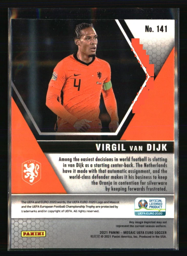 Year Manufactured: 2021 Manufacturer: Panini Team: Netherlands Set: 2021 Panini Mosaic UEFA EURO 2020 Graded: No Season: 2021 Type: Sports Trading Card Sport: SOCCER Autographed: No Player|Athlete: Virgil van Dijk Card Number: 141