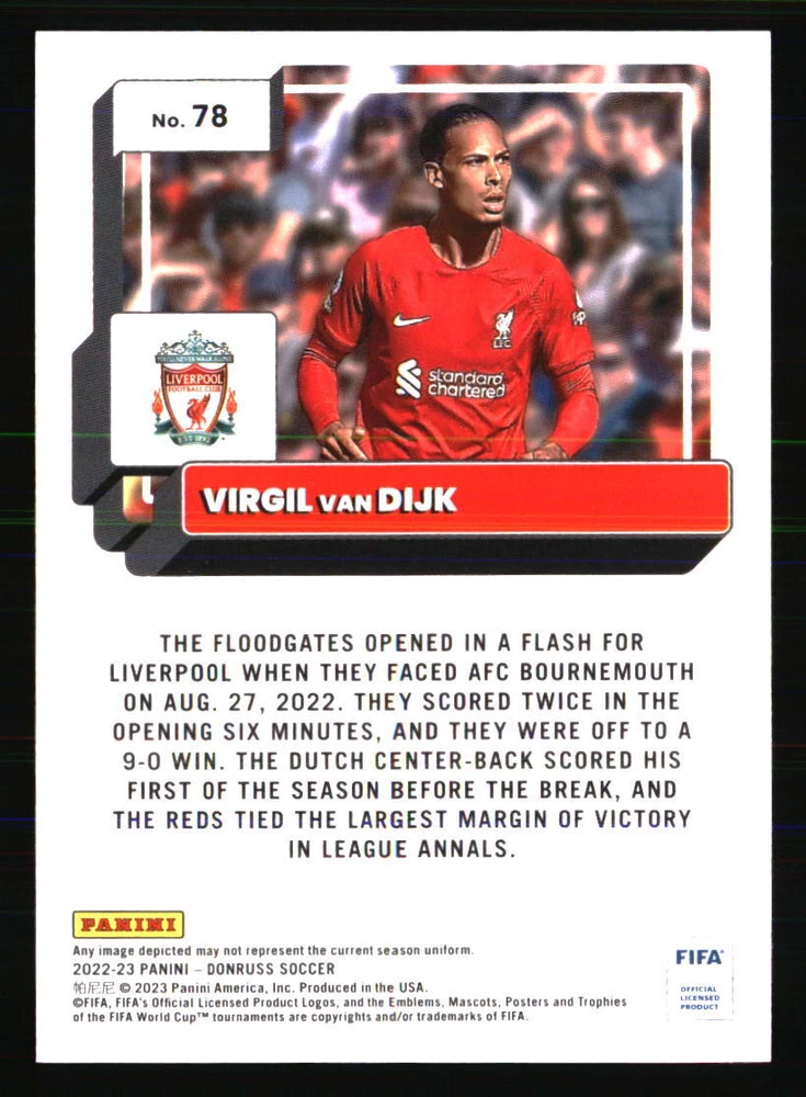 Autographed: No Year Manufactured: 2022 Card Number: 78 Type: Sports Trading Card Season: 2022 Set: 2022-23 Donruss Team: Liverpool Player|Athlete: Virgil van Dijk Sport: SOCCER Graded: No Manufacturer: Donruss