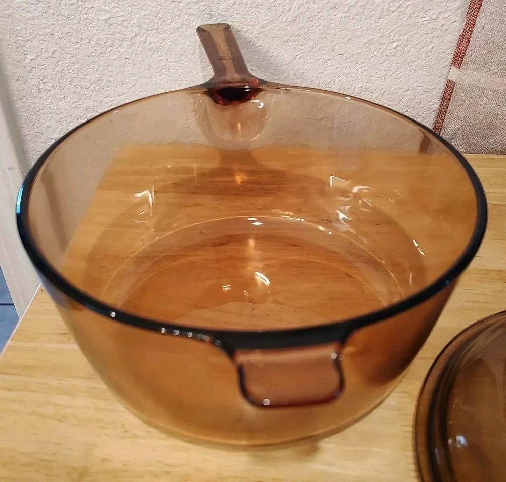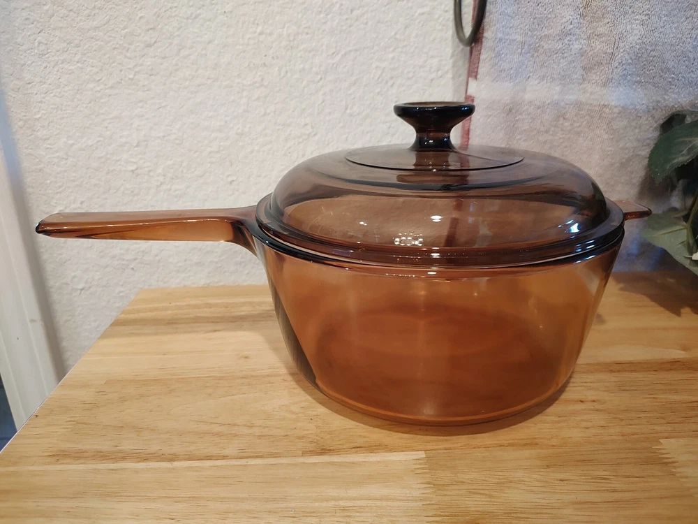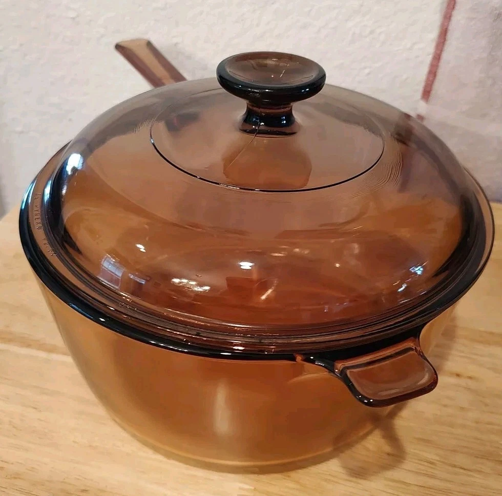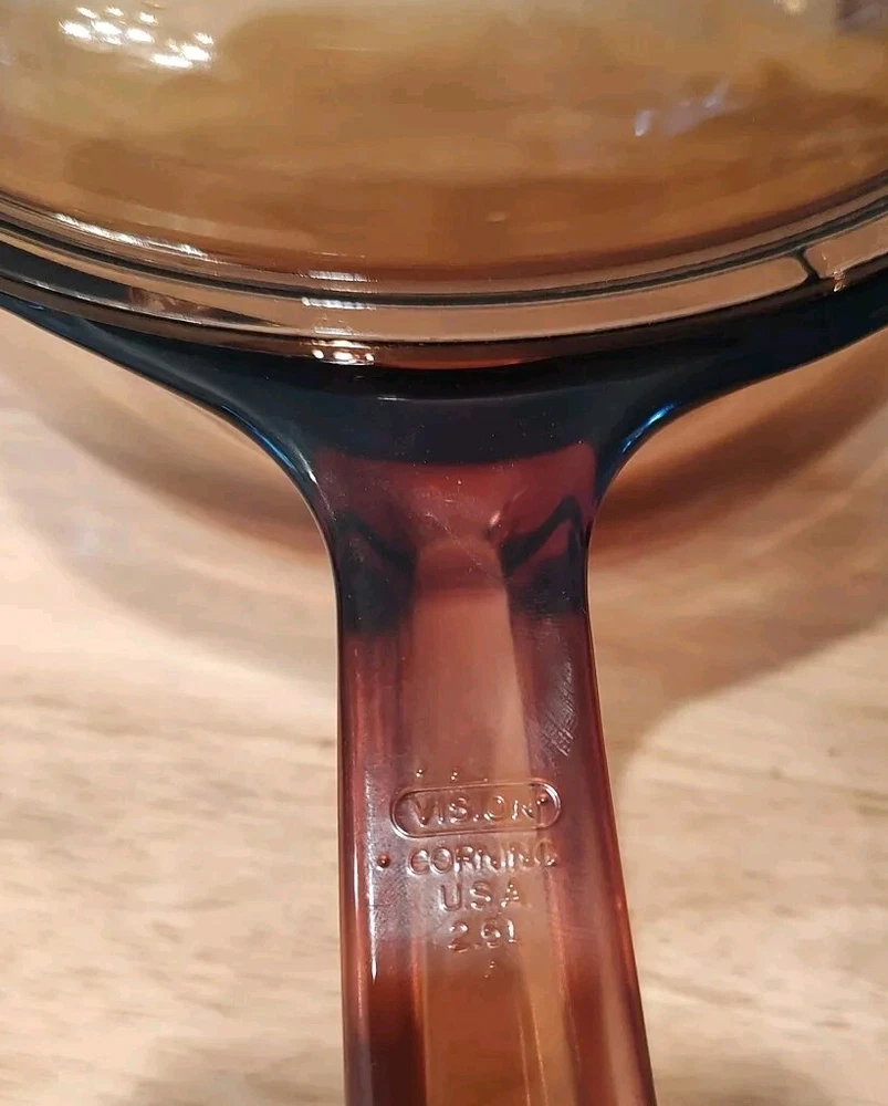 Vision Ware Corning Sauce Pan Pot 2.5 L With Lid Amber Cookware USA, pot has a small smooth chips on top edge beside of handle, shown in pictures, please view photos for details, price discounted accordingly.