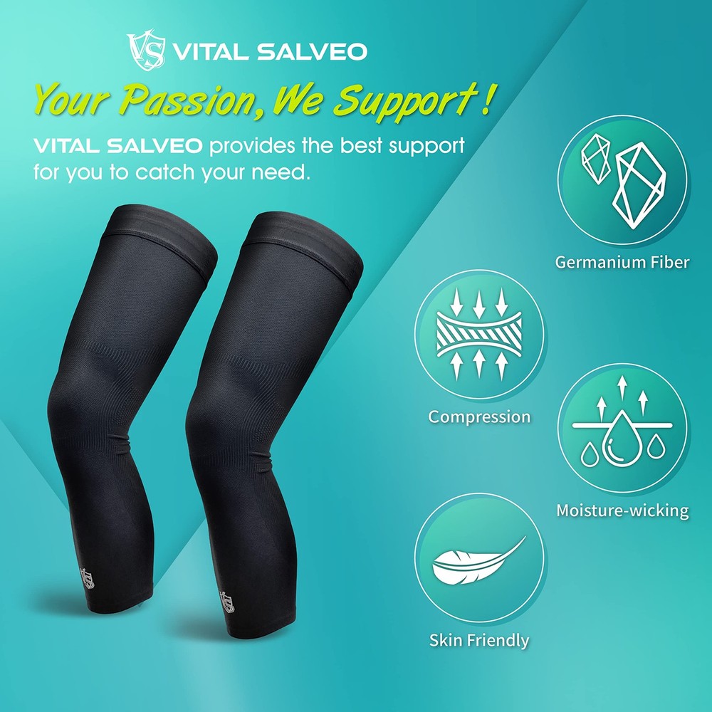 Vital Salveo - Germanium Recovery Compression Outdoor Full-Length Leg Knee Sleeves- Embroidered Logo(1 Pair) with the superior compression to provide the maximum boost to your circulation.The full length cover your knee and thigh with perfect fit and compression.CAUTION--If you have sensitive skin, we recommend taking it off when you finish sports. Do not wear it for a long time. Please make sure you pull the leg sleeve to the top of your leg, so it can stay in place and prevent it slip. INNOVATIVE FIBER- Our fabrics have elasticity and the compression will support and heightened awareness of your core muscles and recover faster. Provides your thigh, knee, hamstrings, leg, calves and muscle compression with our germanium fiber that keeps your better performance to increasing joint endurance. PROFESSIONAL COMPRESSION TECHNOLOGY -- Provide medium graduated compression to reduce soreness and ease the leg discomfort. It also supports your muscle and increases your athletic activities. COMFORTABLE AND BREATHABLE FOR DAILY WEAR -- Seamlessly knit structure and breathable fiber for exact fit. It even has sun protection with UPF 50+. You can wear them all the time, even when you are doing sports activities, such as playing basketball, going hiking, jogging, walking, running, and more! HELP YOU GET THROUGH THE TOUGH TIME -- It also helps a lot if you are suffering from arthritis, tendonitis, inflammation, injury or muscle soreness, joints pain, and muscle stiffness. We cannot cure them but it can ease your pain. UPGRADED ANTI-SLIP DESIGN -- Silicone gel on the top edge of the sleeve for anti-slip during intense activities. Make sure you pull the leg sleeve to the top of your leg, so it can stay in place and prevent it slip. If you have sensitive skin, we recommending take it off when you finish sports and do not wear it for a long time.