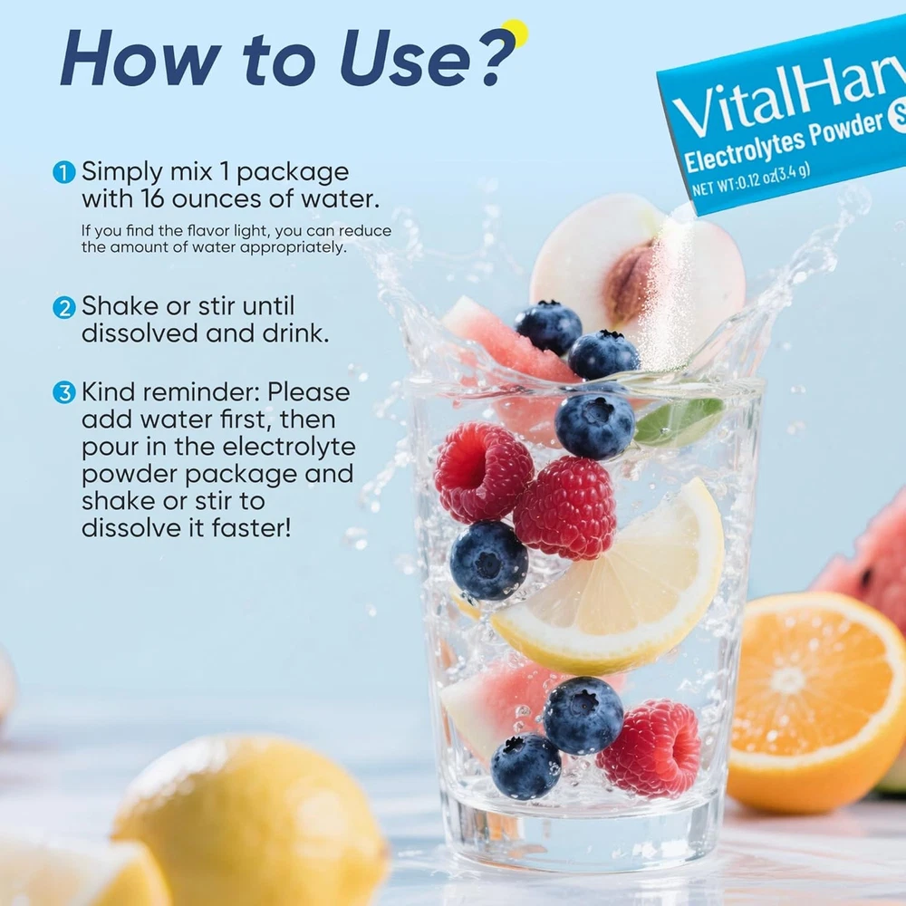VitalHarvest 36 Sticks Electrolytes Powder Packets Sugar Free 36 Count Description Features: 【Rapid and Effective Hydration】 Each sugar-free electrolytes powder packets contains 5 minerals (sodium, potassium, calcium, magnesium, and zinc) and 5 nutrients (vitamin C, vitamin B6, vitamin B12, niacin, and pantothenic acid). It replenishes water and electrolytes lost in the body faster than plain water, maintaining osmolar pressure of intracellular and extracellular liquids, relieving fatigue, and quickly restoring physical energy. 【Sugar-Free and Deliciously Refreshing】Unlike other market alternatives, our formula doesn’t overpower with saltiness or sweetness. These hydration powder with sodium content within the nutrition recommendation range are ideal for those on low-carb or keto diets, intermittent fasting, or vegetarian lifestyles. 【Revitalize and Replenish】The electrolytes powder packets no sugar can prevent dehydration, extreme thirst, dry skin, muscle spasms, headaches, fatigue, and confusion caused by high-intensity exercise, travel,l or busy work, which can quickly rehydrate, balance body fluids, speed up recovery and keep you energized. 【Portable Single-Serving Packets】Our compact individual packaging is easy to carry, ensuring you can stay hydrated anytime, anywhere. Ideal for travel, sports activities, parties, and daily use, it’s a must-have for people working in high-temperature environments such as firefighters, construction workers, solar farms, or oil fields. 【Easy to Use】Simply mix 1 package with 16 ounces of water to enjoy your preferred taste. Shake or stir until dissolved and drink. The taste is better on ice. (If you find the flavor light, you can appropriately reduce the amount of water.) Kind reminder: Please add water first, then pour in the electrolyte drink mix package and shake or stir to dissolve it faster! Product Details: Package Dimensions : 7.24 x 6.93 x 2.8 inches; 2.82 ounces Manufacturer : VitalHarvest Country of Origin : China Brand: VitalHarvest Flavor: White Peach Primary Supplement Type: Calcium, Vitamin C, Magnesium, Potassium, Zinc Unit Count: 4.3 Ounce Item Form: Bar Item Weight: 80 Grams Product Benefits: Supports Electrolyte Balance Number of Items: 1 Material Feature: Low Sodium Material Type Free: Sugar Free Handling We will ship all orders within 1 business day of payment. Delivery We Do Not Ship Outside of the Continental US. Return Policy All items qualify for returns within 30 days of receipt. Buyer is responsible for return shipping on any item that is not damaged. Feedback We take our reputation seriously, we buy and sell online, so we understand the value of trust. If you are unsatisfied with your order, please contact us and we will work with you to resolve it to your satisfaction.