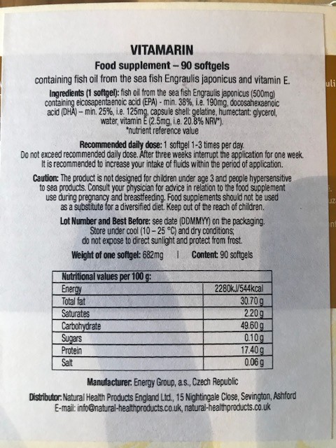 » prevention of and as a treatment supplement for breast, colon, prostate and lung cancer » preparing the body for a planned pregnancy » risk of premature birth, support of healthy foetal development » diabetes » supporting blood circulation, protecting and improving the skin » menstrual cramps, premenstrual syndrome » failure to thrive and joint pain in children, growing pains in adolescents Composition of Vitamarin Fish oil from Engraulis japonicus, a sea fish, an important natural source of omega-3 unsaturated fatty acids, iodine and vitamins A and D providing the following benefits: » Essential fatty acids play an important role in a number of vital processes in the human body. They are mainly involved in the regulation of blood pressure and blood coagulation, influence the immune system and fat metabolism. They have anti-inflammatory effects and a beneficial effect on the activity of the nervous system. » Iodine is an element important for the proper functioning of the thyroid gland and the development of the CNS. » Vitamin D supports the absorption of calcium and phosphorus in the intestine and is necessary for the construction and mineralisation of bones and teeth. It also plays a role in immune and anti-tumour defence. » Vitamin A strengthens the body?s immunity and is needed for proper bone growth and development. It affects the quality of skin, hair and all mucous membranes and has beneficial effects on eyesight. It has proven anti-cancer effects. » Vitamin E increases vitamin absorption, has an antioxidant effect, strengthens immunity and reduces the risk of lifestyle diseases. >Recommended dosage 1 capsule, 1-3 times per day after a meal. Do not exceed the recommended daily dose. After 3 weeks of use, take a one-week break. It is recommended to increase the intake of fluids while taking it. Warning: The product is not intended for children under 3 years of age and for persons allergic to sea products. Food supplements are not a substitute for a varied diet. Storage: Store in a dry place, out of direct sunlight, at a temperature of 10-25°C (64-77°F). Protect from frost. Keep out of reach of children.