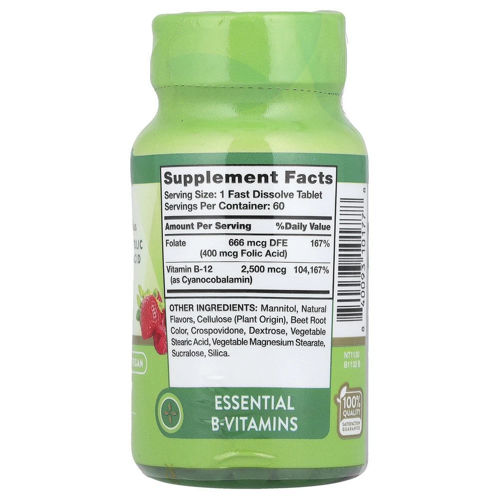 Gluten Free Our Non-GMO Pledge Vegan Vitamin Supplement Vegetarian Formula Essential B-Vitamins Vitamin B-12 is found in a variety of foods like fish, meat, and eggs; however, some people who may eat these foods regularly may not get enough essential vitamin B-12 in their daily diet. Nature’s Truth® Fast Dissolve B-12 2,500 mcg ensures you’re getting enough of this important vitamin each day. B Vitamins are water-soluble, meaning they metabolize at a much faster rate in your body. Likewise, water soluble vitamins exit your body just as quickly as they were absorbed. Since our bodies neither produce nor store water soluble vitamins, we need to consistently nourish our systems with those vitamins daily Our eBay Store About Us Contact Us Add to Favorite Sellers Supplement Facts Serving Size: 1 Fast Dissolve Tablet Servings Per Container: 60 Amount Per Serving %Daily Value Folate 666 mcg DFE (400 mcg Folic Acid) 167% Vitamin B-12 (as Cyanocobalamin) 2,500 mcg 104,167% Expiration Date: 03/01/2027 Disclaimer: Our receiving department does its best to verify and then enter the correct expiration dates for all incoming products. However, discrepancies do occur from time to time. This being said, the exceptionally high turnover at iHerb ensures that our inventory is among the freshest in the industry. Nature's Truth, Vitamin B-12 plus Folic Acid, Natural Berry, 2,500 mcg, 60 Fast Dissolve Tablets DESCRIPTION: Gluten Free Our Non-GMO Pledge Vegan Vitamin Supplement Vegetarian Formula Essential B-Vitamins Vitamin B-12 is found in a variety of foods like fish, meat, and eggs; however, some people who may eat these foods regularly may not get enough essential vitamin B-12 in their daily diet. Nature’s Truth® Fast Dissolve B-12 2,500 mcg ensures you’re getting enough of this important vitamin each day. B Vitamins are water-soluble, meaning they metabolize at a much faster rate in your body. Likewise, water soluble vitamins exit your body just as quickly as they were absorbed. Since our bodies neither produce nor store water soluble vitamins, we need to consistently nourish our systems with those vitamins daily. Our B-12 fast dissolve tablets can provide you with the peace of mind that you are meeting the daily requirement for Vitamin B-12. Additionally, these delicious berry flavored B-12 Vitamins are packed with Folic Acid, another daily essential vitamin. SUGGESTED USE: For adults, take one (1) fast dissolve tablet daily, preferably with a meal. INGREDIENTS: Mannitol, natural flavors, cellulose (plant origin), beet root color, crospovidone, dextrose, vegetable stearic acid, vegetable magnesium stearate, sucralose, silica. Free of gluten, yeast, milk, lactose, soy, artificial flavor, preservatives. WARNINGS: If you are pregnant, nursing, taking any medications or have any medical condition, consult your doctor before use. If any adverse reactions occur, immediately stop using this product and consult your doctor. If seal under cap is damaged or missing, do not use. Keep out of reach of children. Store in a cool, dry place.