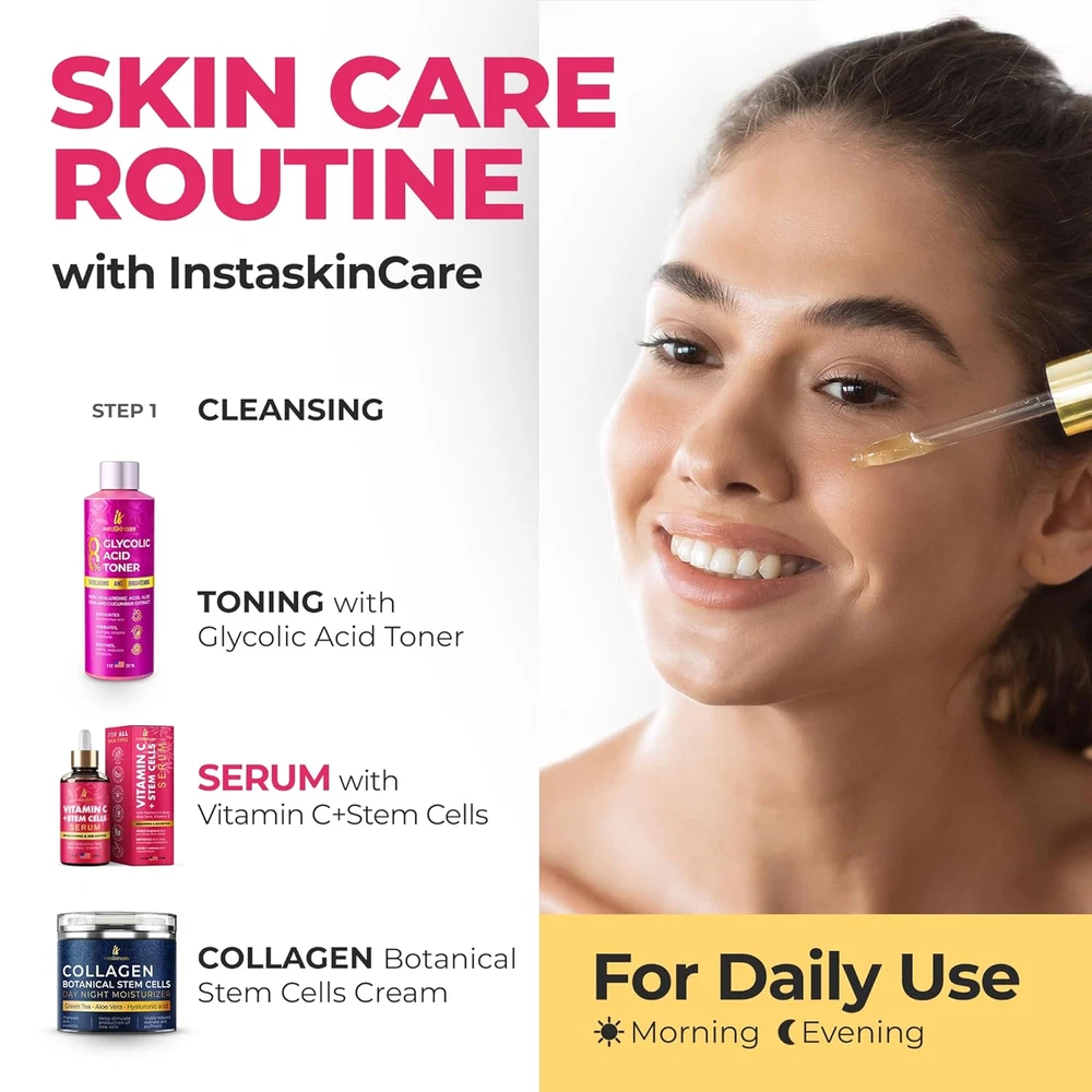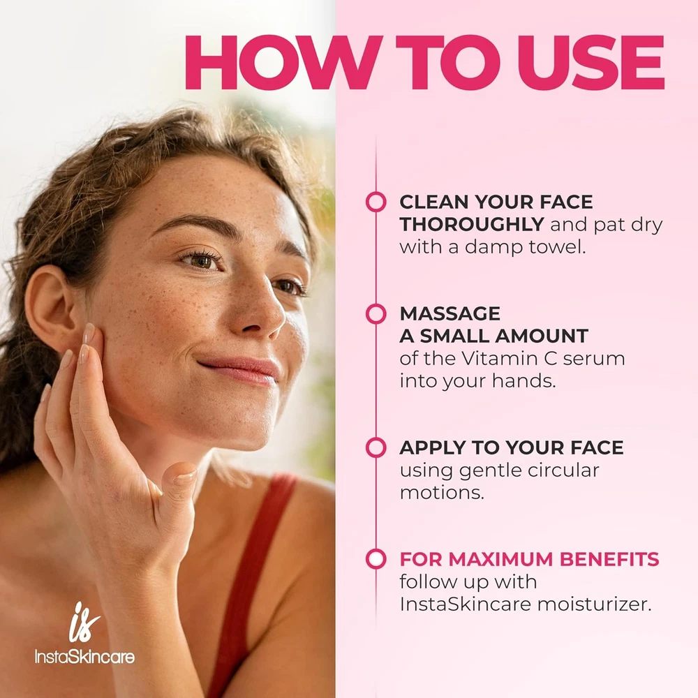 Gentle Skin Revitalization – InstaSkincare Vitamin C Serum for Face with Hyaluronic Acid is packed with antioxidants. Organic Vitamin C Serum evens skin tone, visibly reduces the appearance of discoloration & dull skin, promoting a healthy glow. Powerful Age-Defying Effect - Face Vitamin C Serum minimizes the appearance of fine lines & wrinkles by stimulating collagen production. Regular use of our skin serum visibly enhances skin health & appearance. Optimal Skin Health - Vitamin C serum for face can significantly treat & defend skin from further damage. Use in the morning before moisturizer to protect skin from the negative impact of sun, pollution & makeup. Natural & Safe Formula - Product safety & highest quality are our top priorities. Our Vitamin C face serum is made only from natural & high-quality ingredients: Vitamins C & E, Hyaluronic Acid & Aloe Vera. Safe even for the most sensitive skin! Proudly Made in the USA by a Family-owned and Operated business, dedicated to providing top-quality skincare with premium ingredients and exceptional production standards. Product Description