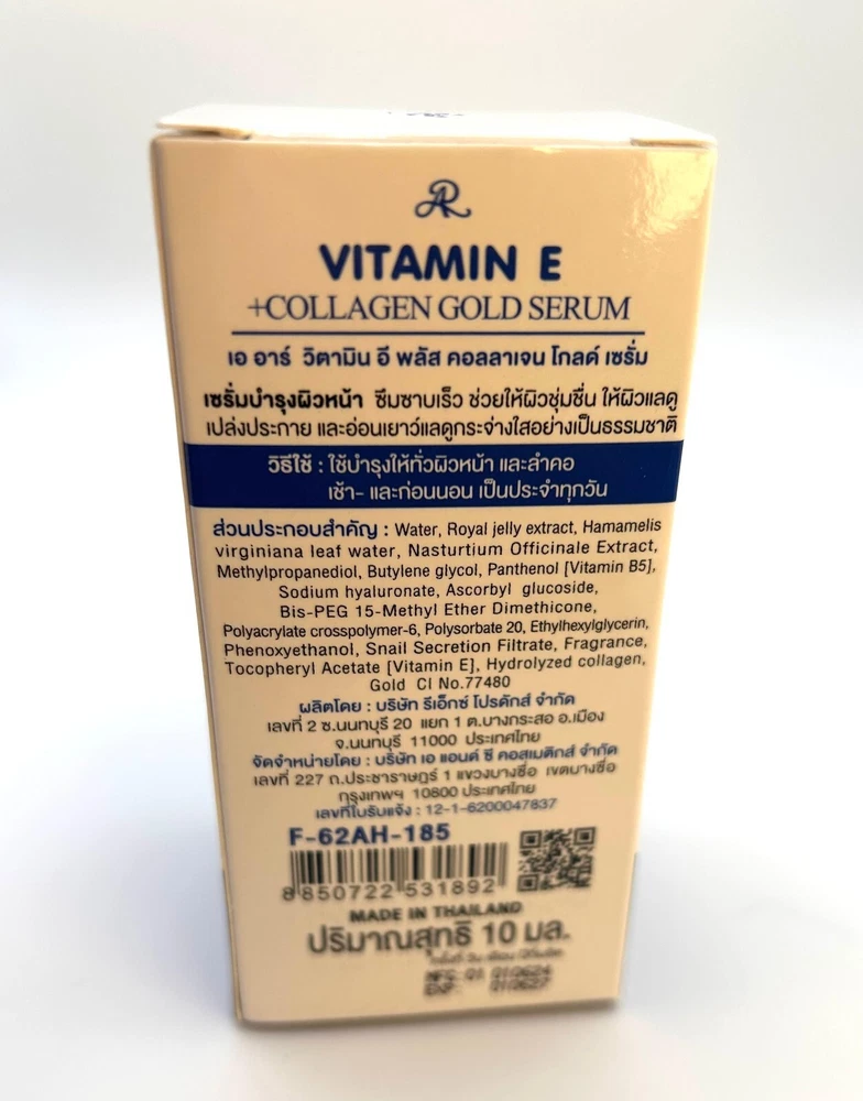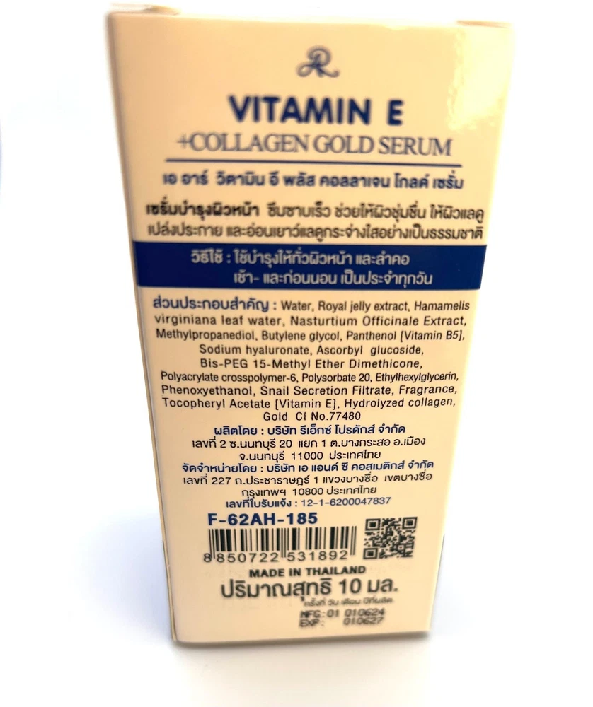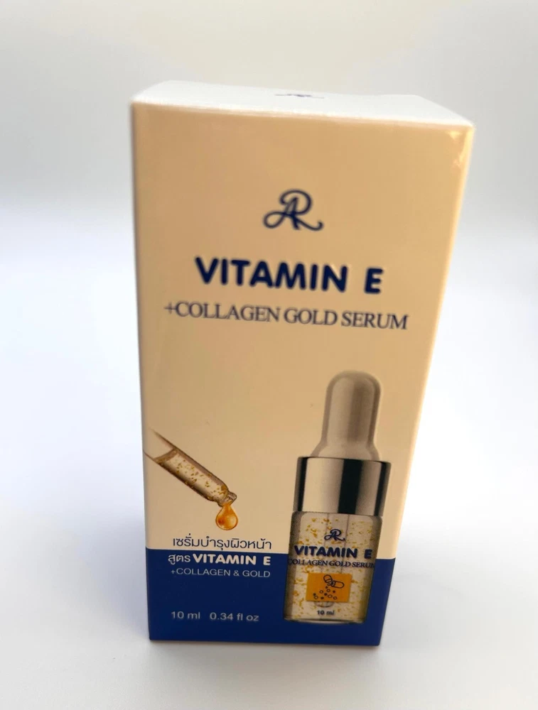 Vitamin E Collagen Gold Serum – Radiance in Every Drop Product Overview: Experience the ultimate in skincare luxury with our Vitamin E Collagen Gold Serum . Infused with the perfect blend of Collagen , Vitamin E , and Hyaluronic Acid , this serum is designed to nourish, hydrate, and rejuvenate your skin for a youthful, radiant glow. Key Features: Collagen Boost: Enhances skin elasticity, reduces the appearance of fine lines, and promotes a firm, plump complexion. Vitamin E Enriched: A powerful antioxidant that protects your skin from environmental damage and promotes healing. Hyaluronic Acid Hydration: Delivers intense hydration to lock in moisture, leaving your skin soft and supple. Gold Infusion: Adds a touch of luxury while helping to brighten and revitalize your skin. Benefits: Reduces the appearance of fine lines and wrinkles Deeply hydrates and nourishes skin Enhances skin’s natural radiance and glow Protects against environmental stressors Improves skin texture and tone How to Use: Cleanse your face thoroughly and pat dry. Apply 2–3 drops of the serum to your face and neck. Gently massage in upward circular motions until fully absorbed. Use daily, morning and evening, for best results. Ingredients: A luxurious formula featuring Collagen, Vitamin E, Hyaluronic Acid, and 24K Gold particles for an unparalleled skincare experience. Size: [10ml or 0.34 fl oz] Why Choose Vitamin E Collagen Gold Serum? Transform your skincare routine with this multi-action serum that hydrates, protects, and restores your skin's youthful glow. Perfect for all skin types, the Vitamin E Collagen Gold Serum is your secret weapon for radiant, flawless skin