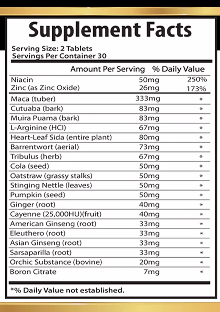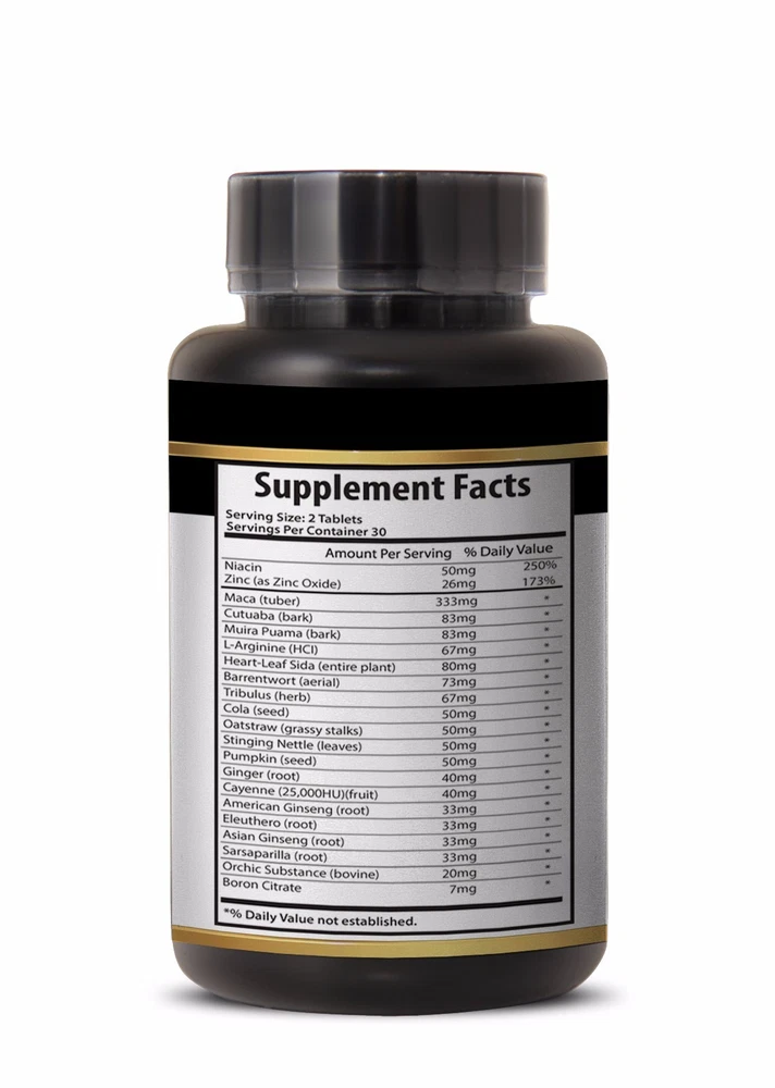 MALE VIRILITY ENHANCEMENT PILLS Dietary Supplement 1 Bottle, 60 Tablets Made in USA VISIT OUR STORE More sexual stamina and control Improved sexual performance Stronger male libido Supports Healthy Testosterone Level Exceptional product with effective natural ingredients Improving Male Virility and Libido! Around the world, there are thousands of men who suffer from sexual health problems. Many aging men experience reductions in testosterone and other, a condition known as andropause. Symptoms of andropause may include reduced sexual response, lack of energy, increased body fat, and mental lethargy. Andropause can be a struggle for many men, it’s frustrating when your body just doesn’t do what it used to. If you want to be more virile and improve your sex life, you will need something more than willpower. There are many different products in the market that seem effective. While some are expensive, others aren’t backed by proper studies or clinical trials. Some products even cause side effects. With all the problems surrounding these products, you need to focus on how these products work and which are proving to work and be the best pills, pumps, or whatever. Buying Male Virility Enhancement will be a good strategy to increase your sex drive and improve your sexual performance. These effective pills can lead to some major improvements in libido. They are affordable, and don’t cause any side effects. Try Our Male Virility Enhancement Pills! Male Virility Enhancement Pills is a completely natural supplement. It’s gentle and safe to use. In addition to this, it contains the perfect mix of amino acids and herbal ingredients. The natural active ingredients in this supplement work together to support male virility. They improve the blood flow to your penis, and provide you with longer power. Most importantly, some ingredients in Male Virility Enhancement Pills can increase your sex drive, and create a youthful sexual response. This provides you with more satisfaction in bed. Due to this, men dealing with different kinds of sexual performance issues are able to take good advantage of this natural solution. It offers excellent results to men who want to get rid of their sexual problems. In case you’re looking for an herbal formula that provides you with a masculine edge, Male Virility Enhancement Pills will be your best choice. Herbal Ingredients of Our Male Virility Enhancement Pills : Most people wonder about the ingredients present in this male enhancement supplement. The ingredients in this one of the best male enhancement pills make it so effective and efficient. Zinc(Oxide): This essential mineral is required for protein synthesis and collagen formation. Sufficient intake and absorption of zinc are needed to maintain a proper concentration of Vitamin E. Zinc plays a vital role in maintaining prostate health, testosterone levels, and maintenance of healthy libido. This mineral helps relax smooth muscles and expand blood vessels. This process makes your body increase blood flow to the genital area and improves sexual perfomance. It is known as an antioxidant and immune boosting supplement, and is most commonly supplemented to reduce the frequency of sickness and to support optimal testosterone levels. Maca Root: Maca is a plant native to the Peruvian highland that started gaining popularity in the US in early 2000-s. This herb is best known for its potential in improving energy levels, vitality, and sexual health. Maca Root is high in protein, natural sugars, iron, potassium, iodine, magnesium, calcium, and fiber and it has many health benefits. Maca root is an herb used to help men improve sexual health. Studies suggest that maca root can enable users to gain full control over the orgasm. Maca root also helps shorten the refractory period to enable users to experience sexual arousal in just minutes following an orgasm. L-Arginine: L-Arginine is considered a semi-essential amino acid that is obtained from the diet and is necessary for protein synthesis in the body. It helps the body get rid of ammonia, helps in making compounds such as creatine, L-glutamate, L-Proline and Glucose. L-Arginine is a pre cursor to nitric oxide, which is a biological gas required for intro cellular communication and blood vessel relaxation. Some evidence shows that arginine may help improve blood flow in the arteries of the heart. This means that extra blood is pumped around the body delivering more oxygen resulting in a stronger immune system, increased healing time, sexual energy and harder power. Tribulus: The active ingredient in tribulus terrestris extract is PROTODIOSCIN, which is a natural precursor of testosterone. Tribulus Terrestris contains steroidal Saponins which is a type of compound and one of the key steroidal saponins in Tribulus plant is Protodioscin. Protodioscin is an active component which is supposed to trigger androgen receptors in cell, making it more receptive to testosterone. Androgen receptors are receptors of Androgens like Testosterone etc and these receptors are present in many of the the tissues in the body. Tribulus can help increase sexual desire in men. Supplements Facts: Niacin 50mg Zinc (as Zinc Oxide) 26mg Maca (tuber) 333mg Catuaba (bark) 83mg Muira Puama (bark) 83mg L-Arginine (HCI) 67mg Heart-Leaf Sida (entire plant) 80mg Barrentwort (aerial) 73mg Tribulus (herb) 67mg Cola (seed) 50mg Oatstraw (grassy stalks) 50mg Stinging Nettle (leaves) 50mg Pumpkin (seed) 50mg Ginger (root) 40mg Cayenne (25,000HU)(fruit) 40mg American Ginseng (root) 33mg Eleuthero (root) 33mg Asian Ginseng (root) 33mg Sarsaparilla (root) 33mg Orchic Substance (bovine) 20mg Boron Citrate 7mg OTHER INGREDIENTS: Cellulose, Gum Arabic (Acacia), Vegetable Stearic, Acid, Modified Cellulose, Silicon Dioxide, Vegetable Magnesium Stearate,and FD&C Blue #2/indigo Carmine Lake. SUGGESTION USE: 2 Tablets daily preferably with a meal or as directed by a healthcare professional. CAUTION: Do not exceed reco
