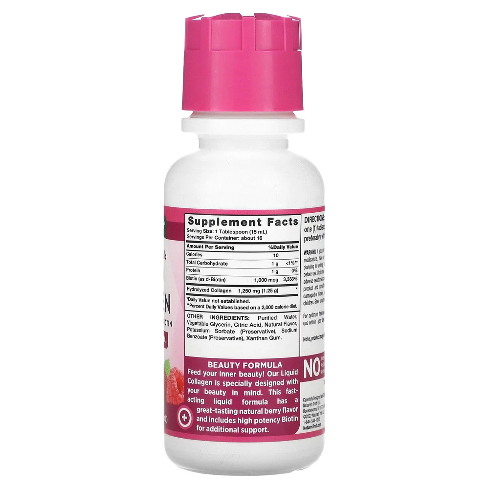 Concentrated Formula Beauty Formula Gluten-Free Non GMO Dietary Supplement Beauty Formula Feed your inner beauty! Our Liquid Collagen is specially designed with your beauty in mind. This fast-acting liquid formula has a great-tasting natural berry flavor and includes high potency Biotin for additional support. Our eBay Store About Us Contact Us Add to Favorite Sellers Supplement Facts Serving Size: 1 Tablespoon (15 ml) Servings Per Container: about 16 Amount Per Serving %Daily Value Calories 10 Total Carbohydrate 1 g <1%** Protein 1 g 0% Biotin (as d-Biotin) 1,000 mcg 3,333% Hydrolyzed Collagen 1,250 mg (1.25 g) * *Daily Value not established. **Percent Daily Values are based on a 2,000 calorie diet. Expiration Date: 07/01/2026 Disclaimer: Our receiving department does its best to verify and then enter the correct expiration dates for all incoming products. However, discrepancies do occur from time to time. This being said, the exceptionally high turnover at iHerb ensures that our inventory is among the freshest in the industry. Nature's Truth, Vitamins, Liquid Collagen with Amino Acid Protein + Biotin, Berry, 8 fl oz (237 ml) DESCRIPTION: Concentrated Formula Beauty Formula Gluten-Free Non GMO Dietary Supplement Beauty Formula Feed your inner beauty! Our Liquid Collagen is specially designed with your beauty in mind. This fast-acting liquid formula has a great-tasting natural berry flavor and includes high potency Biotin for additional support. SUGGESTED USE: For adults, take one (1) tablespoon (15 mL) daily, preferably with a meal. INGREDIENTS: Purified water, vegetable glycerin, citric acid, natural flavor, potassium sorbate (preservative), sodium benzoate (preservative), xanthan gum. No gluten, wheat, yeast, milk, lactose, artificial color, artificial flavor, artificial sweetener. WARNINGS: If you are pregnant, nursing, taking any medications, have any medical condition or are planning to undergo lab testing, consult your doctor before use. Biotin may interfere with lab tests. If any adverse reactions occur, immediately stop using this product and consult your doctor. If outer seal is damaged or missing, do not use. Keep out of reach of children. Store unopened container in a cool, dry place. For optimum freshness, refrigerate after opening and use within 1 year after opening. Note, product may solidify when refrigerated.