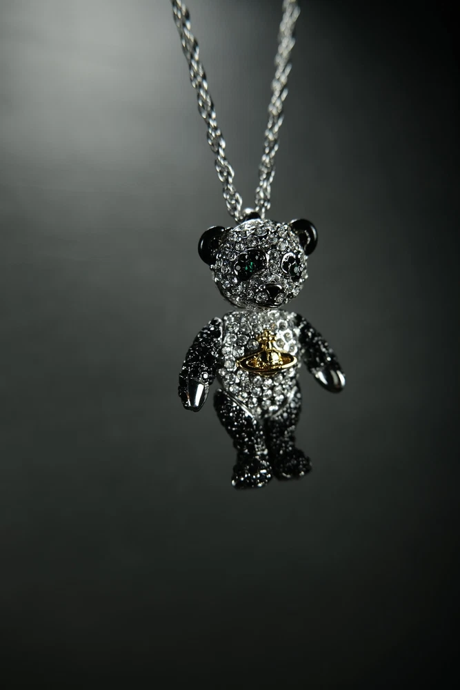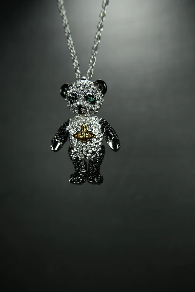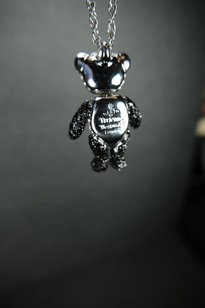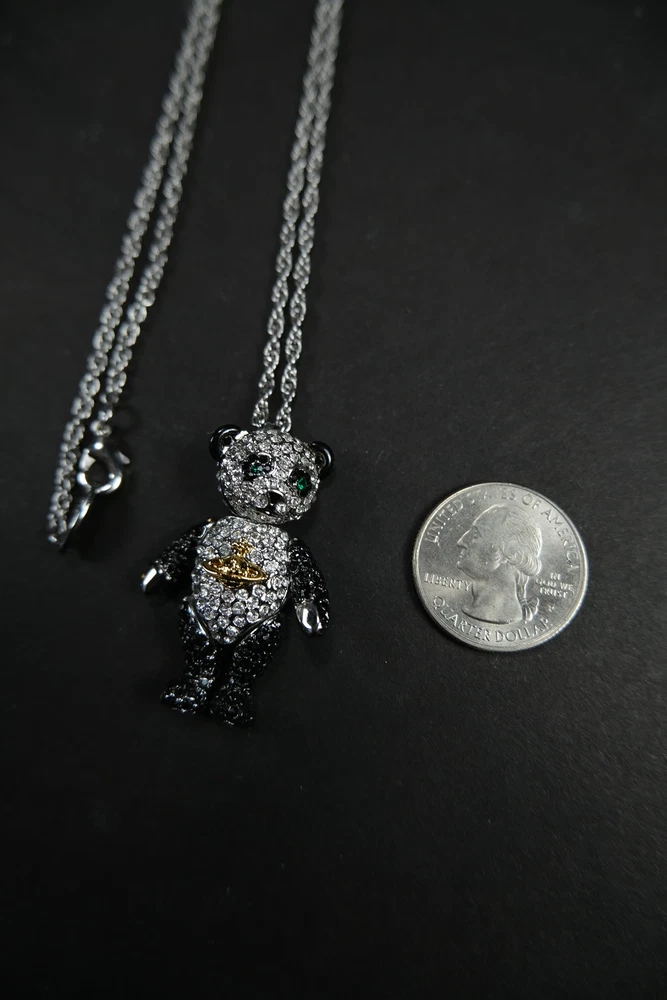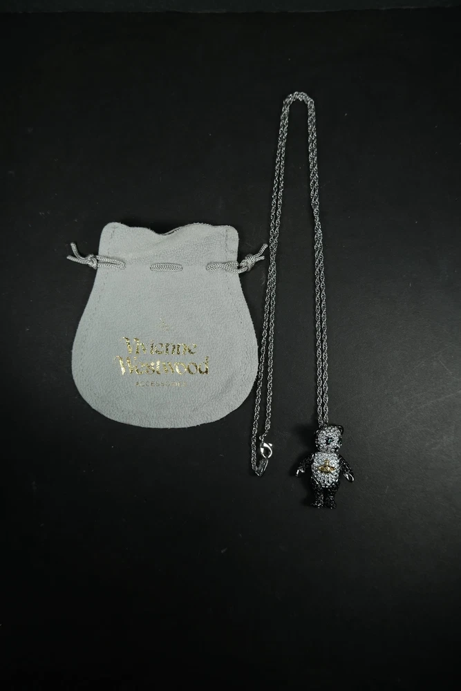 Step into luxury with this exceptional piece from Vivienne Westwood's iconic Bear series. First introduced in 2002, this pendant is from the coveted original launch, featuring distinctive characteristics that set it apart from later releases - notably larger diamond crystals and a uniquely articulated bear with more fluid limb movement. This charming piece perfectly showcases Dame Vivienne's ability to blend whimsy with haute couture. As part of the inaugural 2002 collection, it represents a significant moment in the Bear series' enduring legacy. Material: Stainless Steel Chain, Rhodium & brass body, Swarovski crystals embedded. Comes with original dust bag Condition: 10/10 (flawless condition, dust bag has slight wear) Measurements: Chain Length: 30.5 inches Pendant: 1.75H x 1W inches