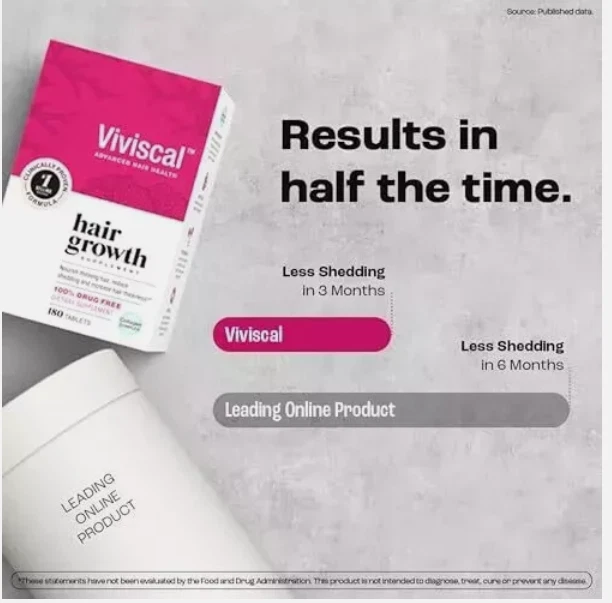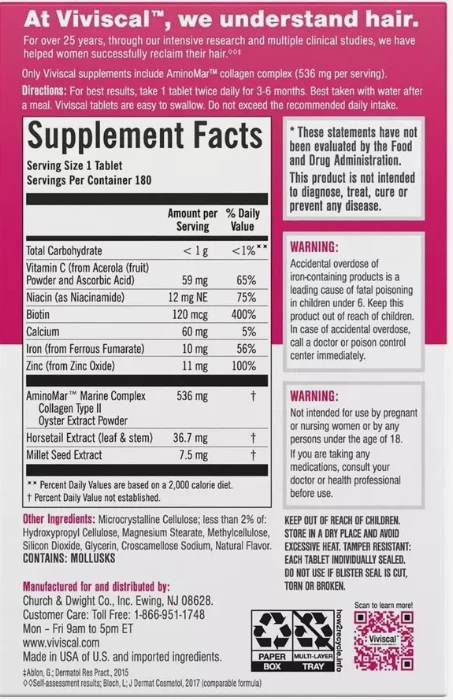 Item description from the seller: Viviscal Women's Hair Growth Dietary Supplement with Collagen Complex is a popular product designed to support healthy hair growth in women. Here are the key details: Key Features : Targeted for Women's Hair Health : Specifically formulated to help nourish thinning hair and promote healthy hair growth. Collagen Complex : Contains a marine complex (AminoMar C™) that is combined with Collagen and other nutrients. Collagen supports hair structure, which is key to promoting growth and strength. Vitamins & Minerals : The formula includes important nutrients such as: Biotin : Supports hair strength and helps prevent hair loss. Vitamin C : An antioxidant that supports collagen formation and overall hair health. Iron : Important for normal hair function and growth. Zinc : Supports hair regeneration and overall scalp health. Vitamin D : May support the growth of new hair follicles. Benefits: Promotes Hair Growth : Viviscal is known to be effective in supporting hair regrowth, especially for women with thinning hair due to hormonal changes, stress, or aging. Nourishes from Within : The supplement aims to nourish hair follicles from the inside out with essential nutrients. Fuller, Thicker Hair : Regular use may result in visibly thicker and healthier-looking hair. Dosage: Serving Size : 2 tablets daily. 180 Tablets : This bottle provides a 3-month supply (taking 2 tablets daily). Usage: For best results, Viviscal should be taken consistently for several months. Visible results typically appear after 3-6 months of regular use, although individual results can vary. Safety: No Artificial Colors or Preservatives . Suitable for women 18 years and older. It's generally well-tolerated, but individuals with allergies to fish or shellfish should avoid this supplement due to the marine ingredients. Other Considerations: Non-GMO, Gluten-Free : Viviscal is free from genetically modified organisms and gluten, making it suitable for people with dietary sensitivities. This supplement is often recommended for women experiencing hair thinning or loss, especially those seeking a non-invasive solution to promote hair growth.