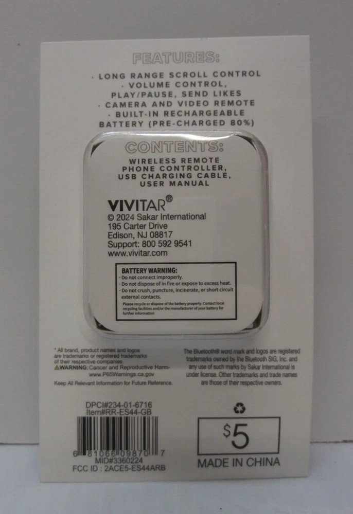 You are bidding on: Vivitar Wireless Remote Phone Controller - Bluetooth - Green/White - NEW Description Condition: new. This is a Vivitar Wireless Remote Phone Controller - Bluetooth - Green/White - NEW This Vivitar Wireless Remote Phone Controller is the perfect accessory for anyone who wants to take control of their phone's features. With Bluetooth connectivity, this controller allows you to easily connect to your phone and take advantage of its many features. The controller is lightweight and comes with a rechargeable battery, making it easy to use and transport. It also features play/pause control, volume control, and long-range scroll control, allowing you to customize your phone's settings to your liking. The Vivitar Wireless Remote Phone Controller is compatible with many brands and models, making it a versatile accessory for anyone who wants to take control of their phone. ***************************************************************************************************** PLEASE READ: I buy mostly estates, close outs, shelf pulls, and auction items. As the history of the item is not always known. I will describe all of my items listed to the best of my ability, if there are any flaws to the item it will be noted in the listing and photos of the flaw shown. At times I may miss a flaw, as I am only human. Please contact me and I will make it right and make sure that you are happy with you interaction and purchase from Big Man Tim. See photos for details and ask all questions before purchasing. "FREE SHIPPING" Thank you for shopping in my store. Check out the other items in my eBay Store! HAPPY BIDDING 122724/TM warehouse
