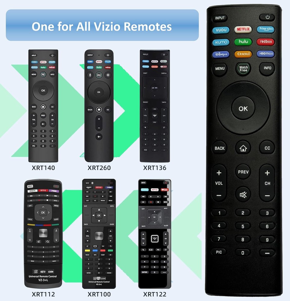 Universal Replacement for Vizio Smart TV Remote Control, Black Product Details Product Dimensions: 6.6 x 1.8 x 0.7 inches Item Weight: 2.08 ounces Manufacturer: ezControl Country of Origin: China Brand: ezControl Special Feature: Universal Color: Black Max Number of Supported Devices: 1 Compatible Devices: Television Replacement for all Vizio V/M/D/P/PX/E/OLED Series-LED/LCD/HD/4K/HDR/UHD Smart TVs No programming or pairing needed, just insert batteries and it will work (Battery Not included) Replacement for Vizio-Smart-TV-Remote XRT112, XRT122, VR1, VR2, VR4, VR10, VR15, VUR13, XRT010, XRT020, XRT134, XRT135, XRT136, XRT140, XRT260, XRT300, XRT301, XRT302, XRT303, XRT500, XRT510 and more..... The remote for Vizio TV was disigned 10 shortcut buttons for popular streaming channels - Netflix, Hulu, Redbox, HBOMAX, Prime video, Disney, VUDU, CRACKLE, XUMO, and Watch Free. Access to your favorite content as quick as you can at anytime The remote for Vizio TV which connected your device through infrared technology. All the buttons have been tested to support 10,000 clicks, and long distances transmitting(32ft), lightweight and ergonomic design, respond less than 0.5s to your tvs. This universal remote is a replacement for the Vizio Smart TV Remote and can control all functions of your Vizio TV. It is a new universal remote that is compatible with all Vizio Smart TV models, including D-Series, E-Series, M-Series, P-Series, and V-Series. The remote is not original, but it is fully functional, with all the buttons you need to control your TV.