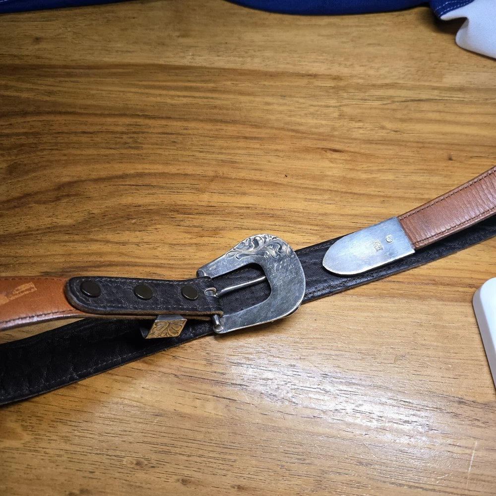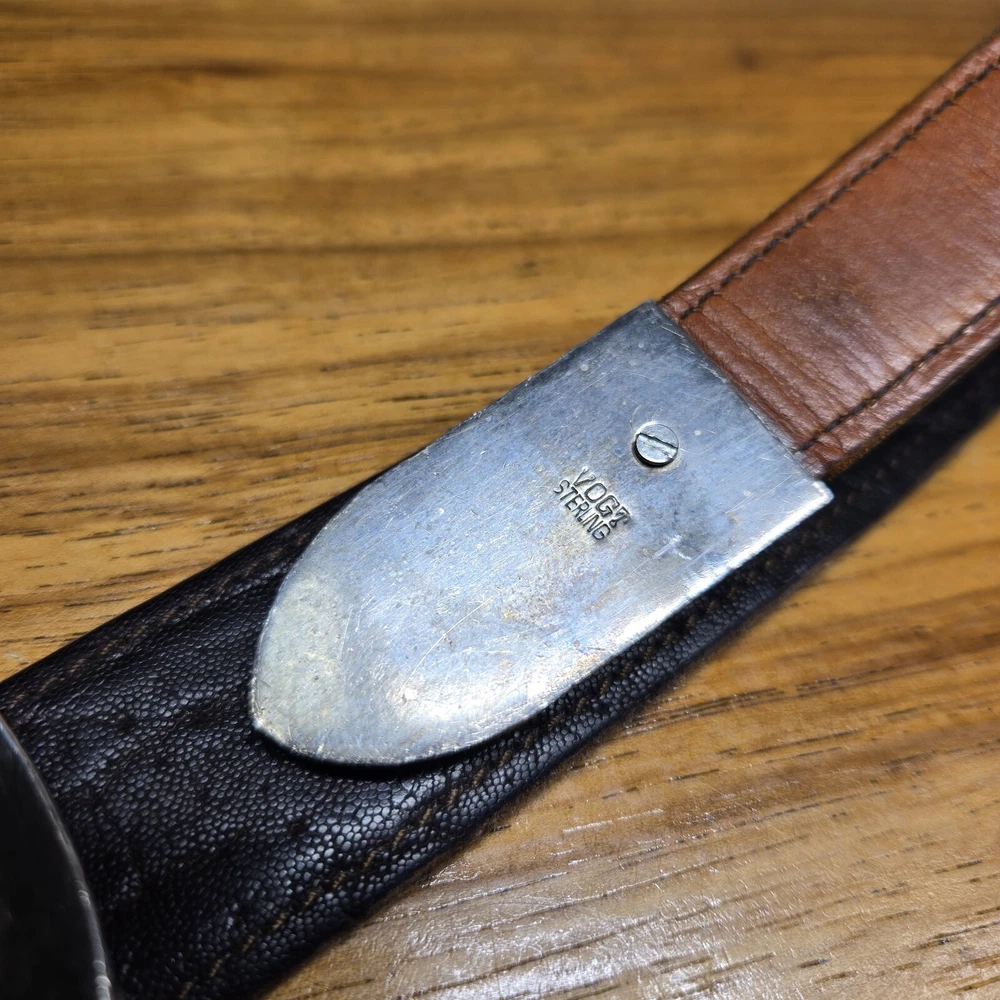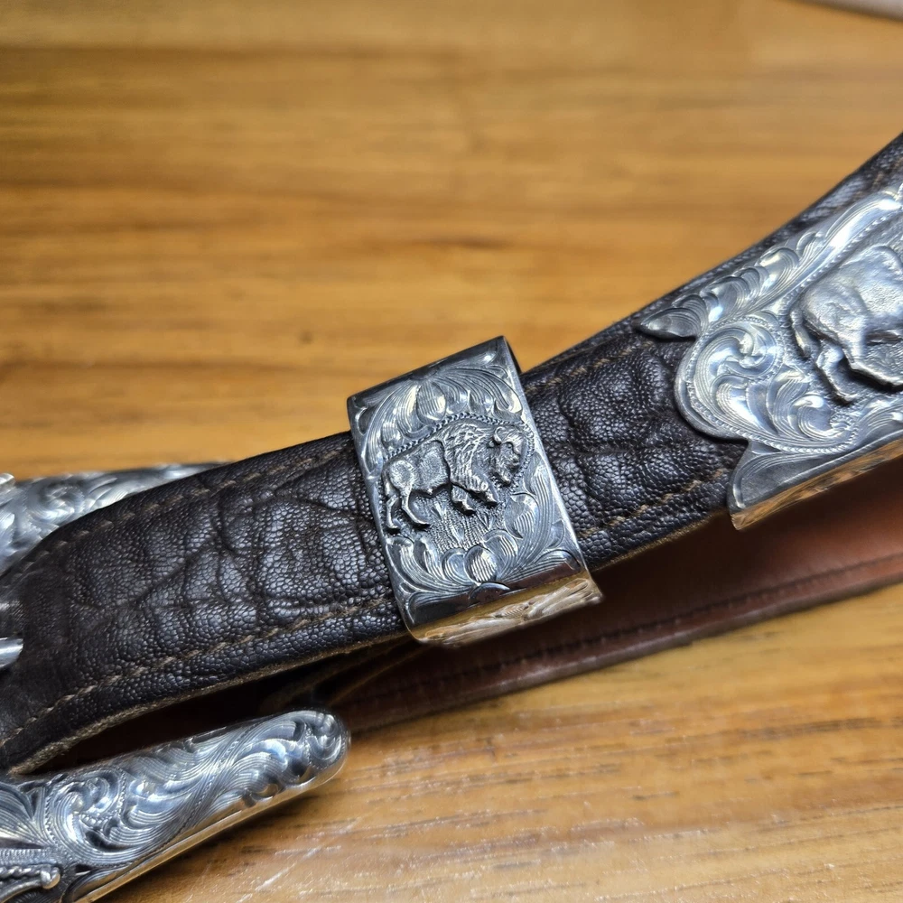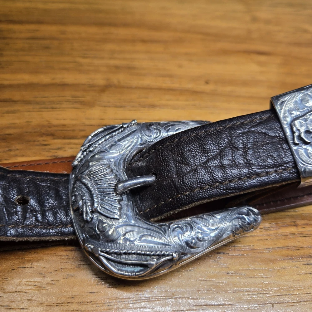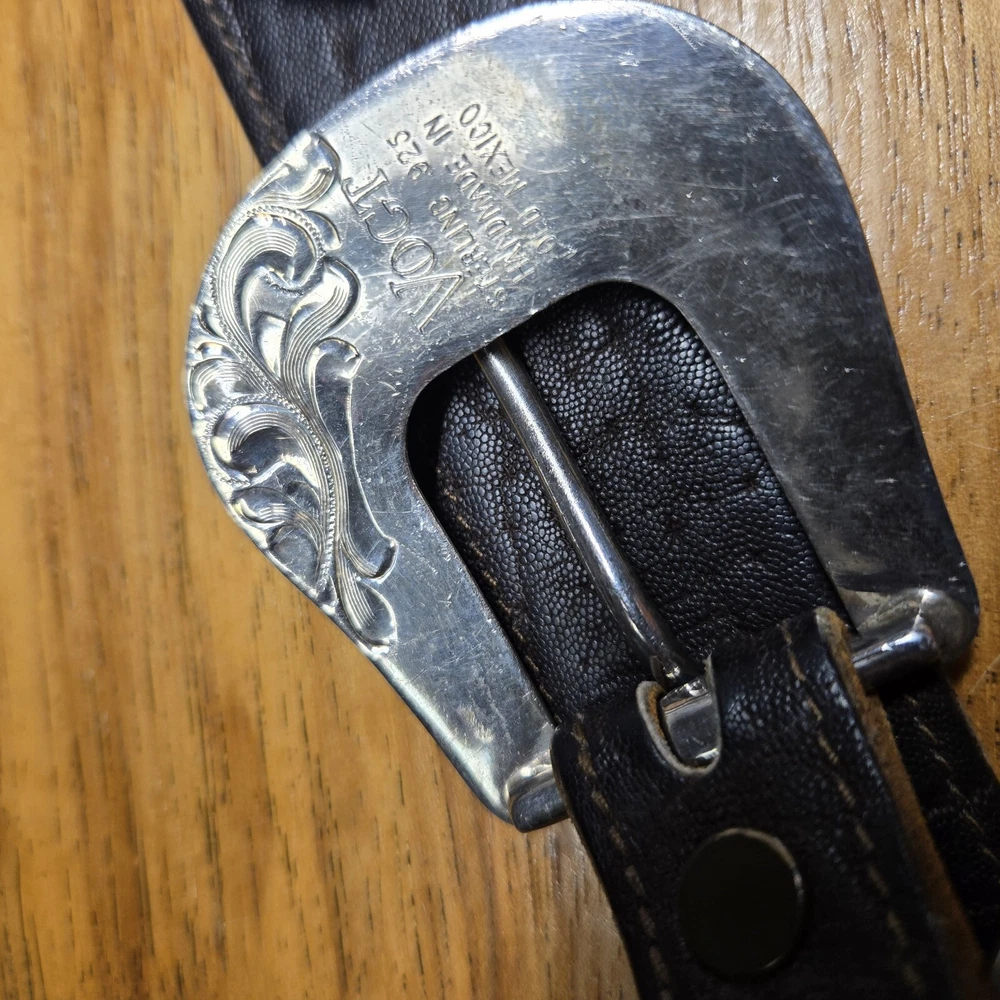 Add a touch of the wild west to your outfit with this Vogt Sterling "Yellowstone" Buckle and Hardware. The intricate design and high-quality materials make it a perfect addition to any antique collection. The buckle is made to fit a sz 38 Kemosabe Leather Belt, adding an extra layer of authenticity to this piece. Whether you're a collector or just looking for a unique accessory, this antique buckle is sure to impress.