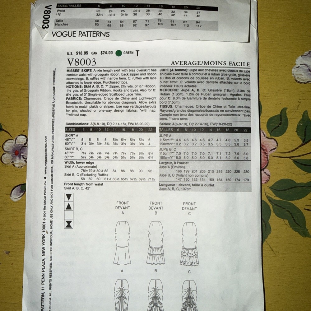 The Vogue Patterns V8003 sewing pattern is designed for Misses in sizes 6-10, offering a fitted mermaid skirt style. This pattern, from the trusted brand Vogue, allows for creating a stylish and tailored skirt with a flattering silhouette. Perfect for sewing enthusiasts looking to add a sophisticated and elegant piece to their wardrobe, this pattern includes instructions and measurements for a perfect fit.