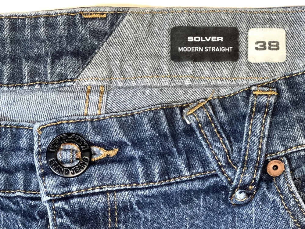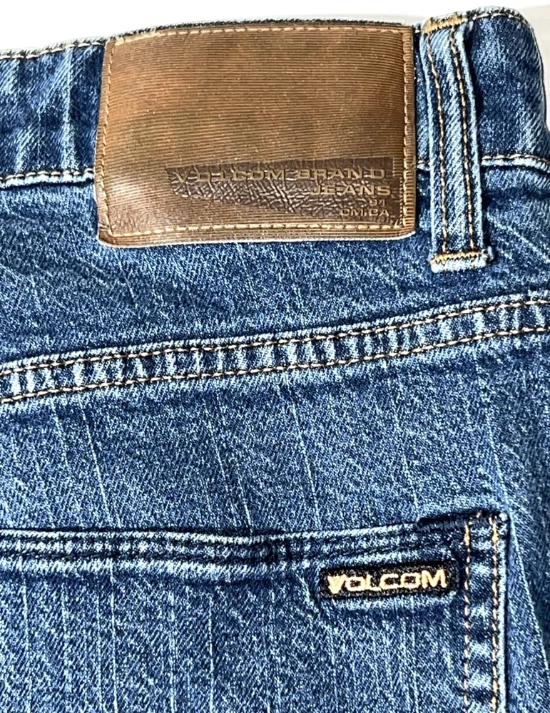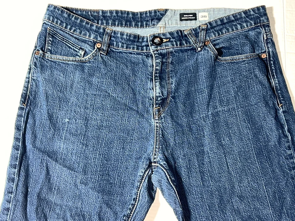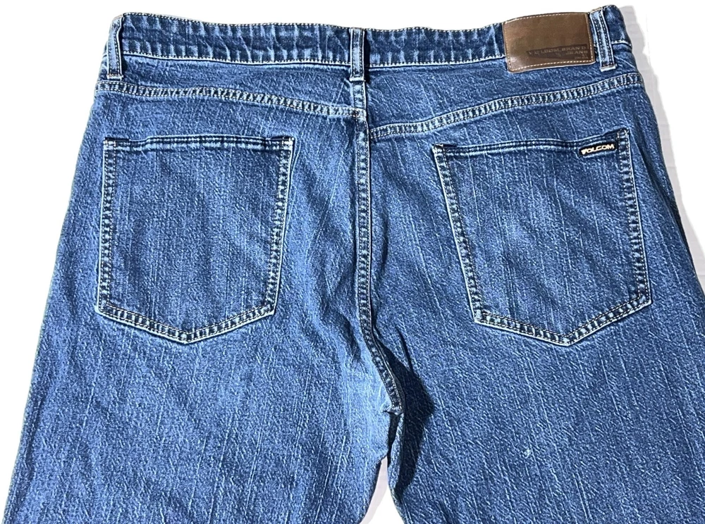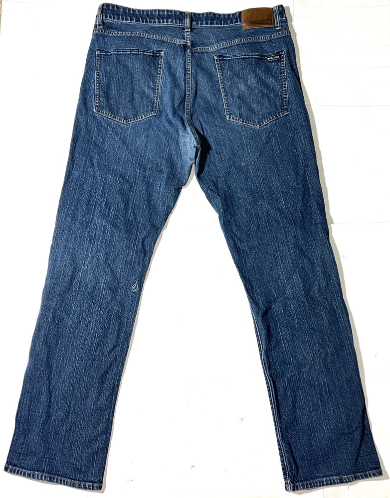 Volcom Solver Modern Straight Stretch Denim Navy Blue Jeans Pants ~ Men's Size 38. Measures: 18.5" flat across the front of the waist unstretched, 11" rise, 31.5" inseam, and 41.5" long from waist to bottom hem.