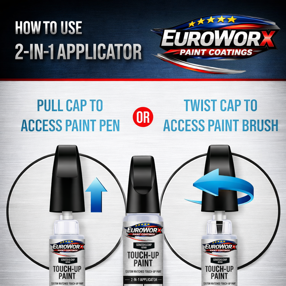 Volkswagen Professional Touch Up Paint Pen + Brush – Choose Color Restore chips, scratches, and minor paint damage with Euroworx Paint Coatings professional-grade touch up paint pens. Each paint pen is custom mixed to your selected factory color code and designed for precise, easy application—perfect for both small details and larger touch-up areas. 2-in-1 Pen + Brush Applicator Our touch up paint pen features a dual-ended 2-in-1 applicator: Fine tip pen nib for precision detail work, stone chips, and tight areas Wide stroke brush for larger chips, scratches, and blended repairs How to use: Pull the cap to access the precision paint pen Twist the cap to access the built-in paint brush This design gives you maximum control and flexibility in one convenient applicator. What You'll Receive Choose the kit that best fits your repair needs: Paint Pen Starter Kit: Paint Pen + Clearcoat Pen Complete Kit: Primer Pen + Paint Pen + Clearcoat Pen Product Features OEM-matched, blend-ready color formulas Professional automotive-grade coatings Suitable for DIY users and professionals Proudly made in the USA Blendable Color Match Guarantee For vehicles 2012 and newer, our paint is formulated to provide a blendable OEM-matched color when applied correctly. Note: Color blending and application technique play a critical role in final appearance. Color Selection Please select your paint code and color name from the dropdown menu. Paint code information can typically be found on your vehicle's: Door jamb Under the hood Owner's manual If you're unsure of your paint code, contact your local dealership with VIN and feel free to message us before ordering. Shipping Free domestic shipping Orders are mixed and prepared to order Handling time: as shown in the listing Returns, Guarantee & Liability Policy Due to the custom nature of mixed paint: Returns are accepted for approved color match issues Any concerns must be reported within 30 days of delivery Please verify your paint code before ordering Liability Notice Euroworx Paint Coatings' total liability for any claim, loss, or damage arising from the use of our products shall not exceed the original purchase price of the product. This includes, but is not limited to, incidental or consequential damages such as spills, overspray, or damage to personal property, vehicles, clothing, or household items. Payment We accept secure payments through eBay's managed checkout system. About Euroworx Paint Coatings Euroworx Paint Coatings specializes in high-quality automotive and industrial paint solutions. Our products are designed for accuracy, reliability, and ease of use delivering professional results you can trust.