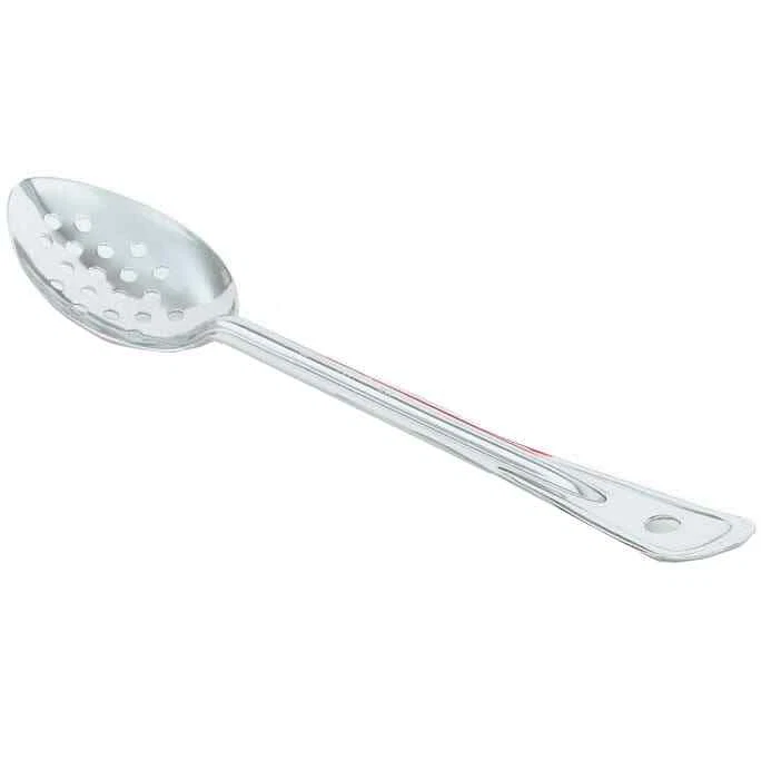 This perforated stainless steel serving spoon is made of heavy duty 18 gauge stainless steel with a deep grooved handle for added strength. The perforations allow liquids to drain from the serving spoon. Model #: 46975 Perforated Handle is deep grooved for strength The Warranty Does Not Apply To Products Purchased For Personal Family Or Household Use "