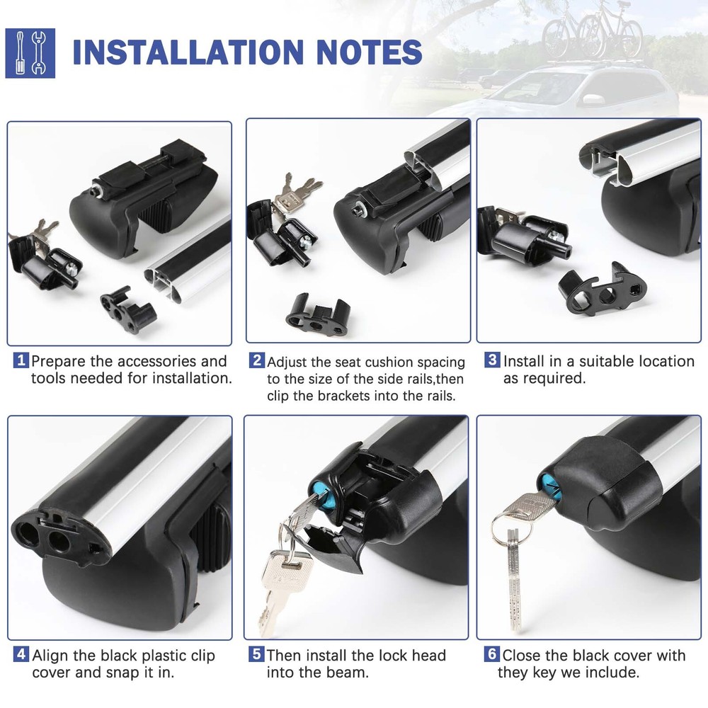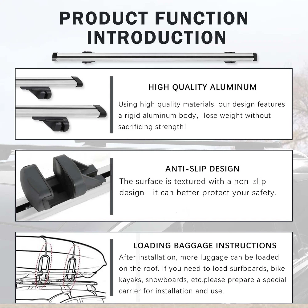53" Roof Rack Crossbars Luggage Cargo Carriers w/Key For Volvo XC70 XC90 03-2022 Specification Color: Silver Material: High Quality Aluminum Alloy Load Capacity: 150 lbs Fitting Clamps Inner Width: Max 6cm / 2.4inch Rod Size: 135cm / 53inch Feature High Quality Aluminum Construction: Our design features a rigid aluminum body that cuts down on weight without sacrificing strength 150 LBS Load Capacity: Whether it’s a kayak, mountain bike, or skis, these cross bars will get your favorite toys to where the fun happens Safe And Secure: A heavy duty clamping mechanism ensures the cross bars will remain firmly fastened to the existing side rails, and the keyed locking mechanism will make sure they stay put Easy to Install on Vehicle: Mount to Vehicles Existing Raised Side Rails and has spacer between the rack and roof Package Included 1 Pair Roof Rack Cross Bars 2 x Keys 1 Set of Accessories •We accepted PayPal payment ONLY •We will ship your order within 24 hours after receiving your verified payment (Excluding Weekends and Public Holidays) •The estimated delivery time is within 3-7 working days(not including the weekend). •United States:3-5 working days(not including the weekend) •If you fail to receive over 7 days, please contact us and we will try our best to help •Return items must not be used or have any sign of abuse or intentional damage. •Buyer is responsible for all return shipping charges. •We reserve the right not to refund S&H when the item has been posted. We are a company run business with more than 10 years experience in whole sale of quality Motorcycle And Car Parts & Accessories Specification Color: Silver Material: High Quality Aluminum Alloy Load Capacity: 150 lbs Fitting Clamps Inner Width: Max 6cm / 2.4inch Rod Size: 135cm / 53inch Feature High Quality Aluminum Construction: Our design features a rigid aluminum body that cuts down on weight without sacrificing strength 150 LBS Load Capacity: Whether it’s a kayak, mountain bike, or skis, these cross bars will get your favorite toys to where the fun happens Safe And Secure: A heavy duty clamping mechanism ensures the cross bars will remain firmly fastened to the existing side rails, and the keyed locking mechanism will make sure they stay put Easy to Install on Vehicle: Mount to Vehicles Existing Raised Side Rails and has spacer between the rack and roof Package Included 1 Pair Roof Rack Cross Bars 2 x Keys 1 Set of Accessories PAYMENT •We accepted PayPal payment ONLY SHIPPING •We will ship your order within 24 hours after receiving your verified payment (Excluding Weekends and Public Holidays) •The estimated delivery time is within 3-7 working days(not including the weekend). •United States:3-5 working days(not including the weekend) •If you fail to receive over 7 days, please contact us and we will try our best to help Terms of Sale •Return items must not be used or have any sign of abuse or intentional damage. •Buyer is responsible for all return shipping charges. •We reserve the right not to refund S&H when the item has been posted. ABOUT US We are a company run business with more than 10 years experience in whole sale of quality Motorcycle And Car Parts & Accessories On Apr 9, 2025 at 18:05:01 PDT, seller added the following information: