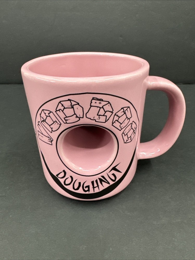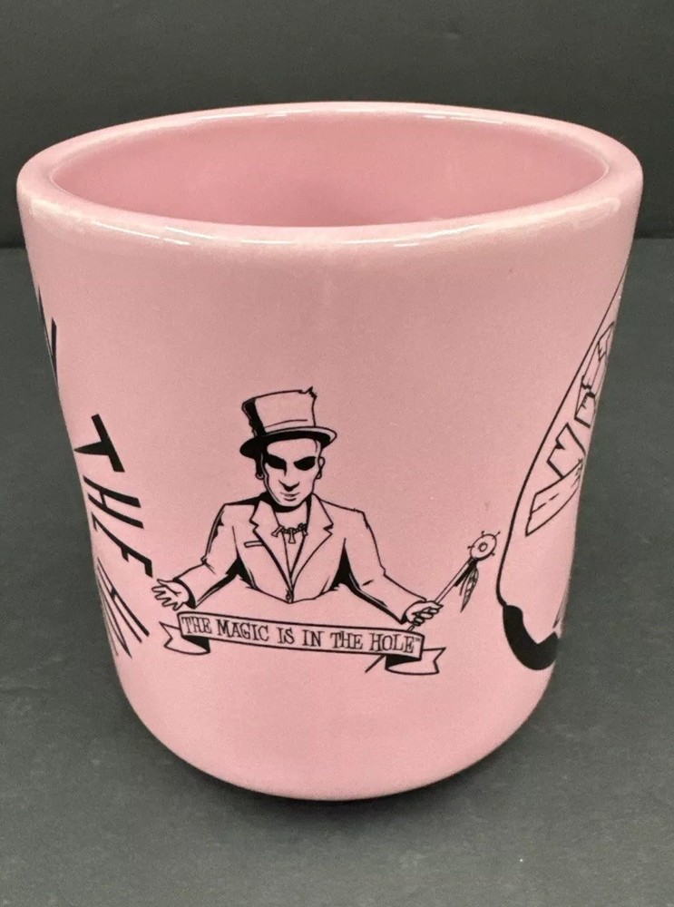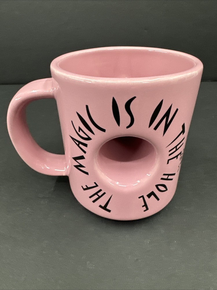 Enjoy your hot or cold beverage in style with this pink ceramic coffee mug featuring the magic hole character from Voodoo Doughnuts Portland OR. The mug is perfect for all occasions and comes with a solid color pattern. It is an original piece and not a licensed reproduction. The mug is made of high-quality ceramic and porcelain material and has a unique American style. The magic theme adds a touch of fun to your day. The mug is perfect for collectors and can be added to your collection of mugs, dinnerware, and serveware. It is a must-have for any Voodoo Doughnuts fan.