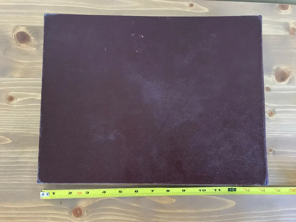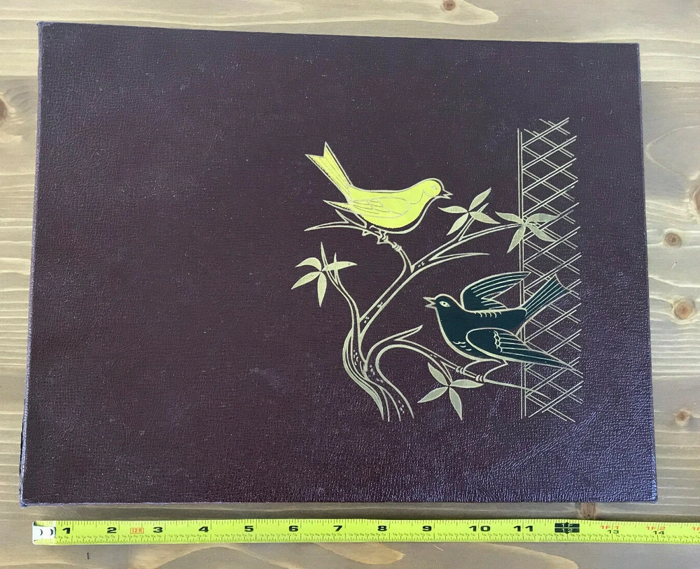 Vintage scrapbook from the 1960s has burgundy faux leather cover with bird design on the front. Pre-owned: has handwritten message inside front cover, photo corners and/or handwriting on 16 pages, and 2 old photos. There are 21 unused pages. This is a 2-post album, pages can be removed if desired. Cover measures 13 1/2" x 10 1/4", pages are 13" x 10". The pictures show the actual item that you will receive. Ships from Alberta, Canada. Tax applies to purchases.