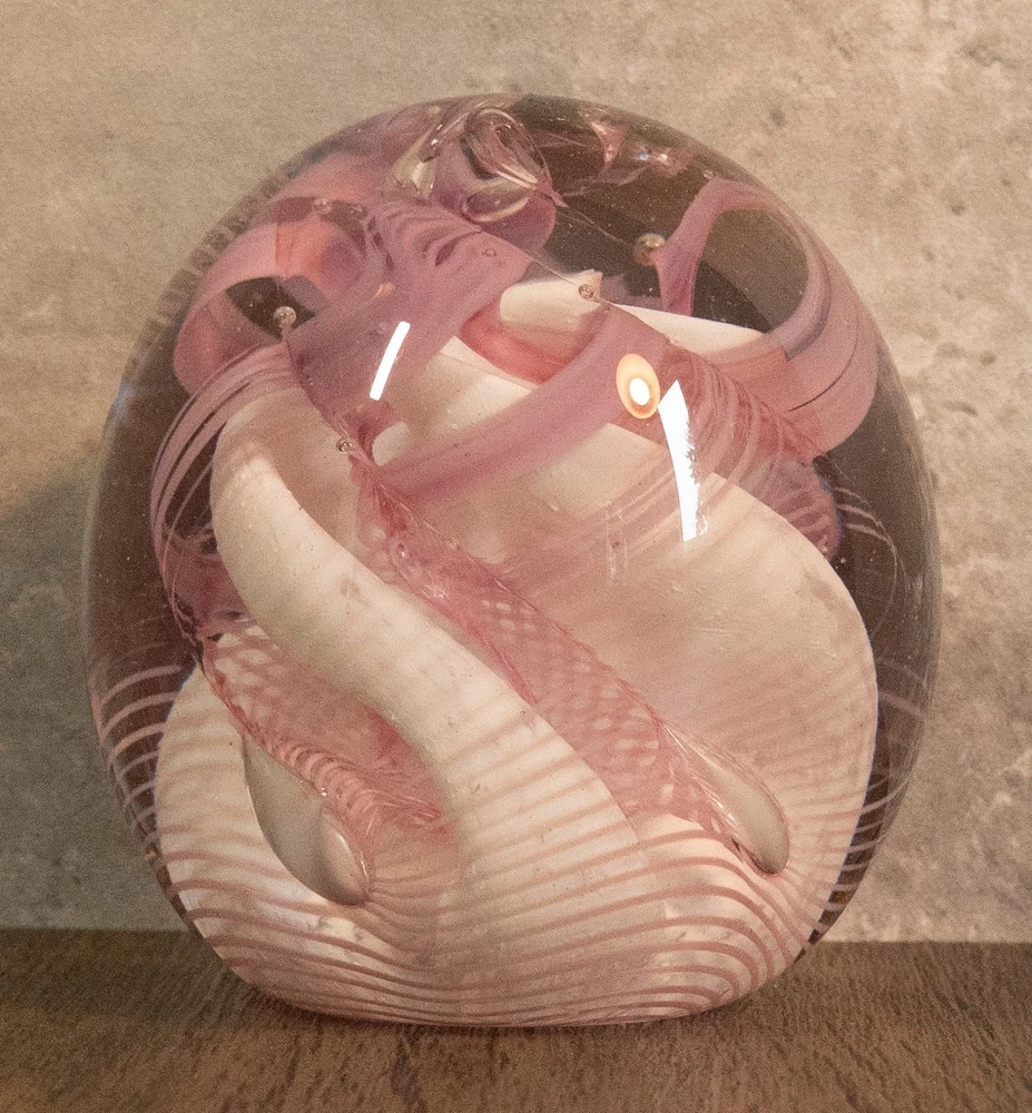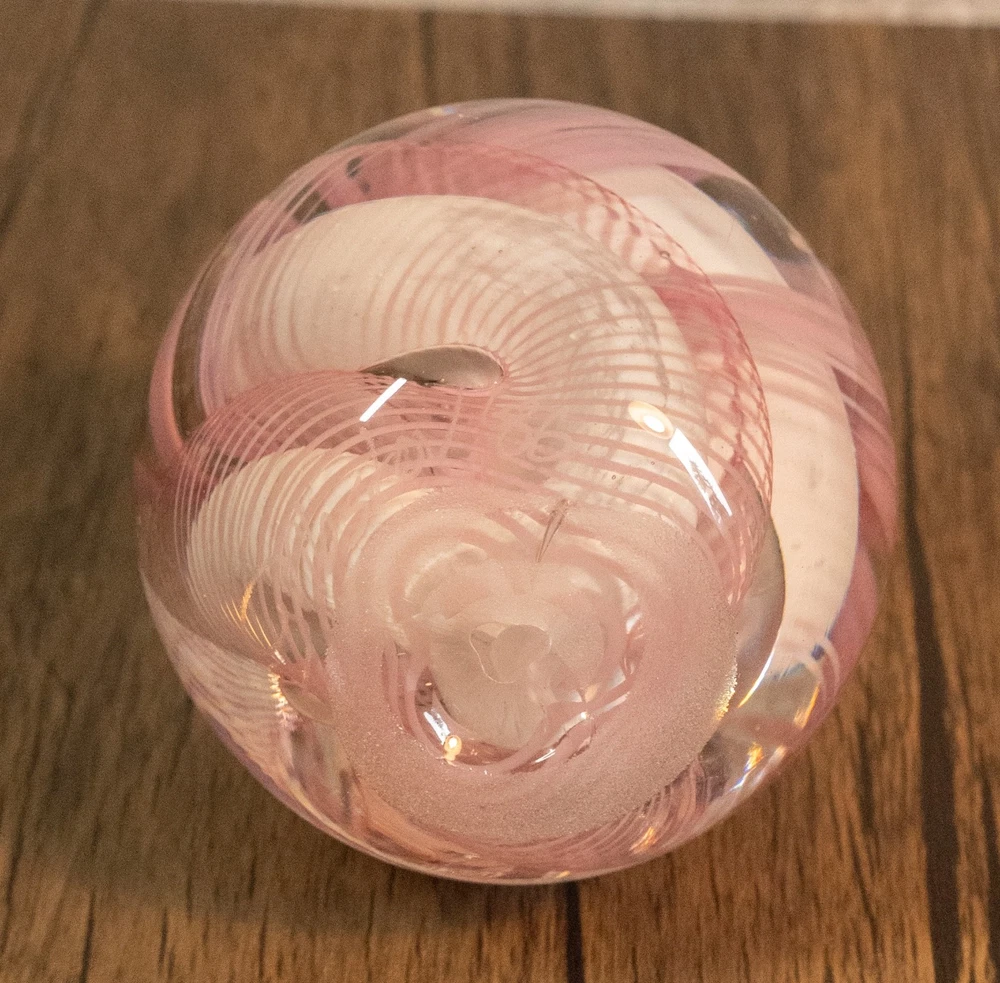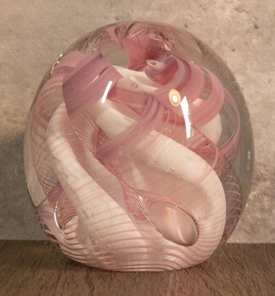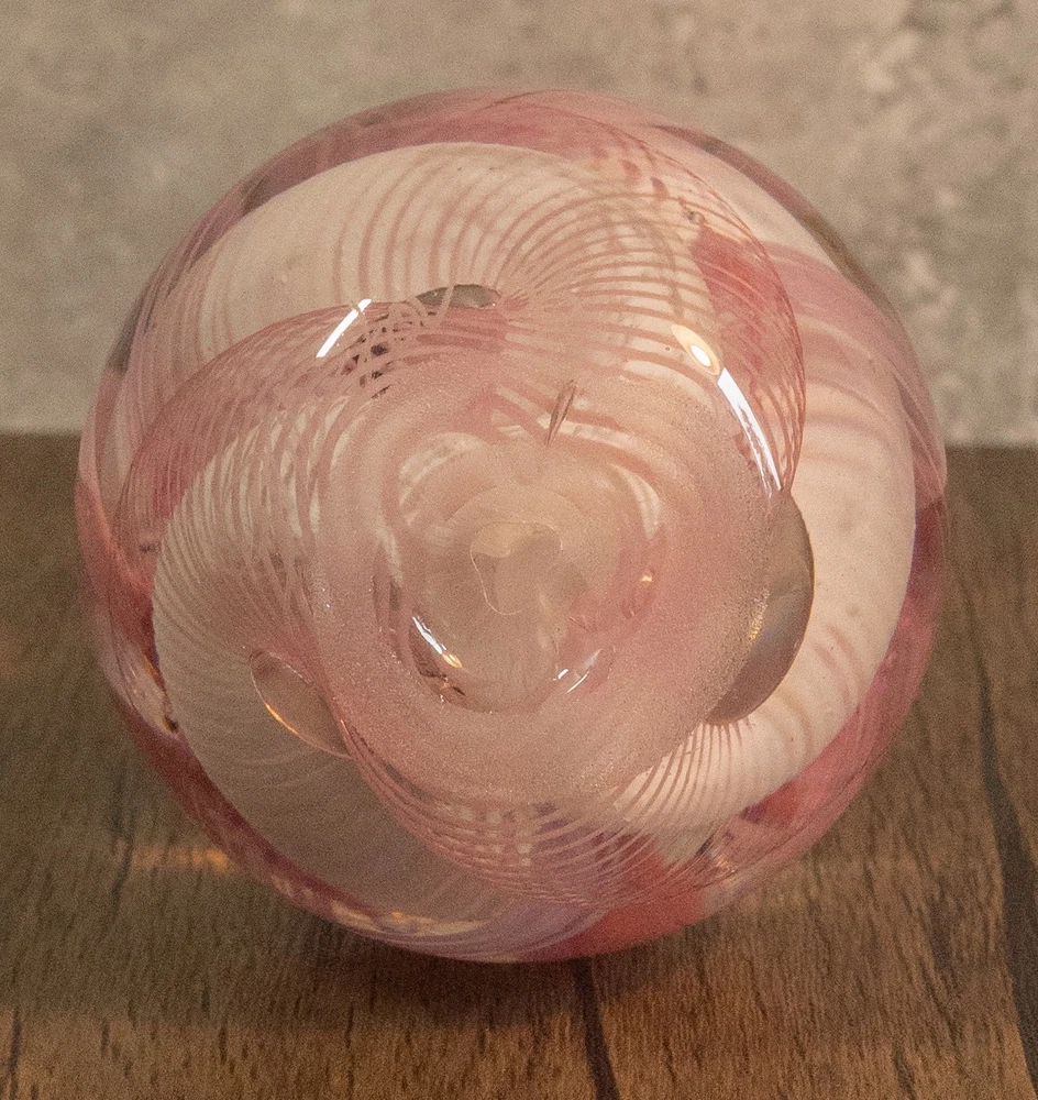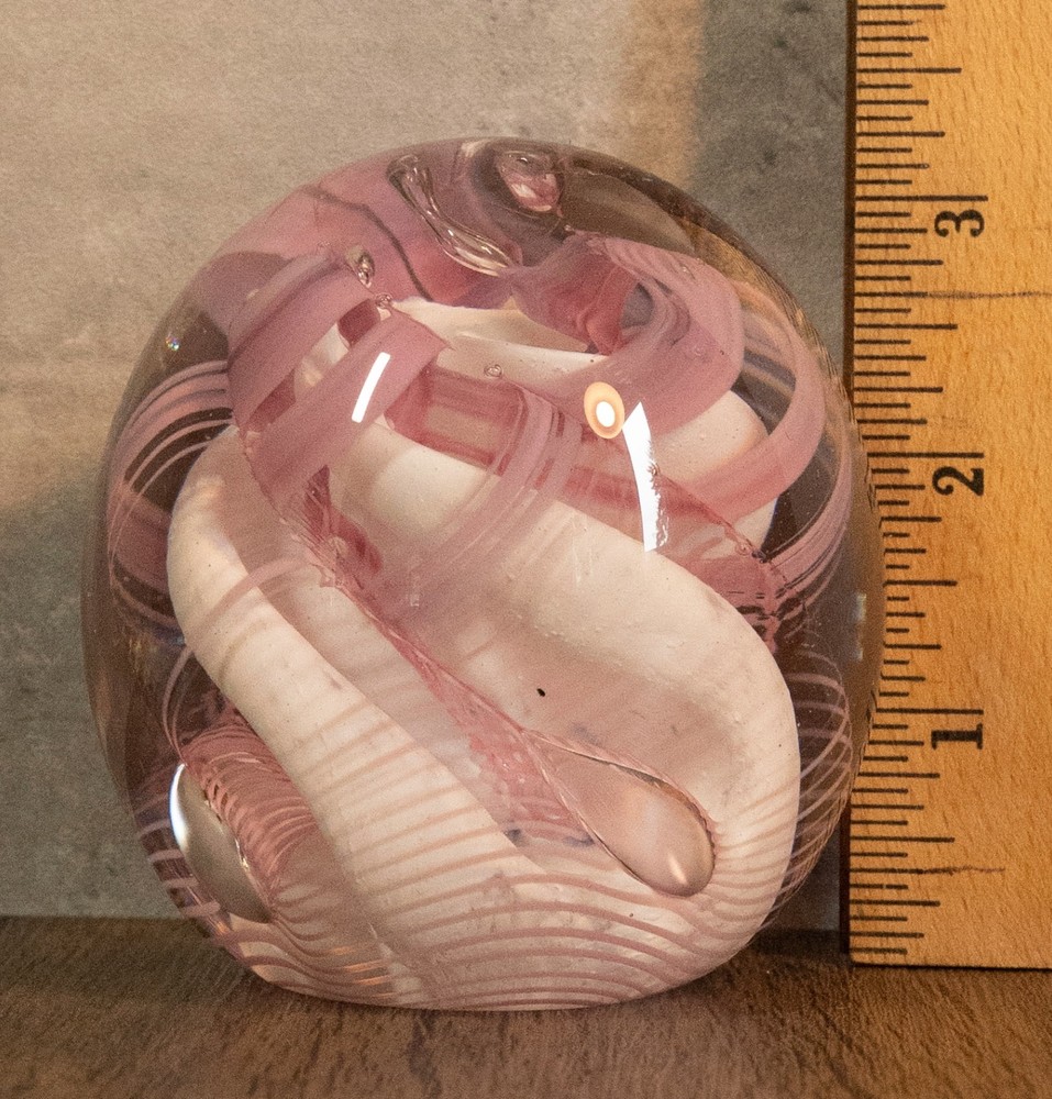 Vtg 1986 Gibson Glass Pink White Free Form Lace Controlled Bubble Paperweight Beautiful paperweight to ass to your collection or to start one . Looks like lace and controlled bubbles . Weight is in perfect condition . Please note the signature was filled with pencil so it could be read easier but has been cleaned off . I will pack with care and get it to you ASAP Thanks for looking !