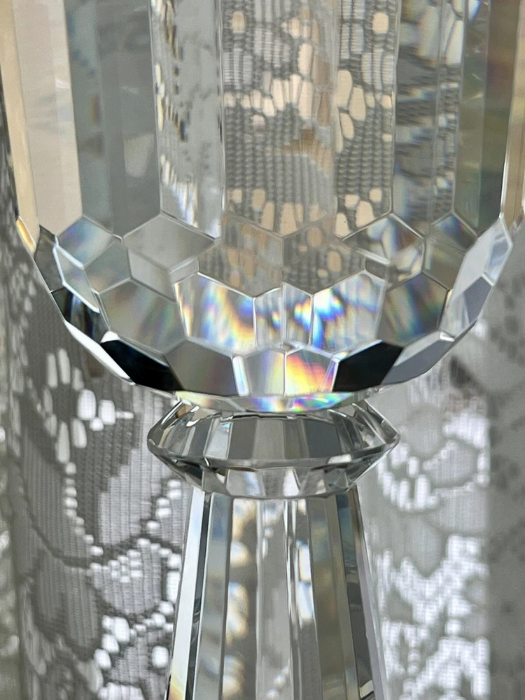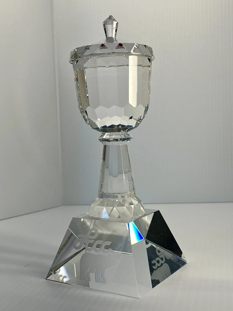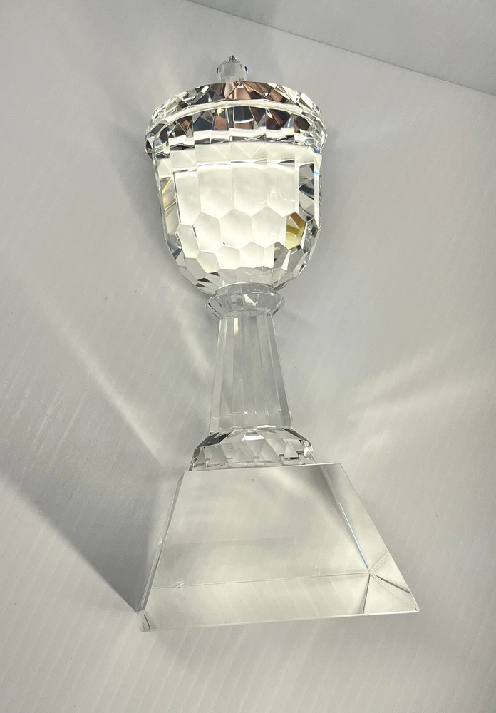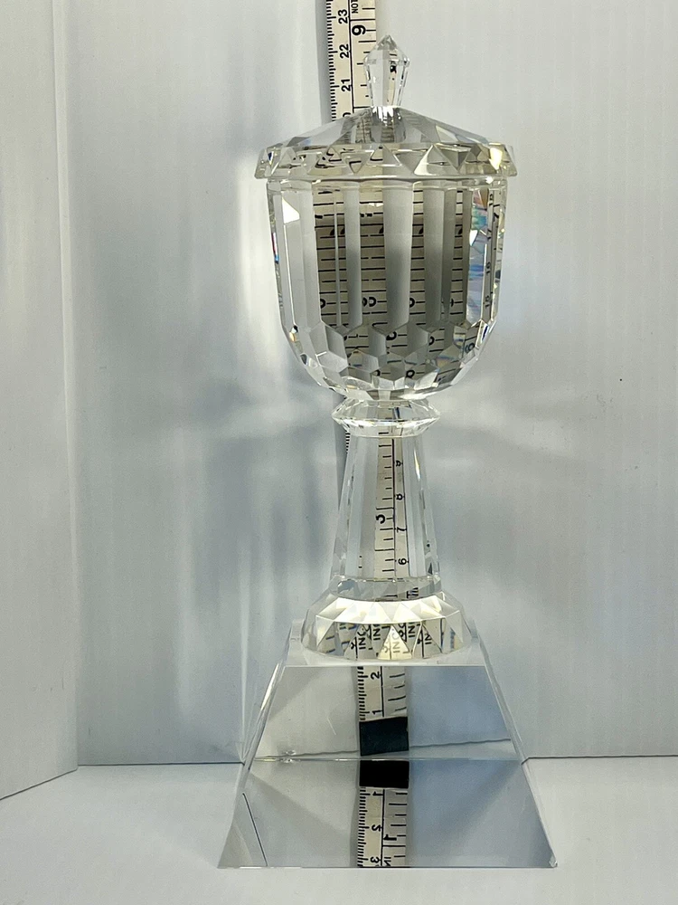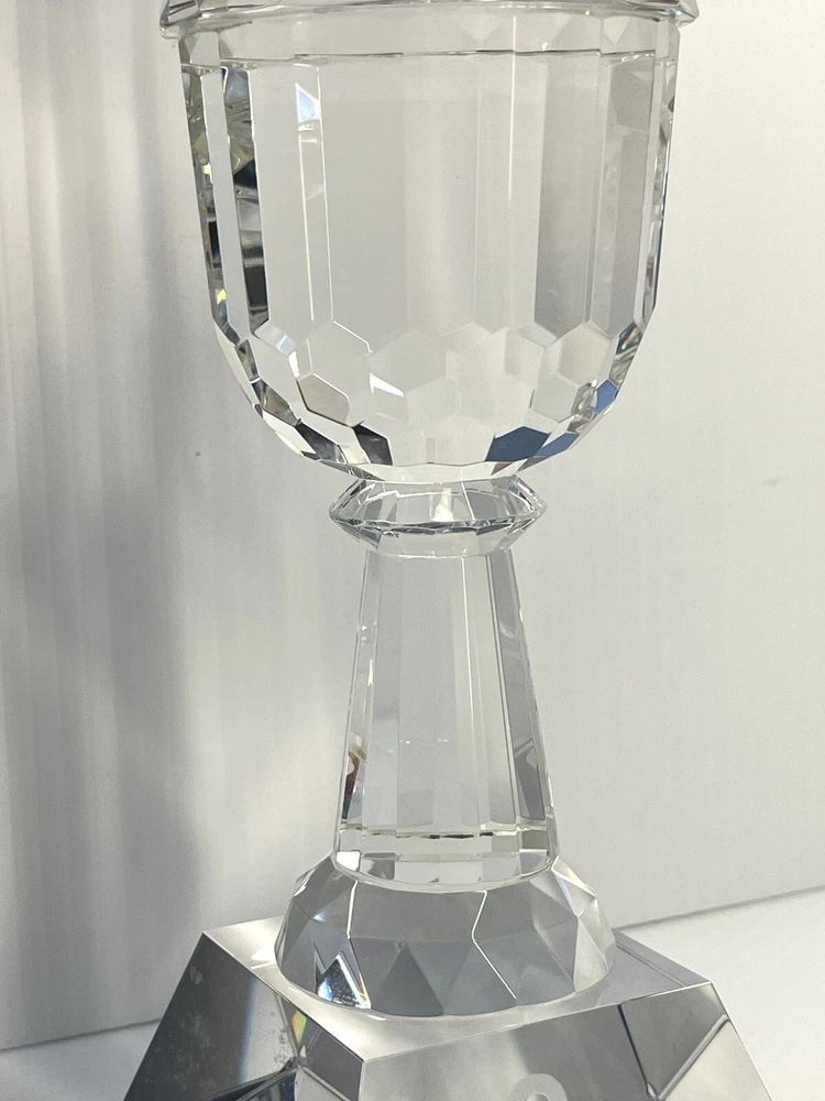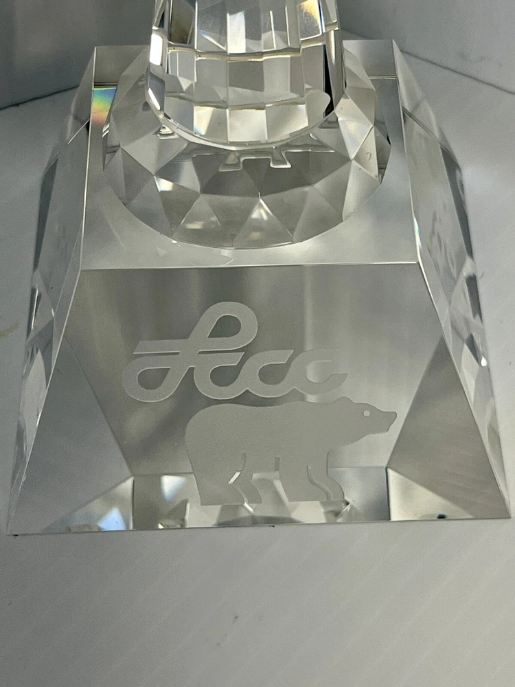 Vintage 24% lead Cut Crystal Iridescent pillar style trophy cup award paperweight Weight 2lbs 1oz - 9 inches tall - 4x4” base Etching in the base is a Bear/Polar Bear figure and the text “LCCC” referencing *Lorain County Community College* (located in Ohio) NOTE* Has two (2) very tiny chips / one is on edge of base. The second is the very tip of the finial * see photos Late 90s~ early 2Ks By Anson - No back stamp - No Box Vintage Estate display Thank you