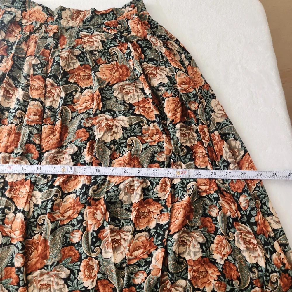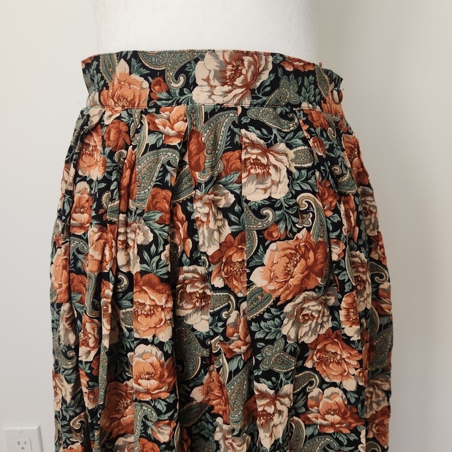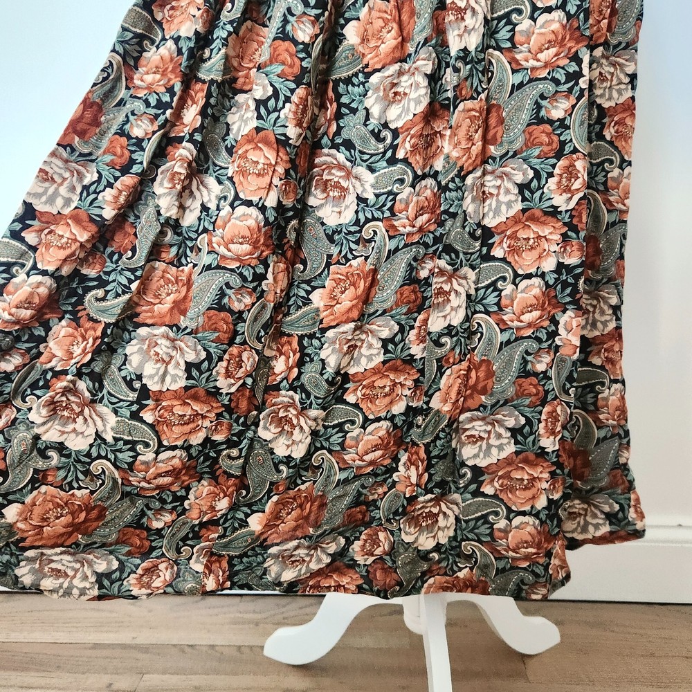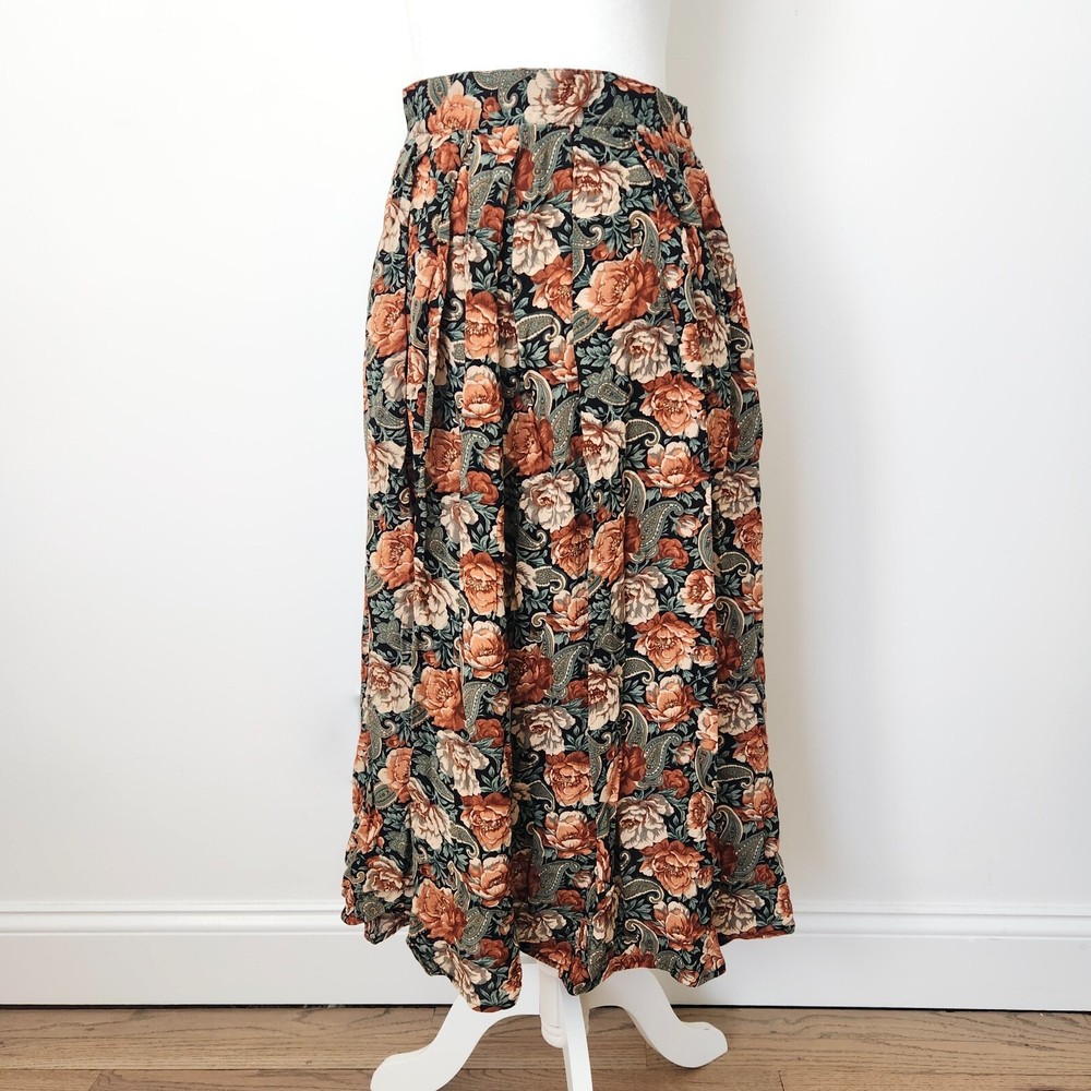 Vtg 90s Floral Maxi Skirt Sz 12 Boho Black Multi Whimsigoth Cottagecore Paisley Vintage floral maxi skirt by Michelle Stuart in women's size 12. - Whimisical floral + paisley pattern in black, dark green, and orange - Flowy A-line silhouette and maxi length - Fabric button closure on side - No material tag, feels like a rayon/cotton blend - From the 90s. Minor wear, overall good vintage condition! Perfect for whimsigoth, cottagecore, boho, or dark fairy aesthetics! lay flat measurements: waist: 13.5" • hips: 29" • length: 30.5" made in USA