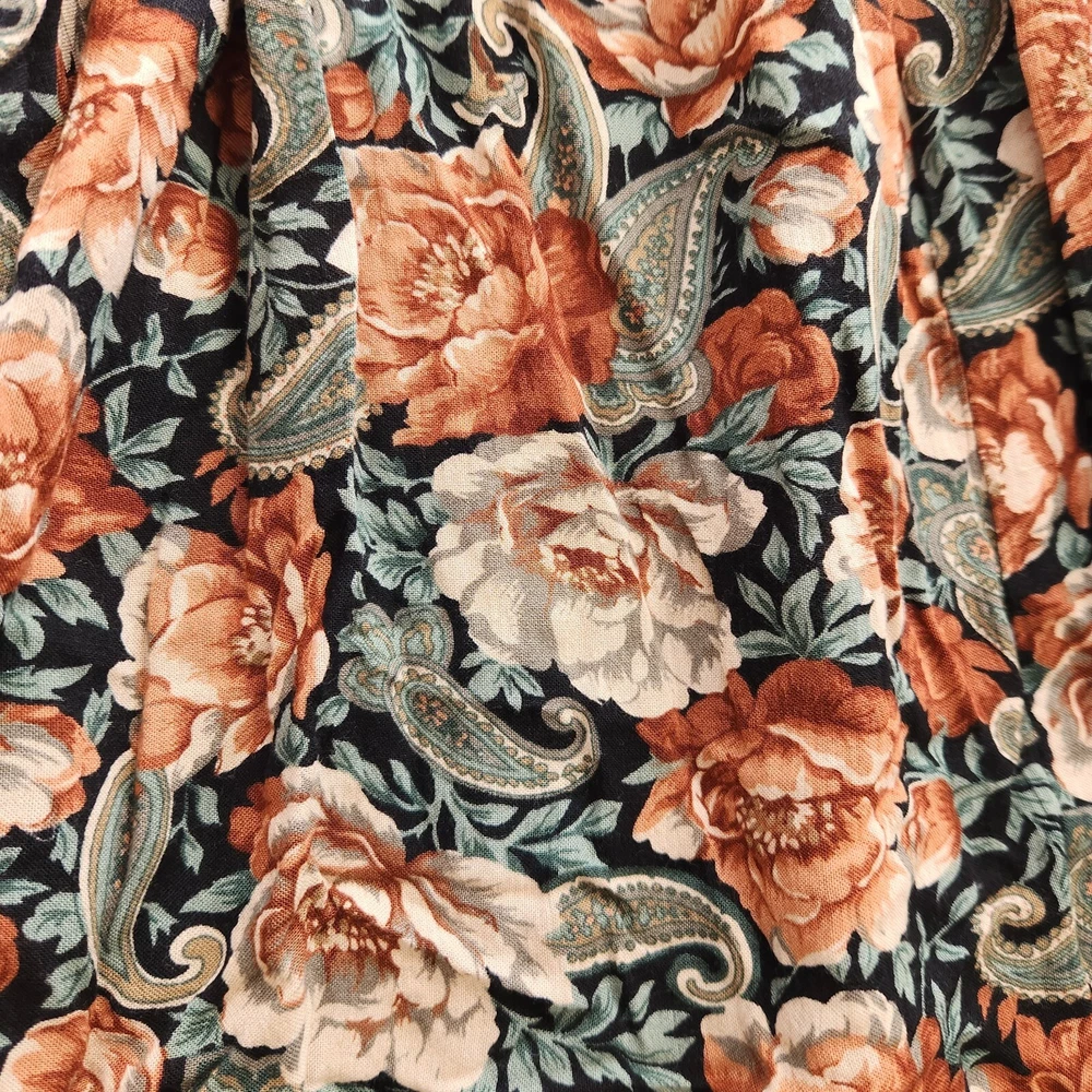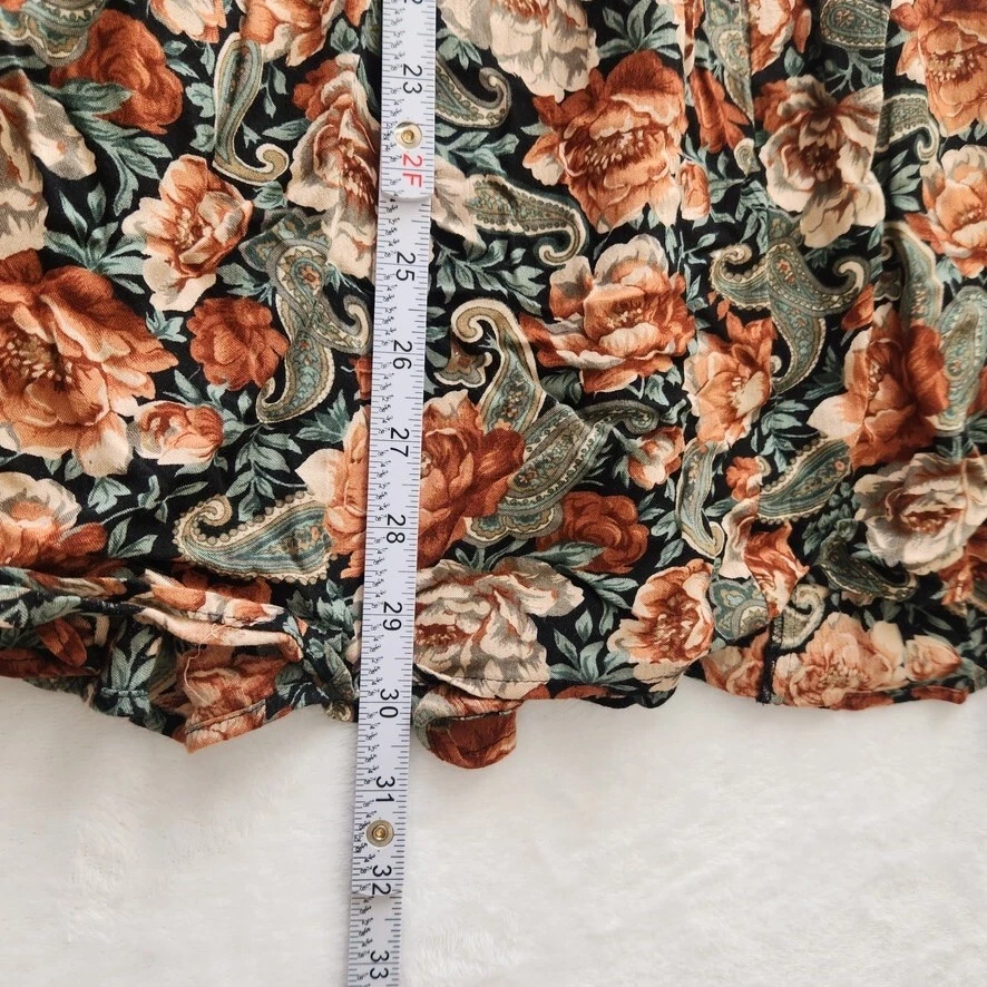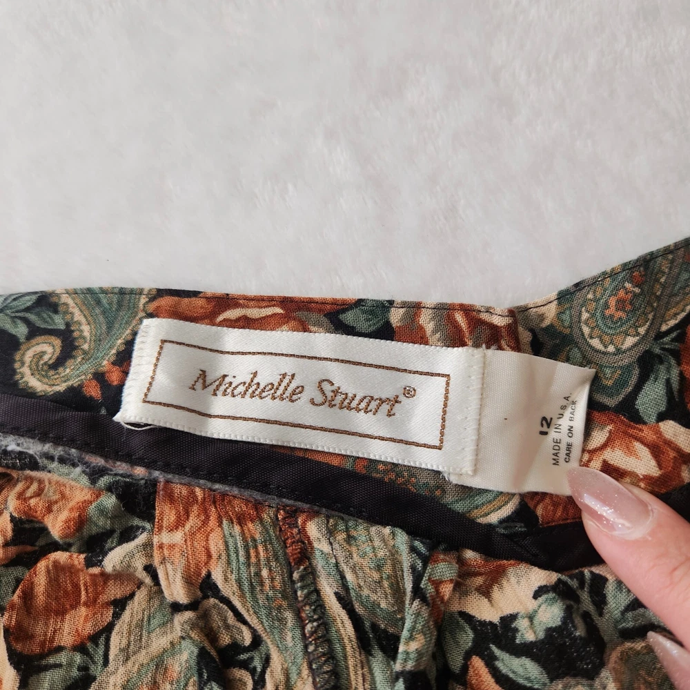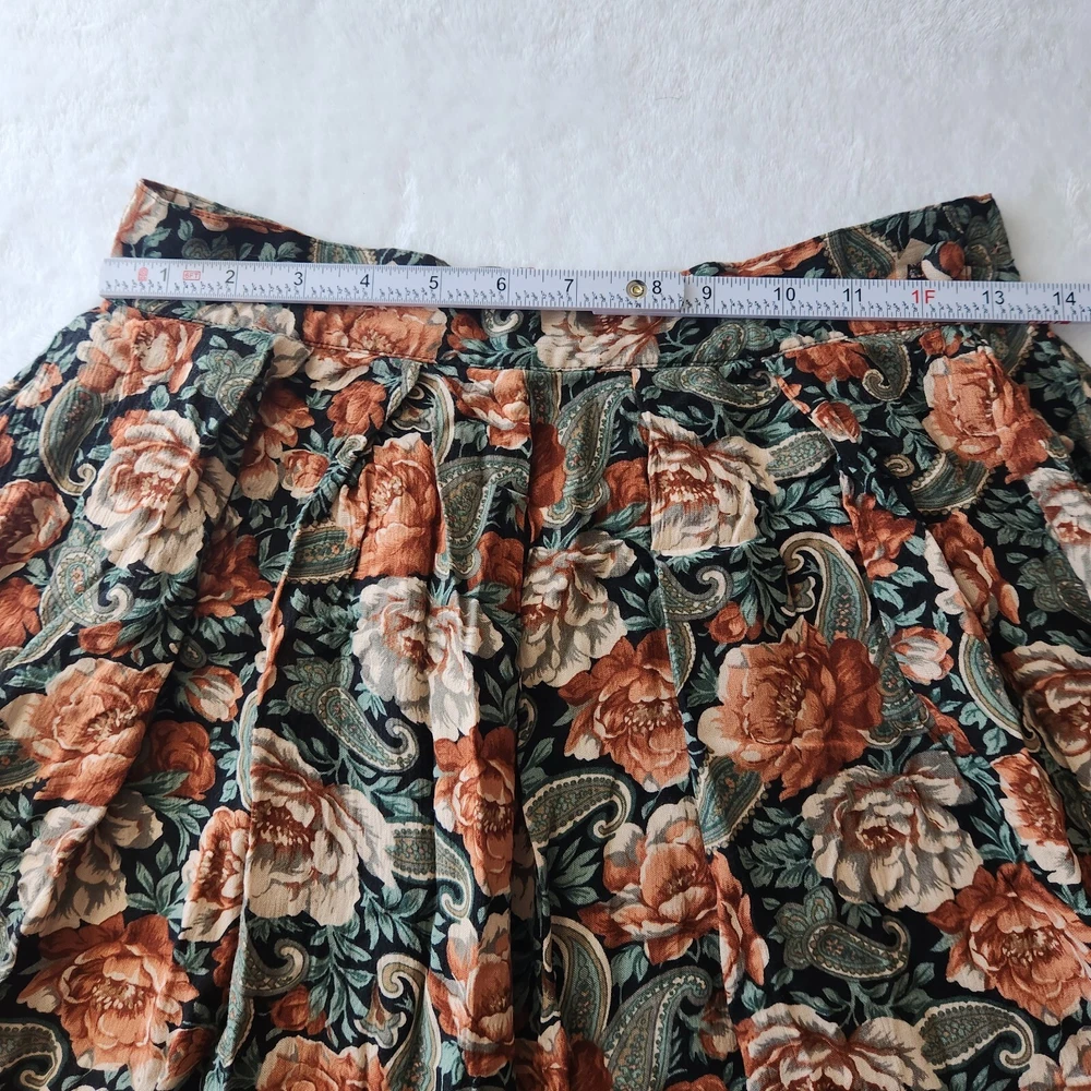 Vtg 90s Floral Maxi Skirt Sz 12 Boho Black Multi Whimsigoth Cottagecore Paisley Vintage floral maxi skirt by Michelle Stuart in women's size 12. - Whimisical floral + paisley pattern in black, dark green, and orange - Flowy A-line silhouette and maxi length - Fabric button closure on side - No material tag, feels like a rayon/cotton blend - From the 90s. Minor wear, overall good vintage condition! Perfect for whimsigoth, cottagecore, boho, or dark fairy aesthetics! lay flat measurements: waist: 13.5" • hips: 29" • length: 30.5" made in USA