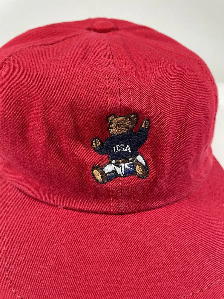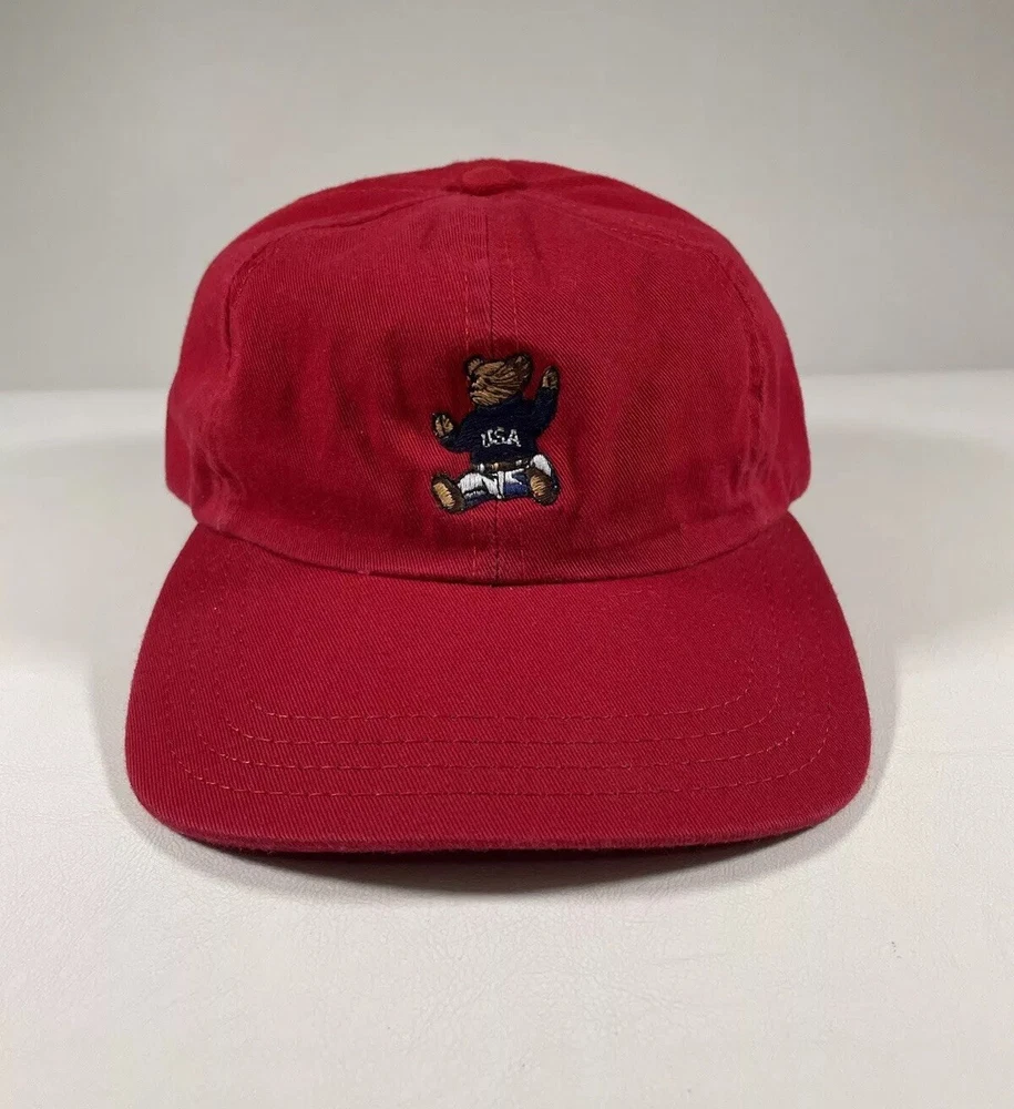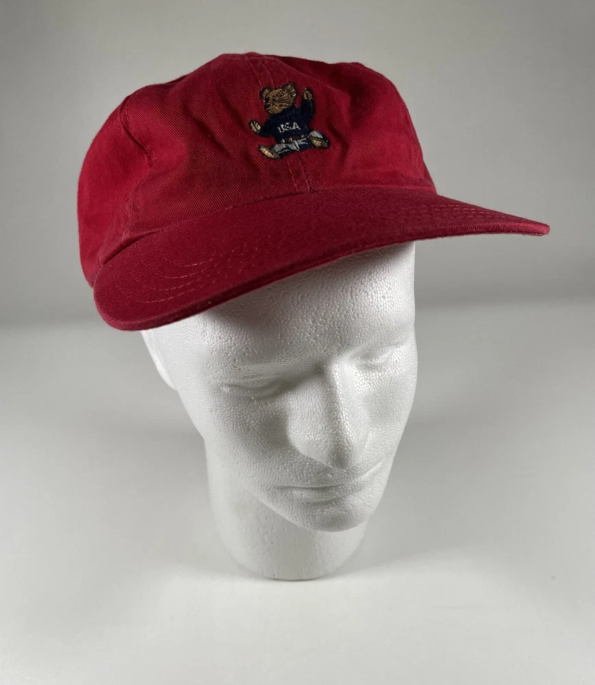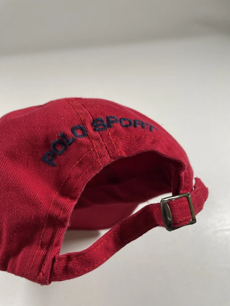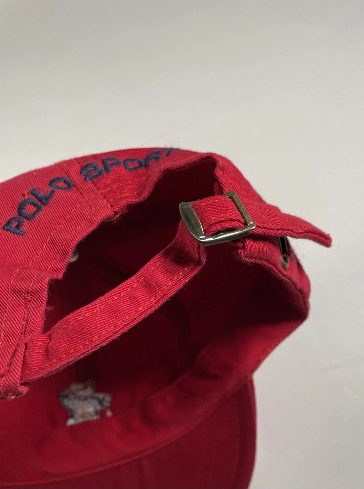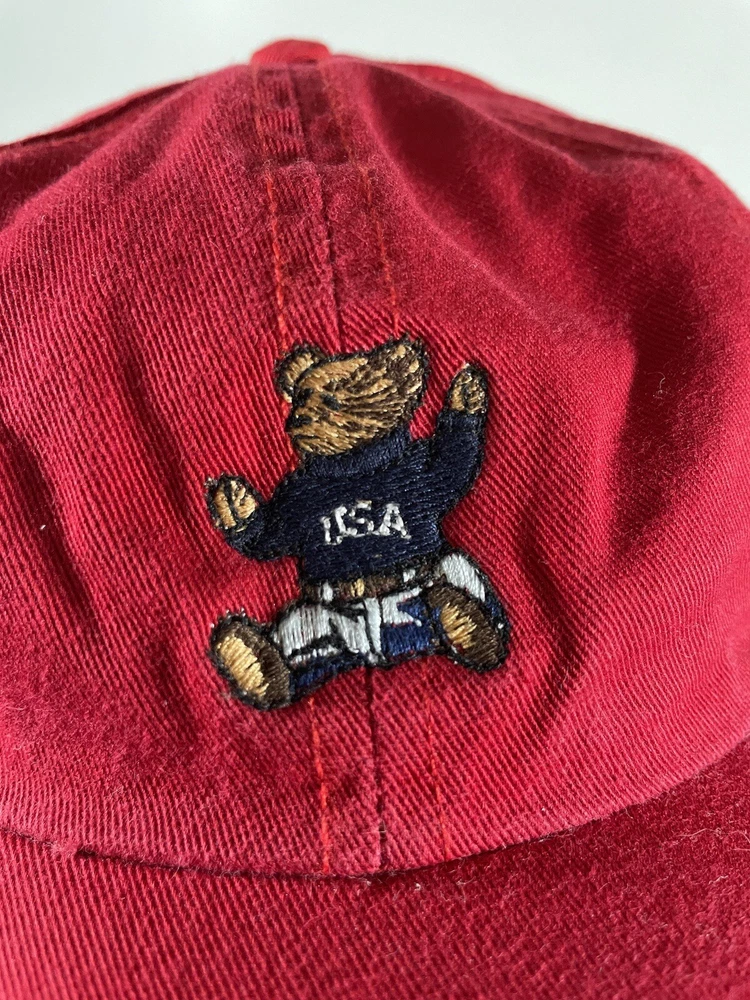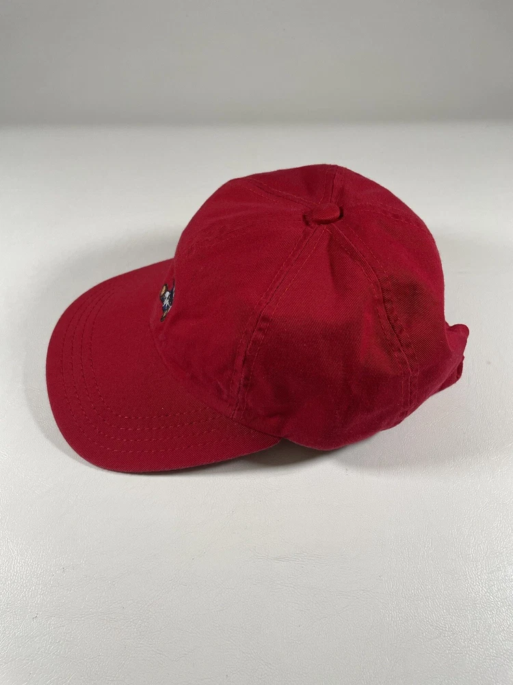 This vintage 90s baseball cap from Polo Sport Ralph Lauren features the iconic Sit Down Bear character embroidered on the front. The cap is made of lightweight cotton and is adjustable to fit most head sizes. The vibrant red color and 90s theme make it a perfect accessory for any outfit. The cap also includes other features such as an embroidered Polo Sport logo, and it was made in the United States. This item is perfect for any collector of vintage clothing or Polo Ralph Lauren fans. Boys one size but fits adults as well.