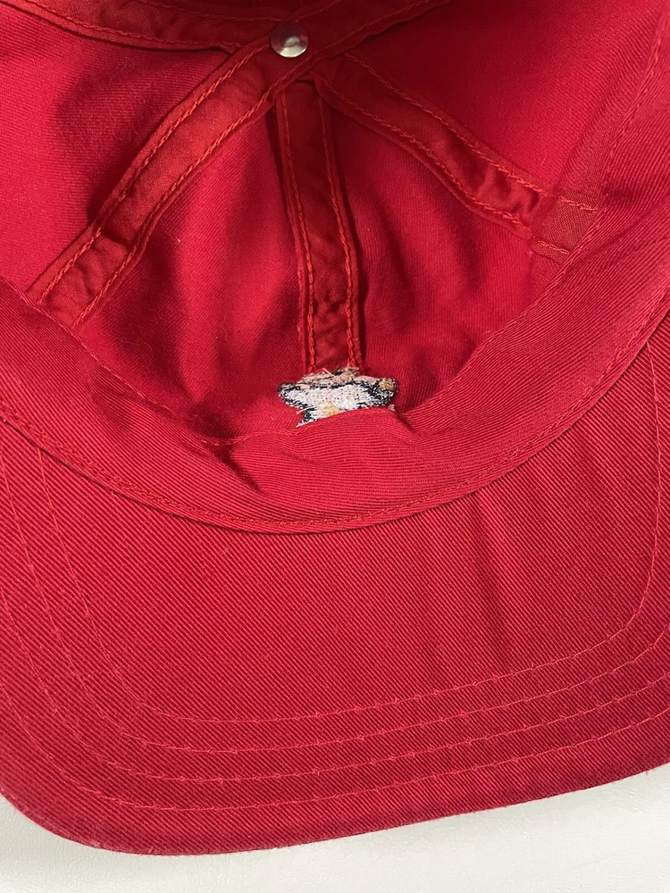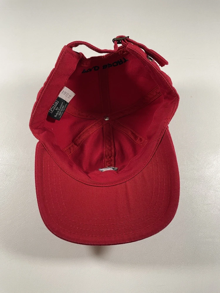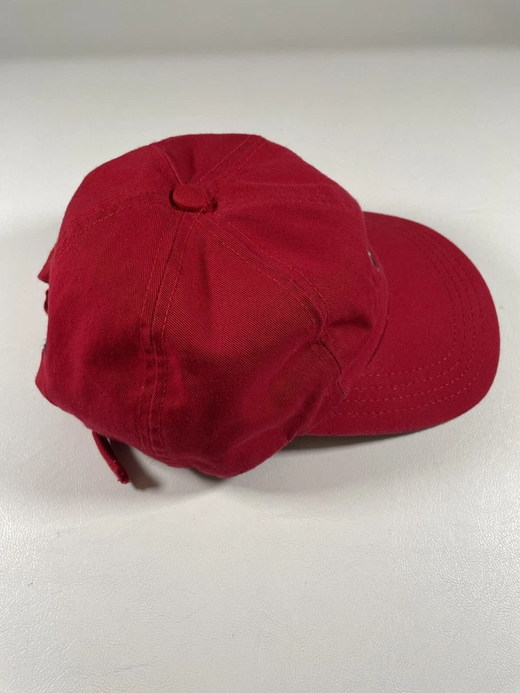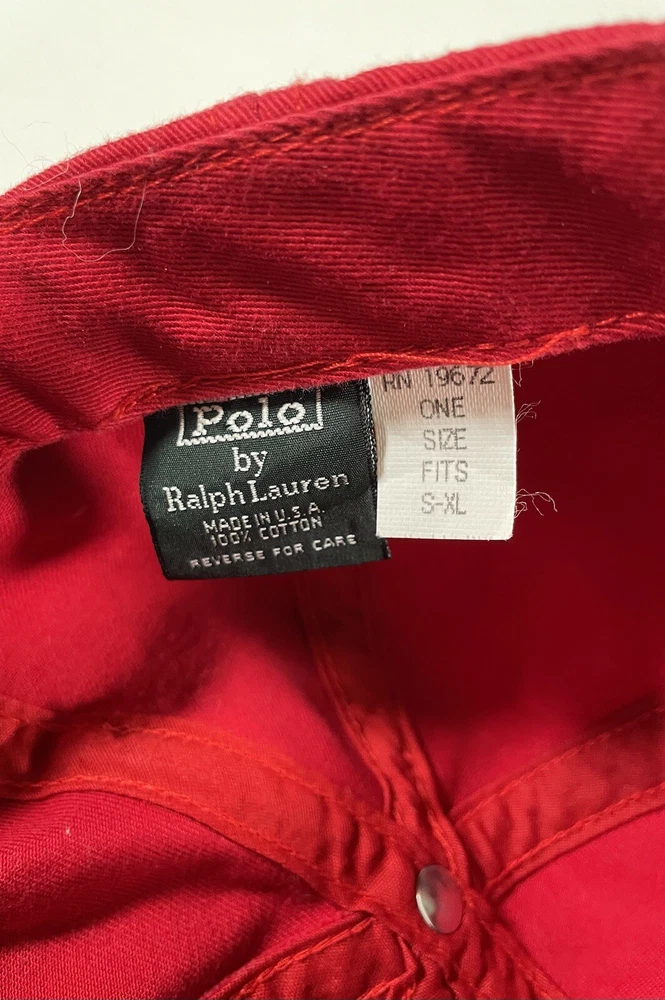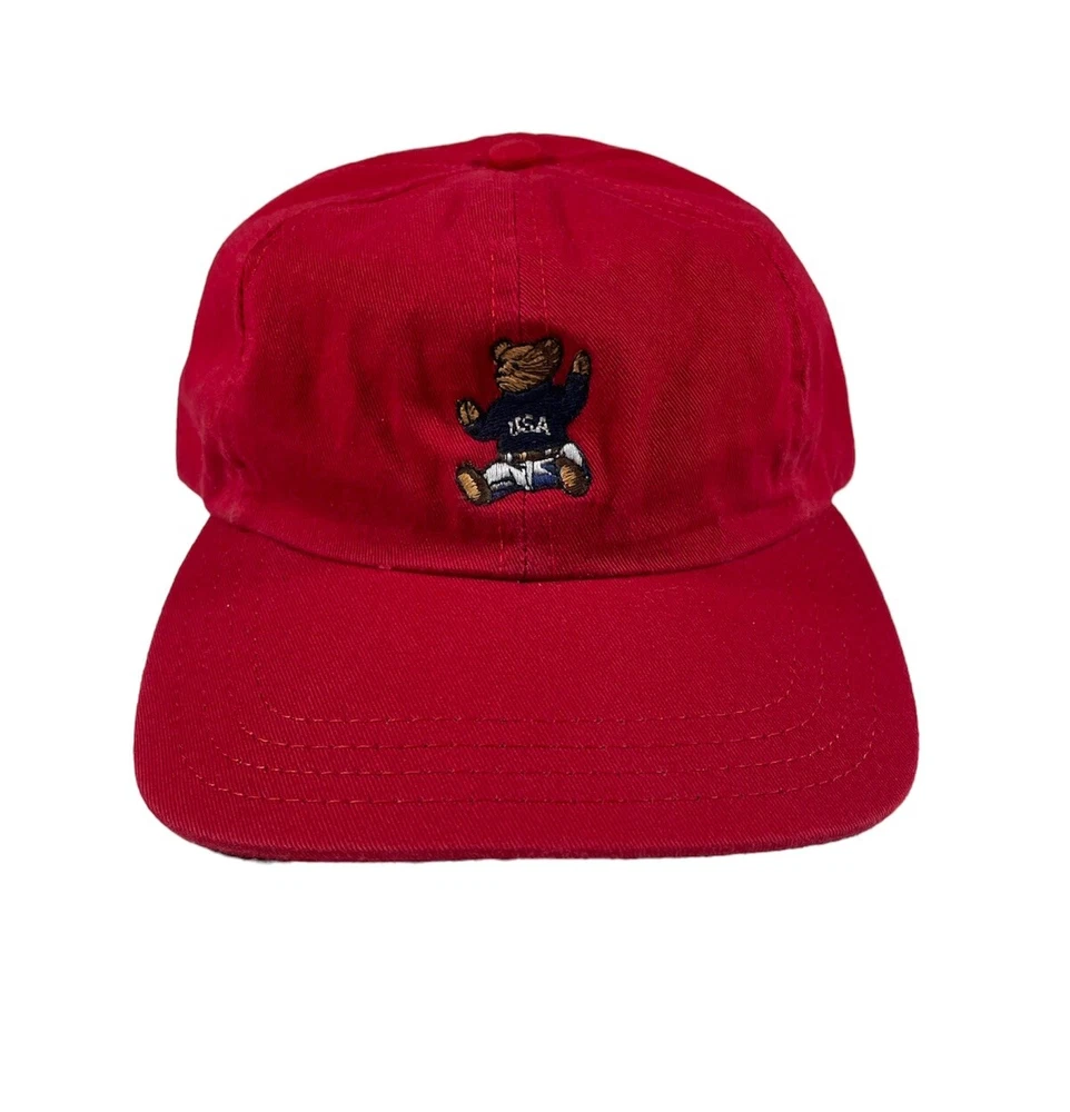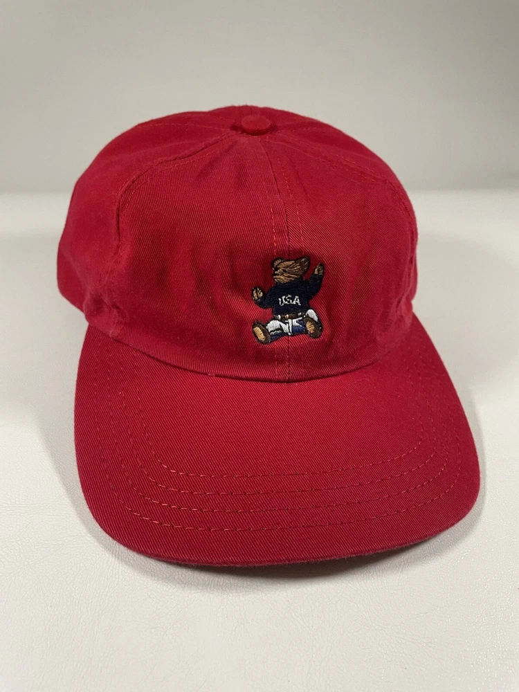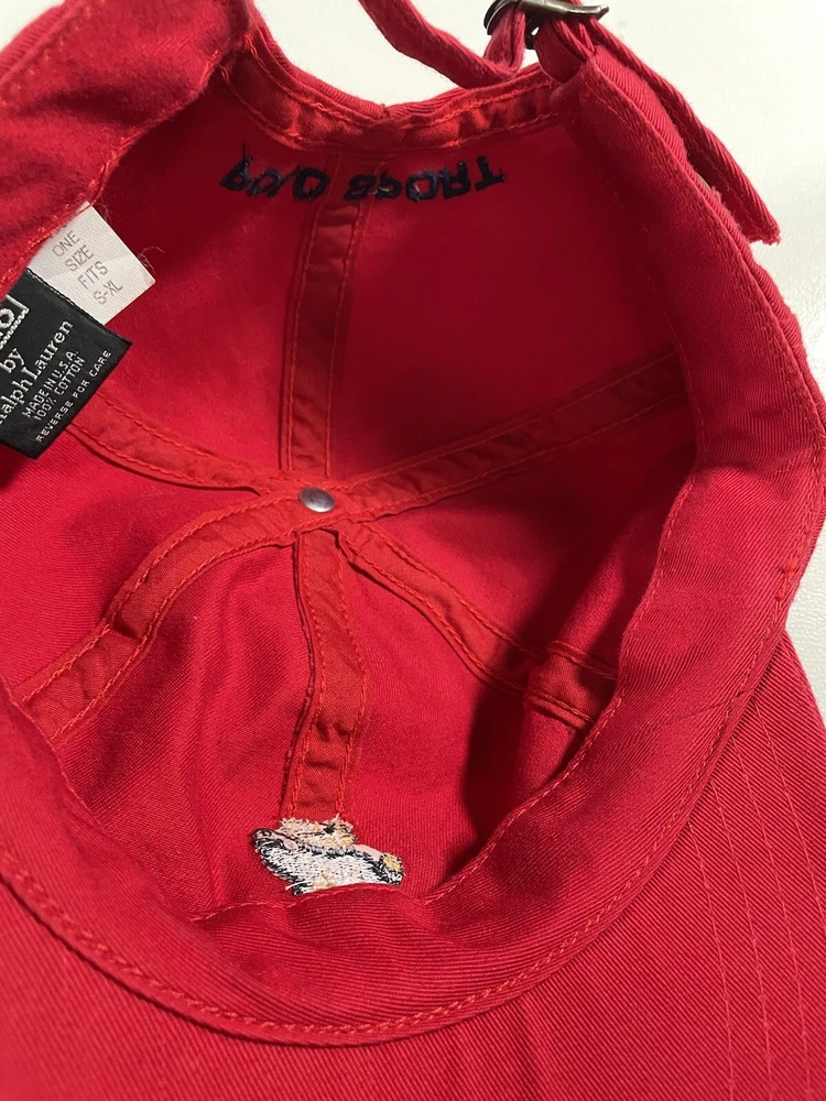 This vintage 90s baseball cap from Polo Sport Ralph Lauren features the iconic Sit Down Bear character embroidered on the front. The cap is made of lightweight cotton and is adjustable to fit most head sizes. The vibrant red color and 90s theme make it a perfect accessory for any outfit. The cap also includes other features such as an embroidered Polo Sport logo, and it was made in the United States. This item is perfect for any collector of vintage clothing or Polo Ralph Lauren fans. Boys one size but fits adults as well.