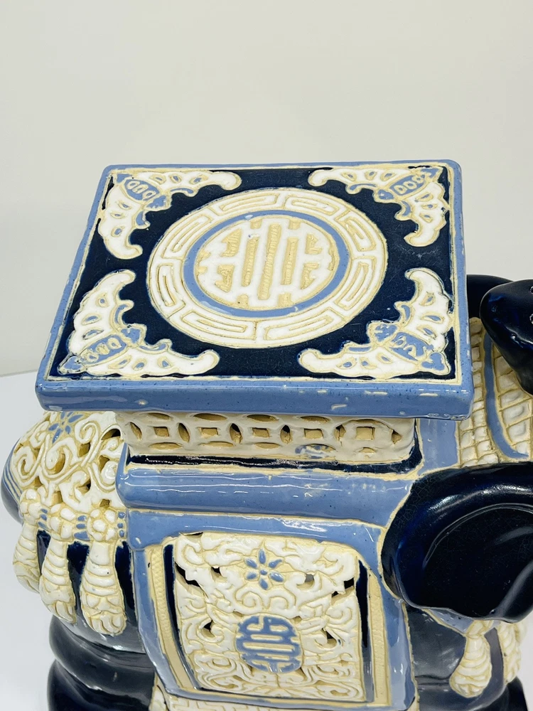 Vtg Blue Glazed Ceramic Elephant | Chinese Garden Stool | Pedestal | Side table. Measuring 20 inches long by 15 inches high and about 9 inches wide. It weighs just under 15 pounds.. it does show some signs of age such as crazing And some small imperfections in the glaze. There is a chip in the glaze on the tusk and a small one on the snout, as well as one on the dark blue line in the center of the elephant all three imperfections are shown in the last photos. Having just shipped one , It will be double boxed insured and signature confirmation added to insure safe delivery..