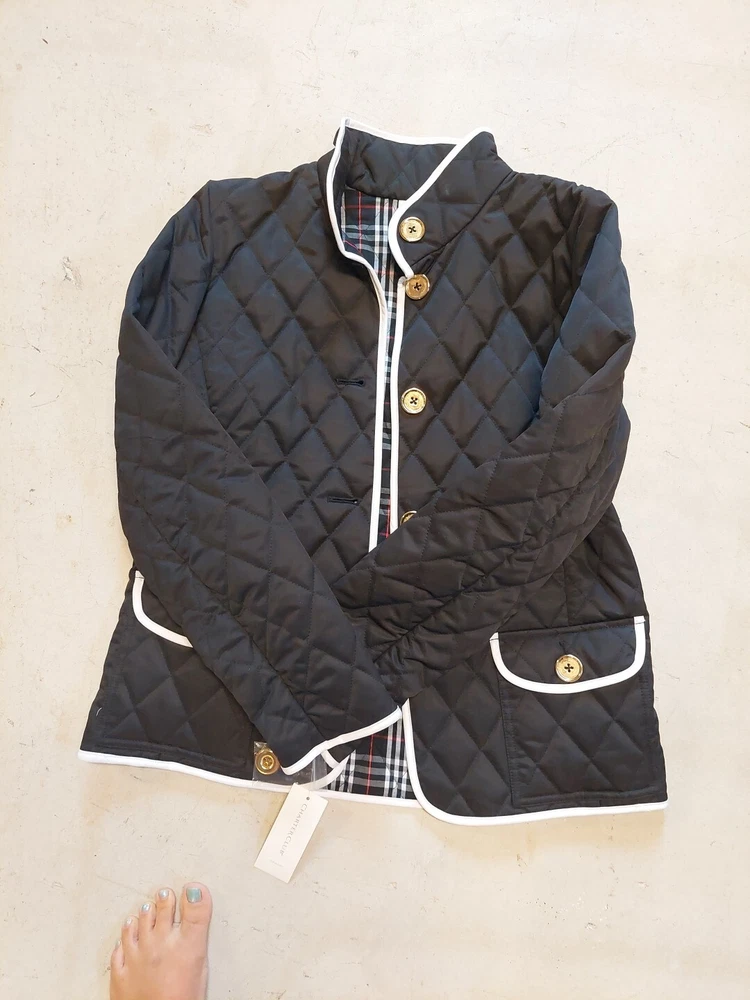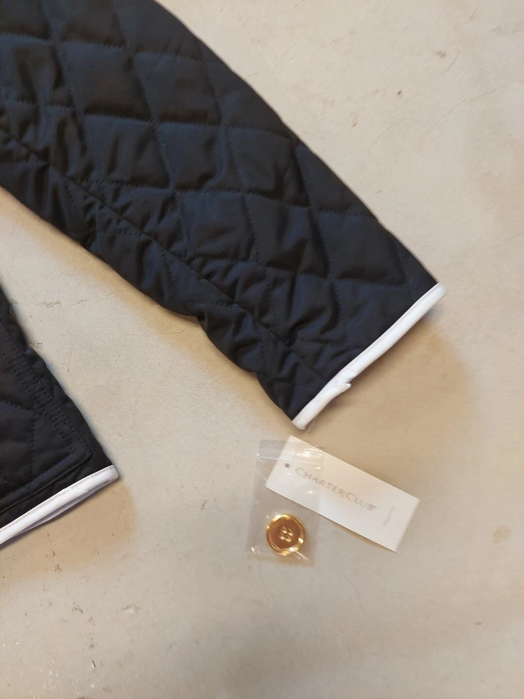 This vintage Charter Club jacket is a must-have for any fashion-forward woman. With its quilted design and button collar, it's perfect for the holidays or any special occasion. Made from high-quality polyester, this jacket is both comfortable and stylish. It's a great addition to any wardrobe, and its black color is sure to complement any outfit. This jacket is a true gem, and it's sure to turn heads wherever you go. Smoke free