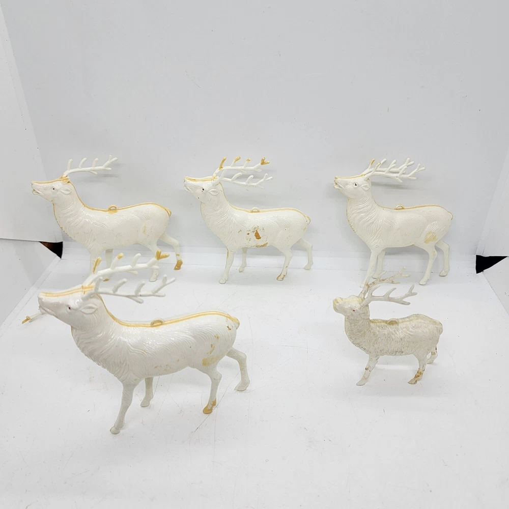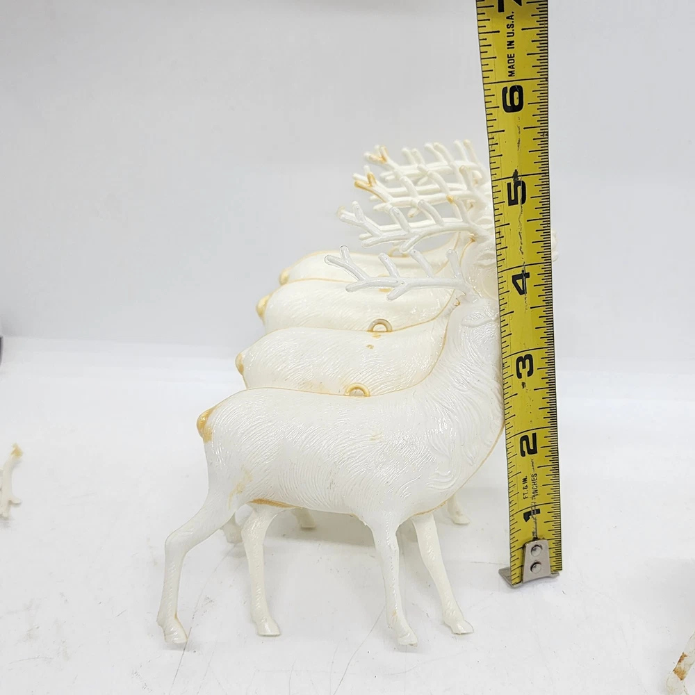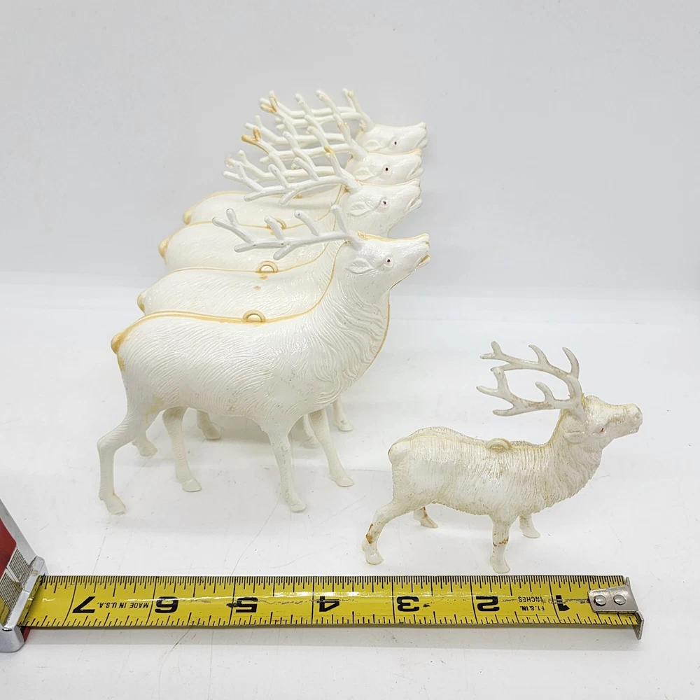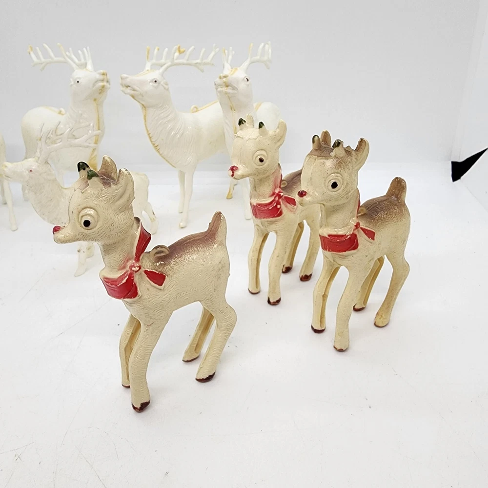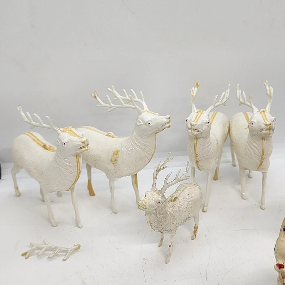 Welcome to Strack's Antiques Up for your consideration: A 8pc vintage assortment of celluloid hard plastic reindeer. 3 are RUDOLPH THE RED NOSED REINDEER & 5 are white walking reindeer. All of these reindeer are considered Mid Century Modern and are from the 1950s. They range from 4-1/2" tall to 3-1/2" tall....see pictures for Measurements. Conditions are listed below. Please look at all the pictures as they are part of the description. Thank you. ( Length x Height ) = 4-1/2×10 Approx. Weight = 1 lb BID WITH CONFIDENCE -- WE HAVE BEEN SELLING SINCE 1999 Good Condition for their age. 1 has broken antler. Age related wear to surface and paint. White deer show lots of aged glue...brownish color -- See Pictures Shipping Terms for This Item: We offer combined shipping to domestic buyers who purchase multiple items. NOTE: No combined shipping for international buyers. If you would like for us to combine shipping for your order, please contact us for an invoice. Do not pay until you receive a combined invoice from us. Please note: Buyer will have to directly sign when item/items sells for $200 or more when delivered - per insurance policy rules.