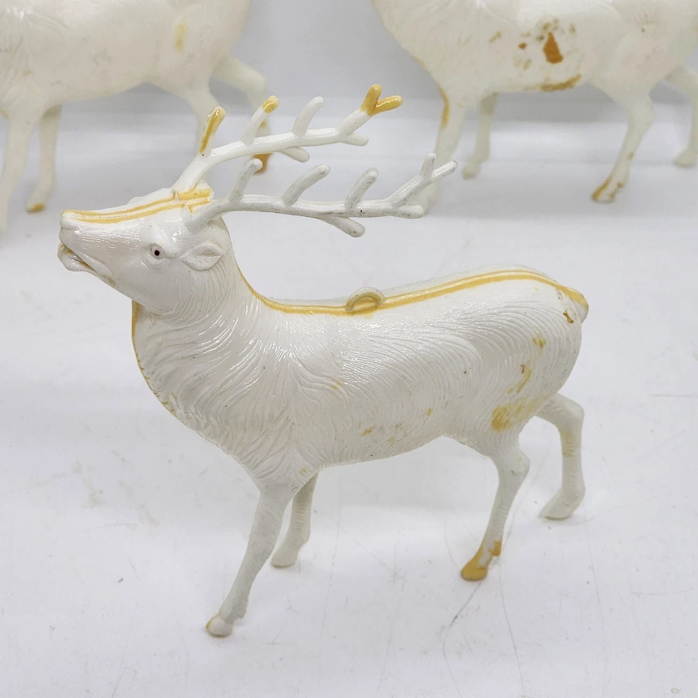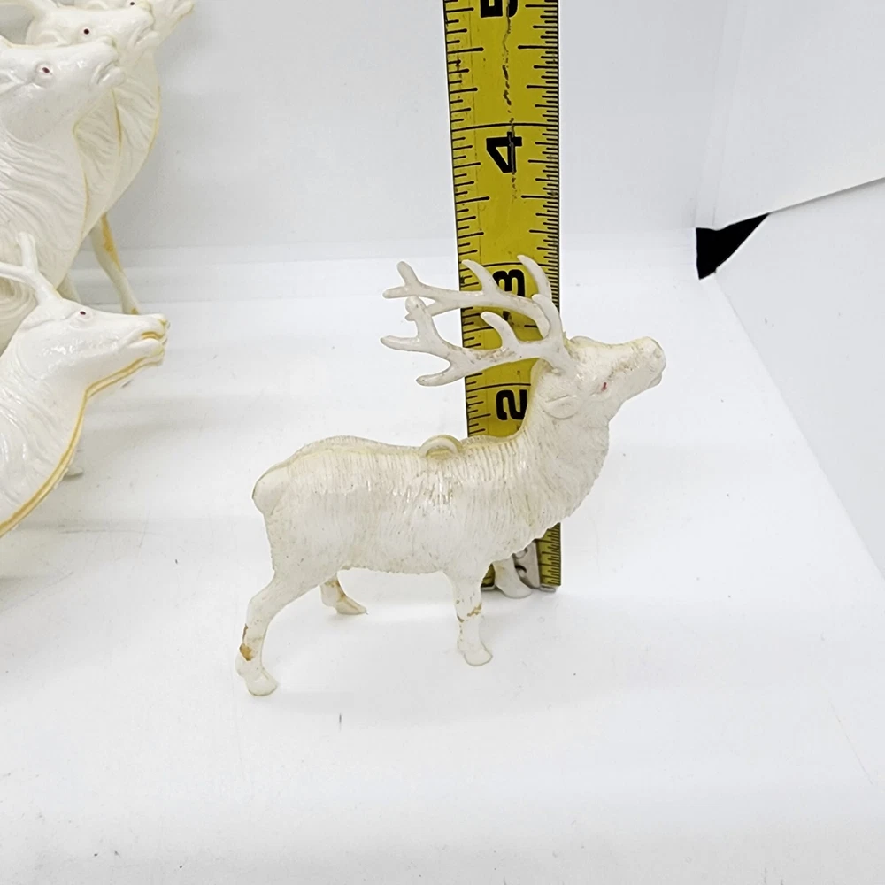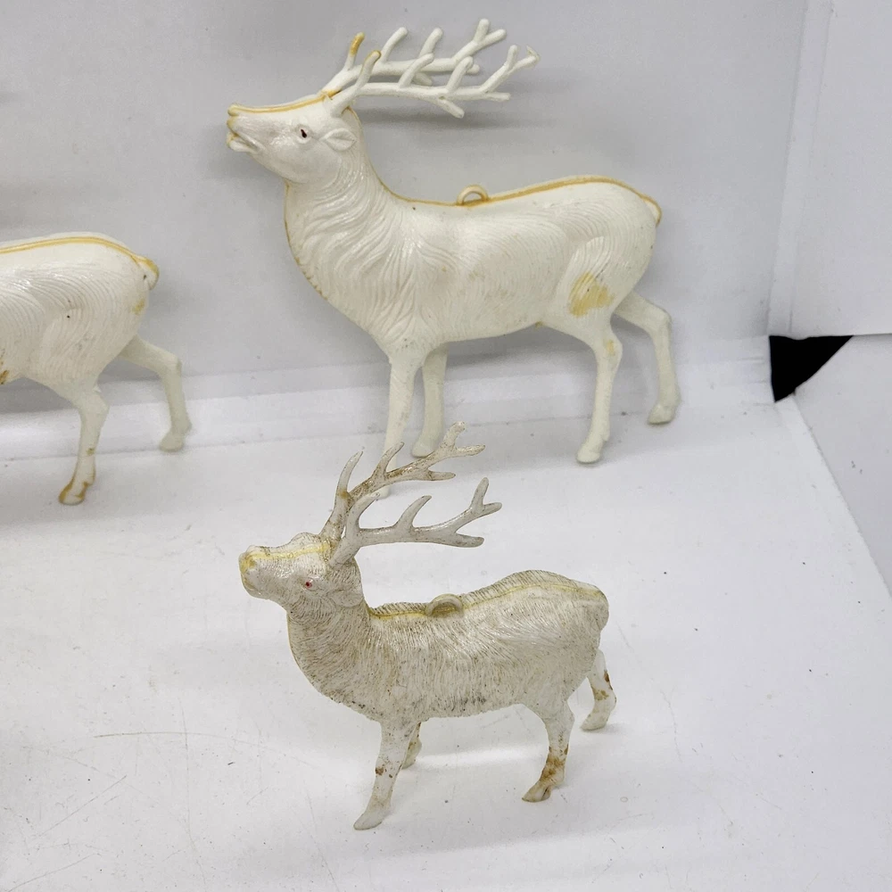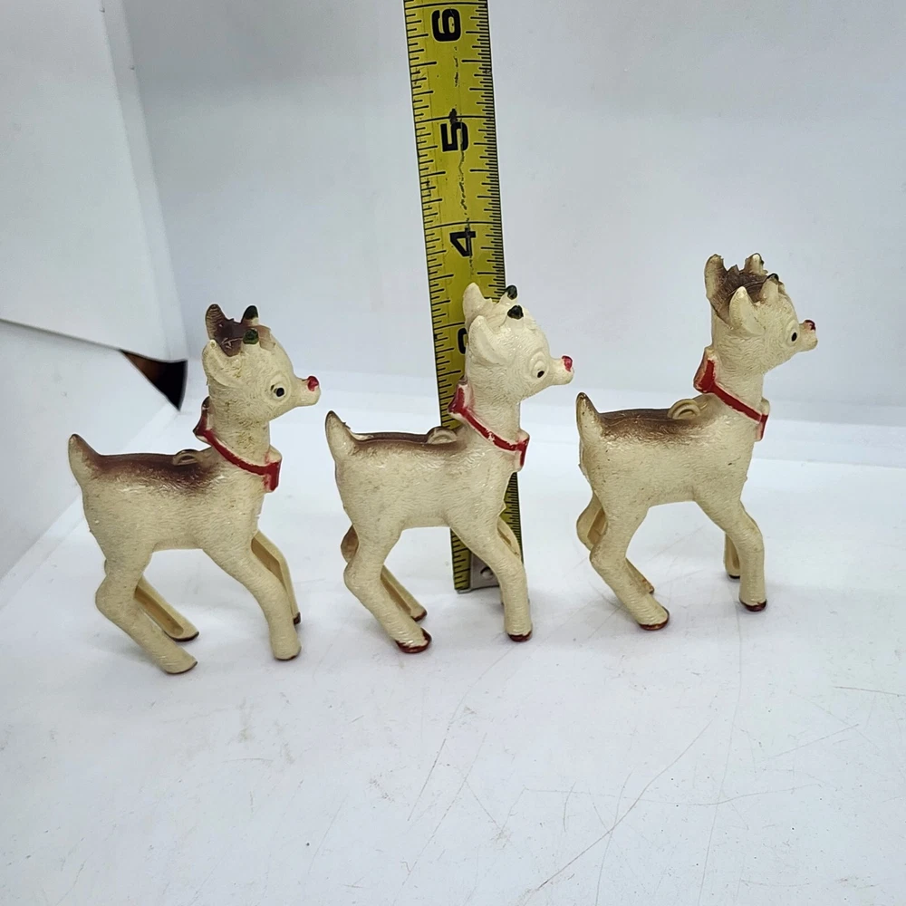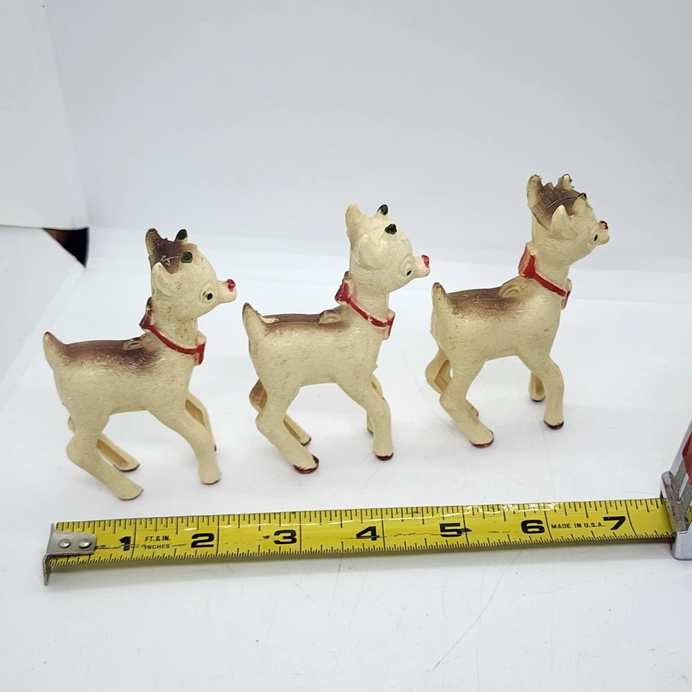 Welcome to Strack's Antiques Up for your consideration: A 8pc vintage assortment of celluloid hard plastic reindeer. 3 are RUDOLPH THE RED NOSED REINDEER & 5 are white walking reindeer. All of these reindeer are considered Mid Century Modern and are from the 1950s. They range from 4-1/2" tall to 3-1/2" tall....see pictures for Measurements. Conditions are listed below. Please look at all the pictures as they are part of the description. Thank you. ( Length x Height ) = 4-1/2×10 Approx. Weight = 1 lb BID WITH CONFIDENCE -- WE HAVE BEEN SELLING SINCE 1999 Good Condition for their age. 1 has broken antler. Age related wear to surface and paint. White deer show lots of aged glue...brownish color -- See Pictures Shipping Terms for This Item: We offer combined shipping to domestic buyers who purchase multiple items. NOTE: No combined shipping for international buyers. If you would like for us to combine shipping for your order, please contact us for an invoice. Do not pay until you receive a combined invoice from us. Please note: Buyer will have to directly sign when item/items sells for $200 or more when delivered - per insurance policy rules.