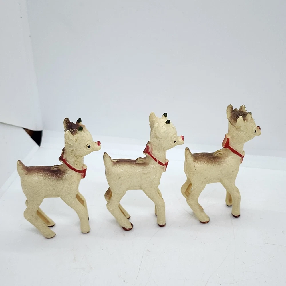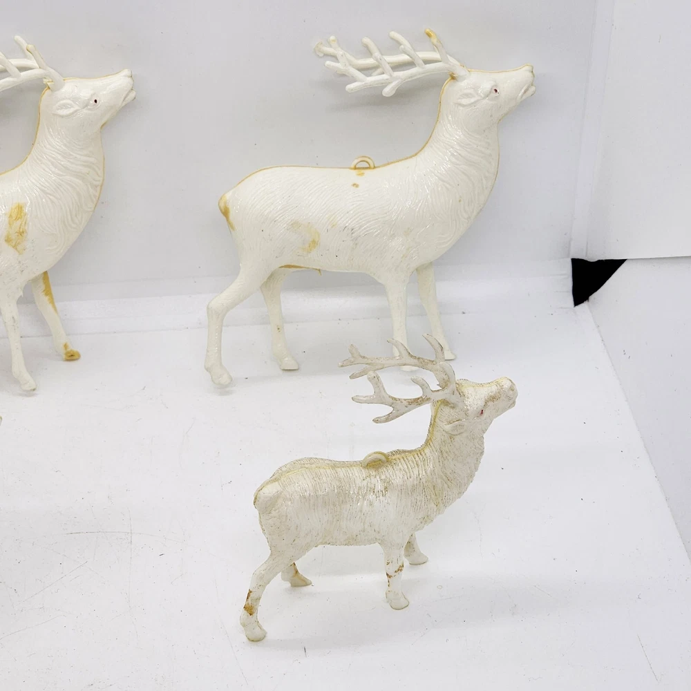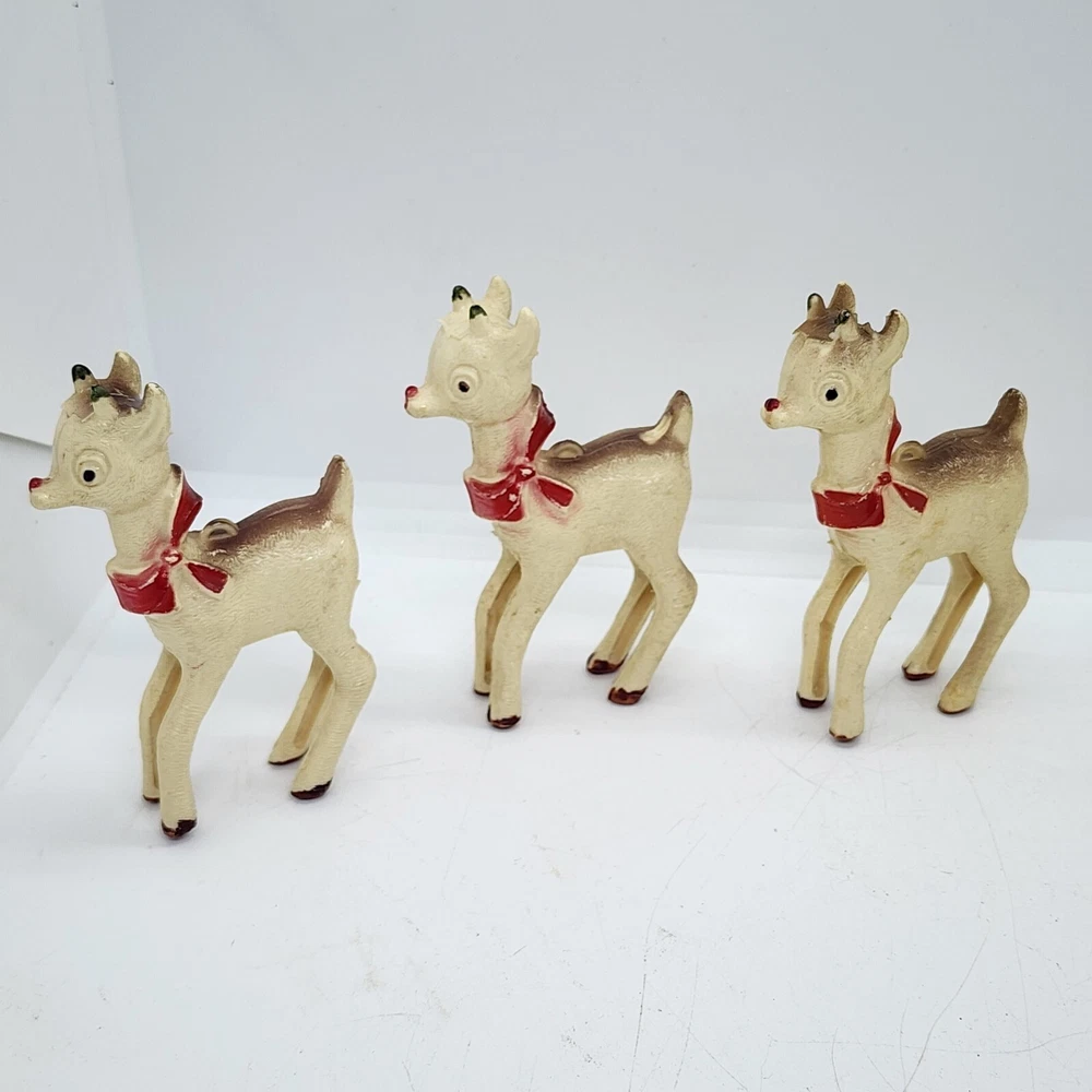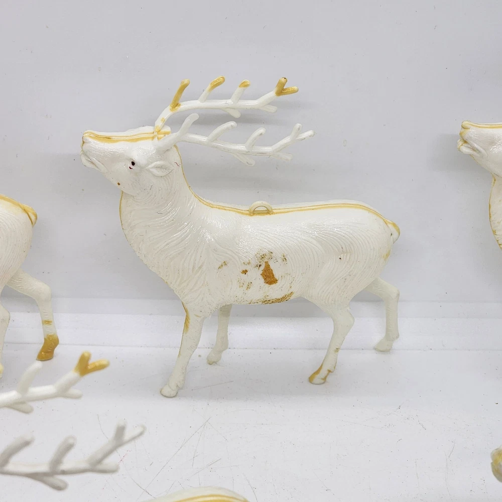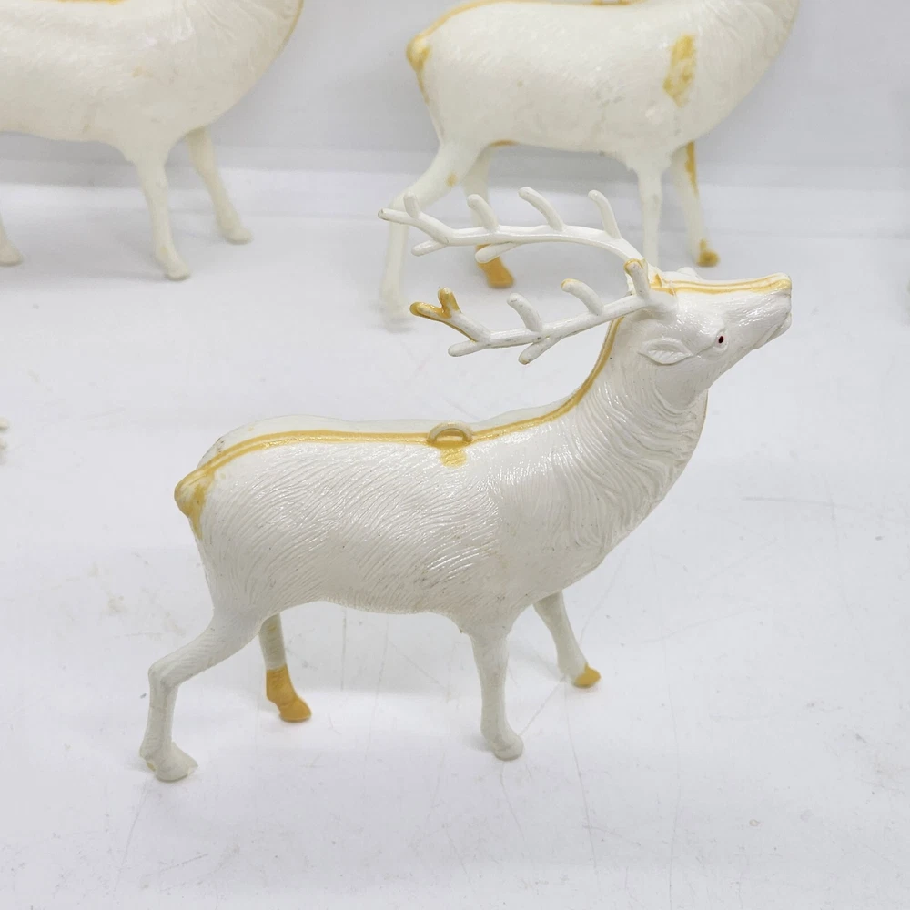 Welcome to Strack's Antiques Up for your consideration: A 8pc vintage assortment of celluloid hard plastic reindeer. 3 are RUDOLPH THE RED NOSED REINDEER & 5 are white walking reindeer. All of these reindeer are considered Mid Century Modern and are from the 1950s. They range from 4-1/2" tall to 3-1/2" tall....see pictures for Measurements. Conditions are listed below. Please look at all the pictures as they are part of the description. Thank you. ( Length x Height ) = 4-1/2×10 Approx. Weight = 1 lb BID WITH CONFIDENCE -- WE HAVE BEEN SELLING SINCE 1999 Good Condition for their age. 1 has broken antler. Age related wear to surface and paint. White deer show lots of aged glue...brownish color -- See Pictures Shipping Terms for This Item: We offer combined shipping to domestic buyers who purchase multiple items. NOTE: No combined shipping for international buyers. If you would like for us to combine shipping for your order, please contact us for an invoice. Do not pay until you receive a combined invoice from us. Please note: Buyer will have to directly sign when item/items sells for $200 or more when delivered - per insurance policy rules.