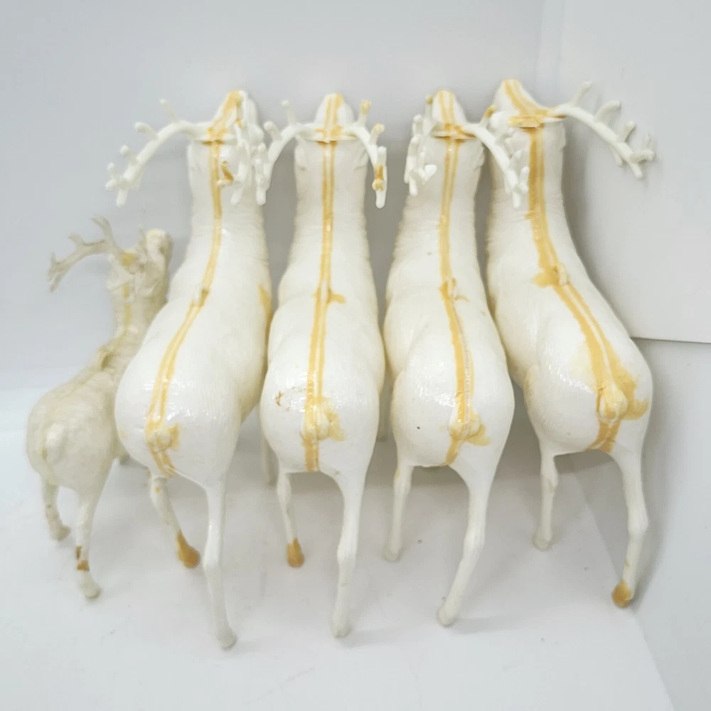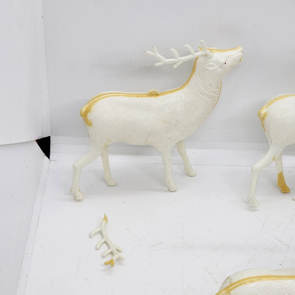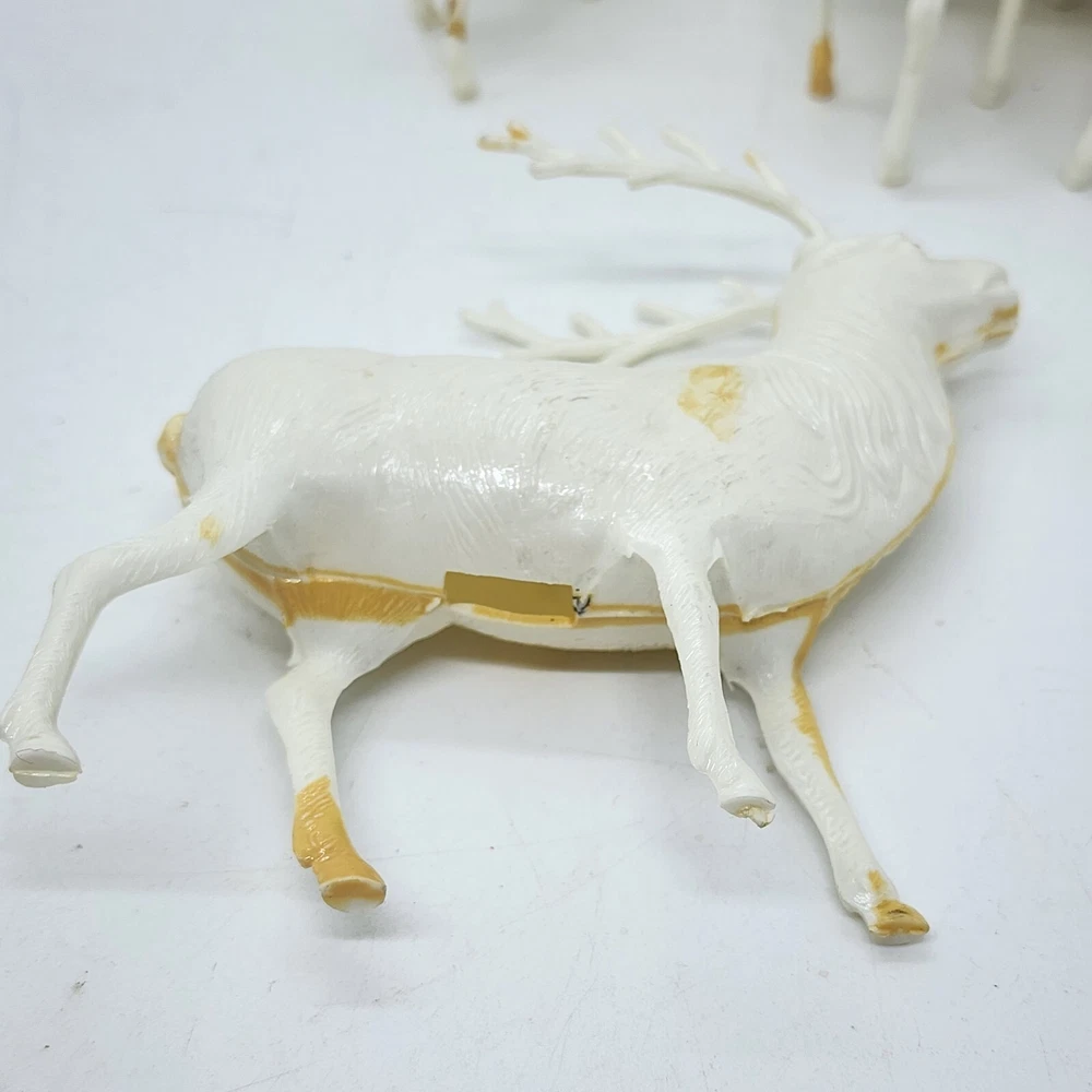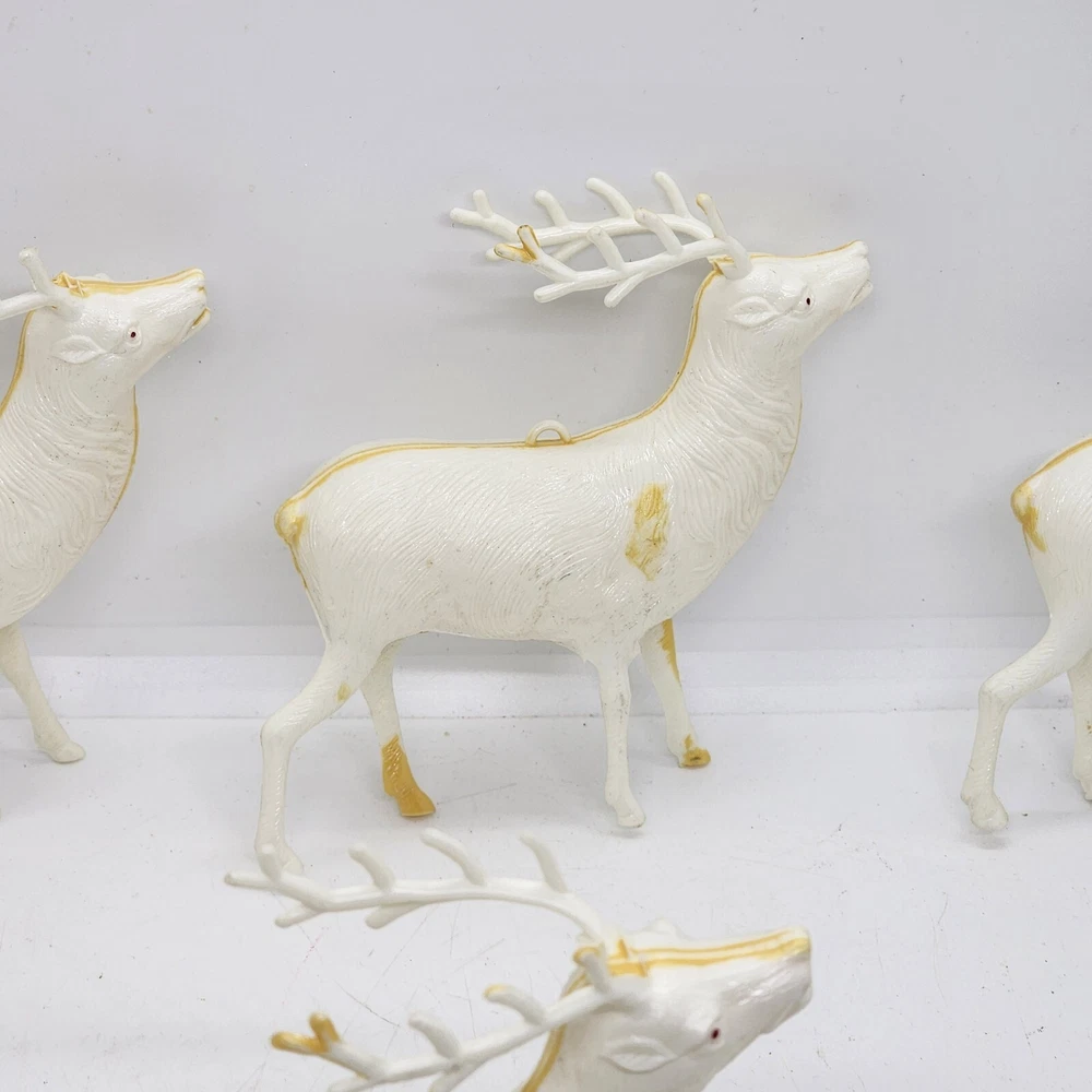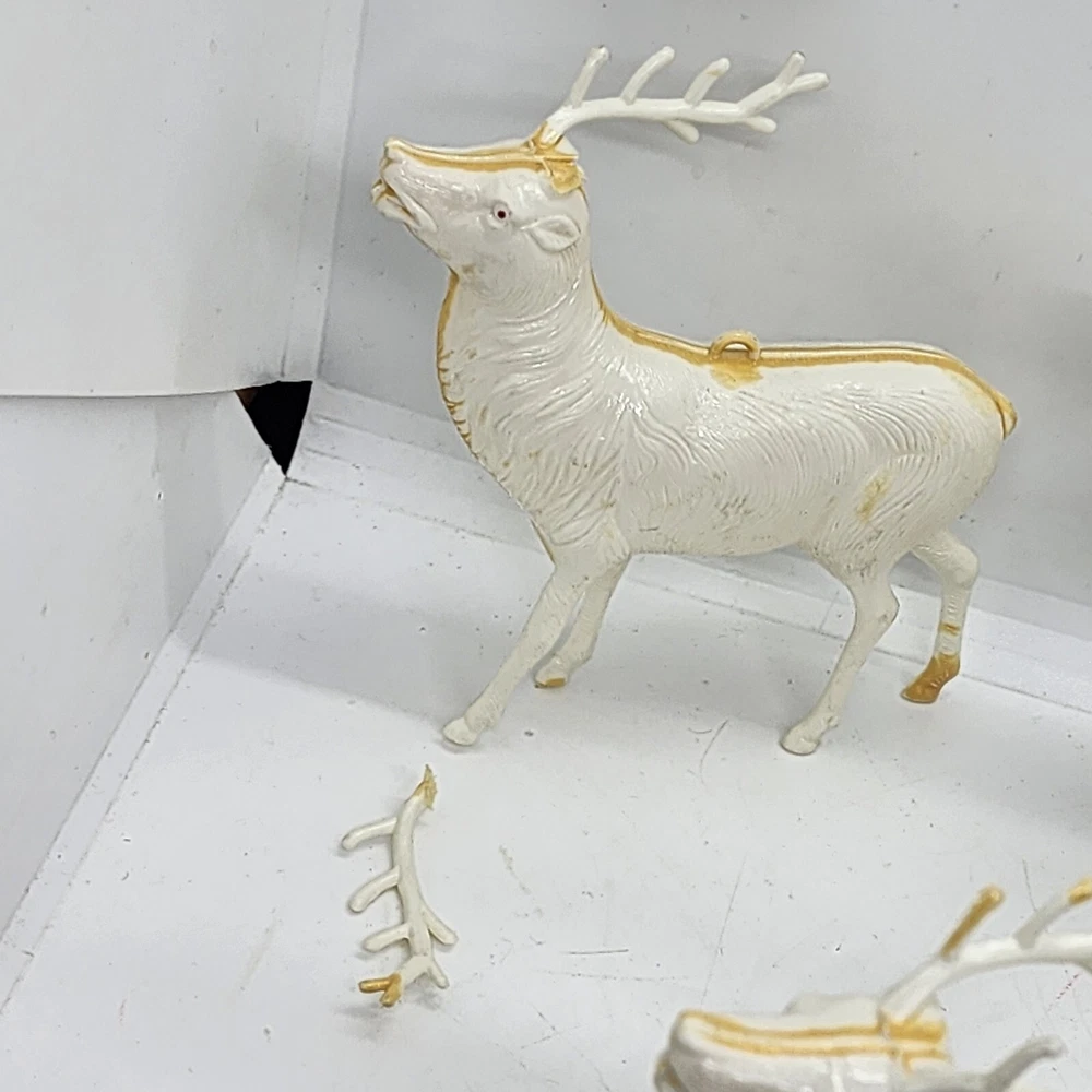 Welcome to Strack's Antiques Up for your consideration: A 8pc vintage assortment of celluloid hard plastic reindeer. 3 are RUDOLPH THE RED NOSED REINDEER & 5 are white walking reindeer. All of these reindeer are considered Mid Century Modern and are from the 1950s. They range from 4-1/2" tall to 3-1/2" tall....see pictures for Measurements. Conditions are listed below. Please look at all the pictures as they are part of the description. Thank you. ( Length x Height ) = 4-1/2×10 Approx. Weight = 1 lb BID WITH CONFIDENCE -- WE HAVE BEEN SELLING SINCE 1999 Good Condition for their age. 1 has broken antler. Age related wear to surface and paint. White deer show lots of aged glue...brownish color -- See Pictures Shipping Terms for This Item: We offer combined shipping to domestic buyers who purchase multiple items. NOTE: No combined shipping for international buyers. If you would like for us to combine shipping for your order, please contact us for an invoice. Do not pay until you receive a combined invoice from us. Please note: Buyer will have to directly sign when item/items sells for $200 or more when delivered - per insurance policy rules.