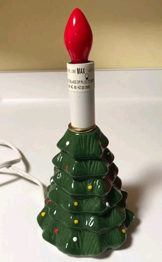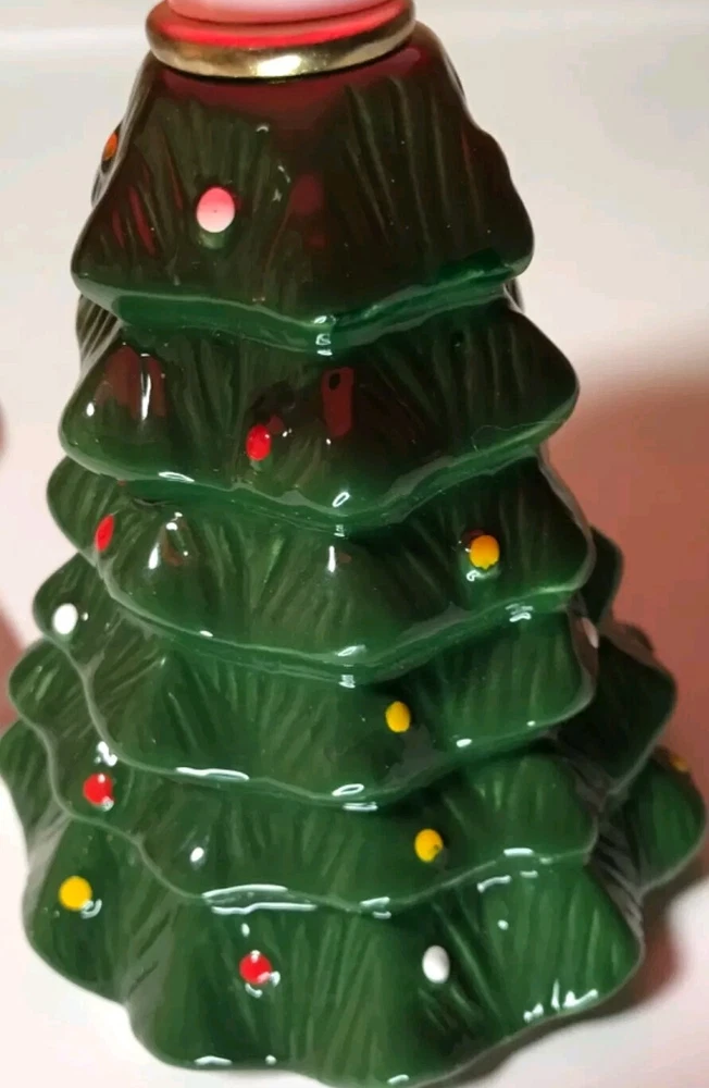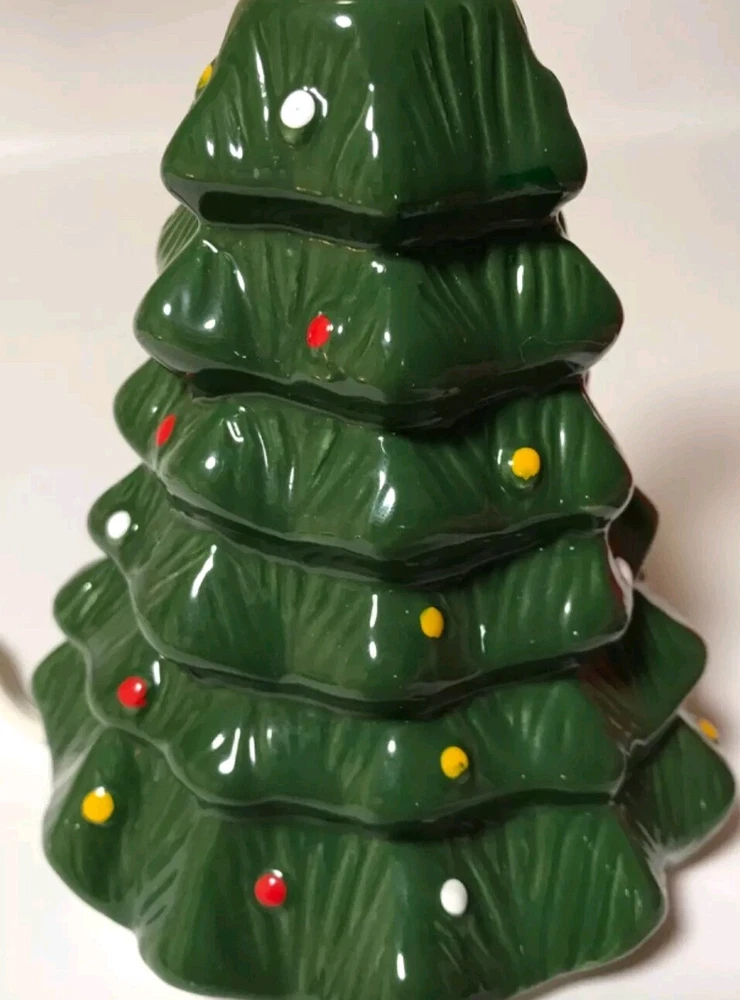 Add some vintage charm to your holiday decor with this beautiful ceramic and porcelain table lamp. The lamp features a green glossy Christmas tree with multicolor ornaments design with an empire clip on shade. The corded electric power source and clear light color make this a great addition to any room. This hand-painted lamp is a retro style and measures 9.5 inches in height and 4.25 inches in diameter. The control style is a switch and the sensor type is a light. This unit is an original from the 1980s and perfect for unisex adults. The lamp is perfect for adding a festive touch to any space. Perfect condition.
