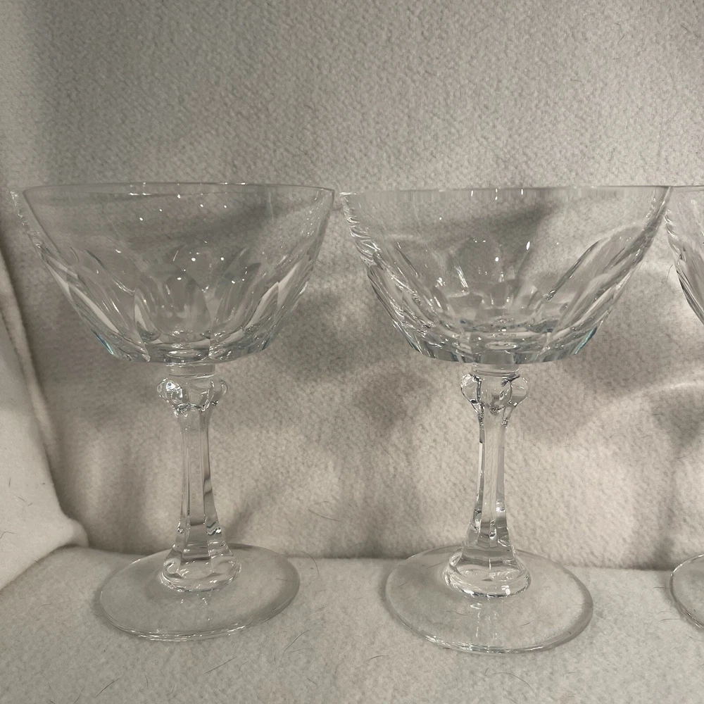This set includes four vintage clear crystal champagne or sherbet glasses with a large thumbprint pattern. The round glasses are 4 inches in diameter and 5.5 inches in height, weighing a total of 1.13 lbs. They feature a mid-century modern style and are decorative in design, suitable for all occasions. The brand is Crystal Clear, and they are original pieces made of crystal, adding a touch of elegance to any tabletop setting. Excellent condition. No chips or cracks.