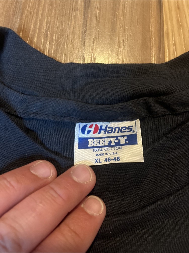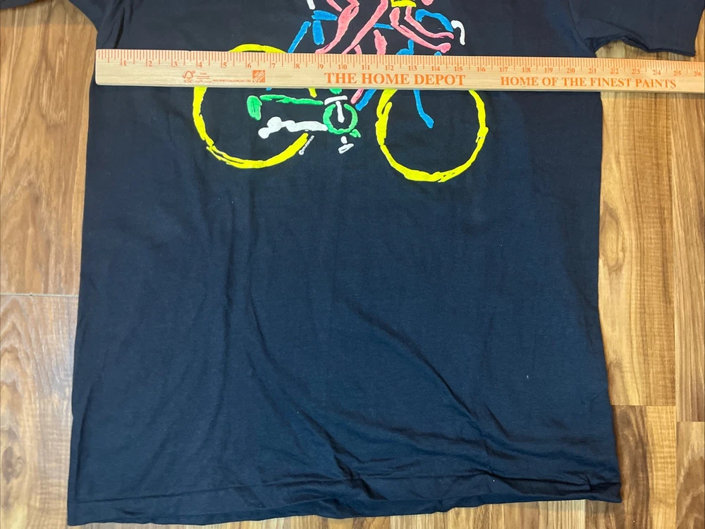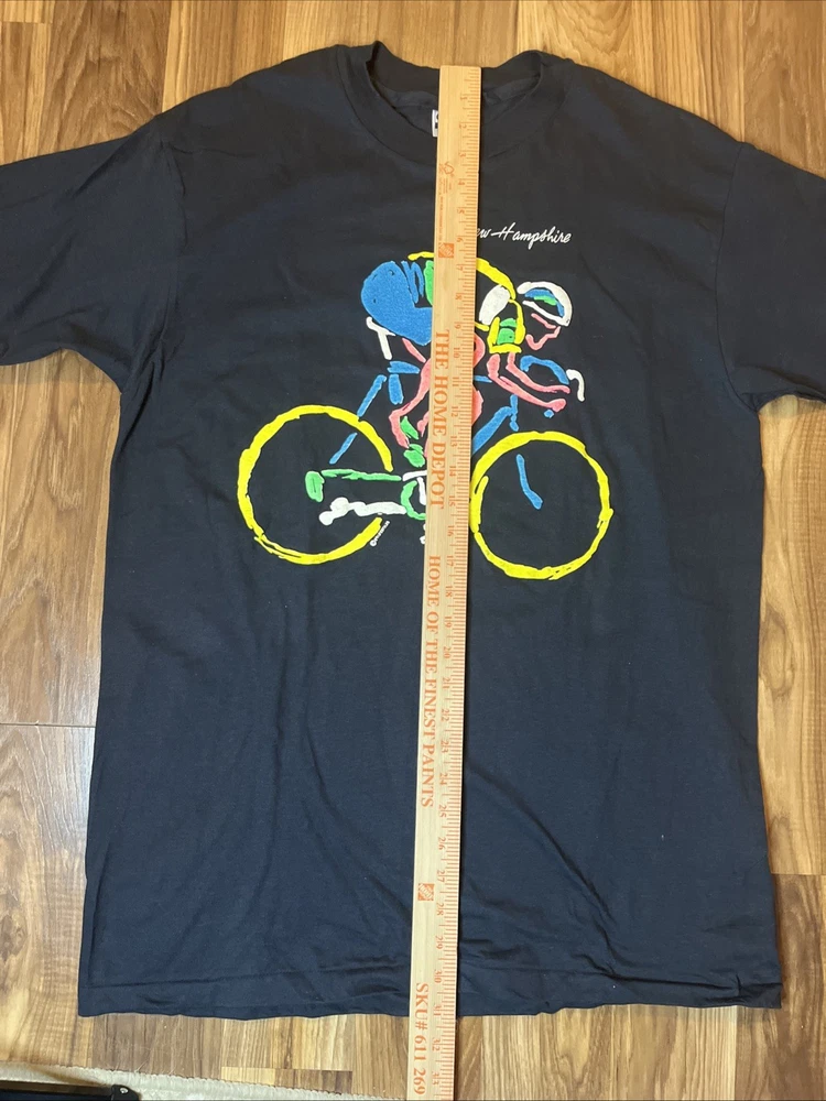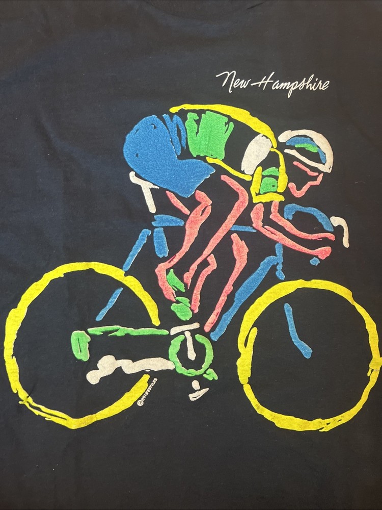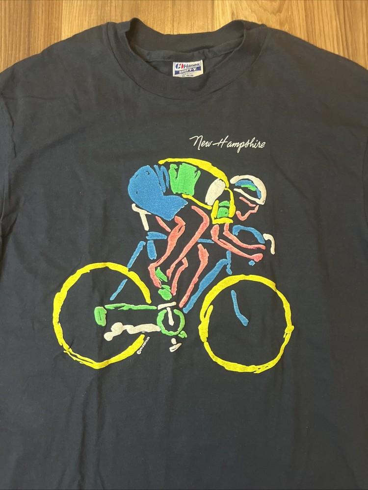 This vintage New Hampshire cycling bicycle t-shirt from 1989 features a graphic print of a road bike on the front and back, with a single stitch detail. Made of cotton in a classic black color, this XL shirt has a crew neck and short sleeves, suitable for year-round wear. The 80s theme and vintage style make it a unique addition to any cyclist's wardrobe, with a regular fit and American-made quality from the Hanes brand. Perfect for winter, summer, fall, or spring, this shirt is a must-have for biking enthusiasts looking for a piece of retro cycling fashion.