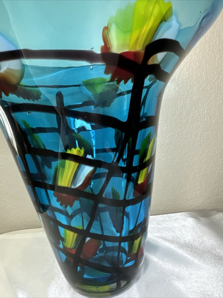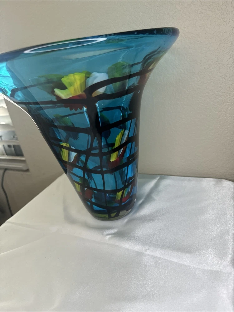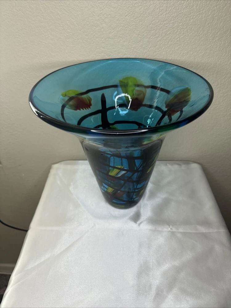 This vintage Dale Tiffany art glass vase is a stunning addition to any home decor. The large blue vase features an abstract colorful pattern that is sure to catch the eye of anyone who sees it. The vase is made of high-quality glass and has a production style of art glass. The brand, Dale Tiffany, is known for producing beautiful glassware, and this vase is no exception. It is perfect for displaying flowers or as a standalone decorative piece. The vase measures 9.5 inches and is a must-have for any collector of vintage glassware.