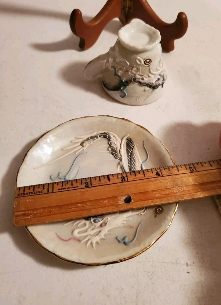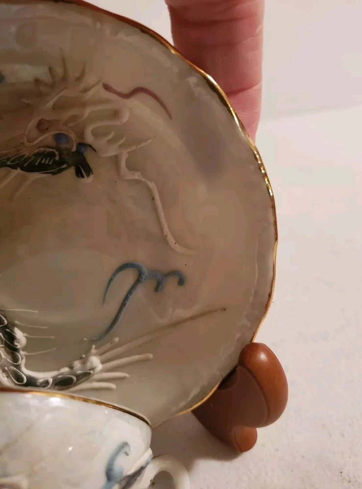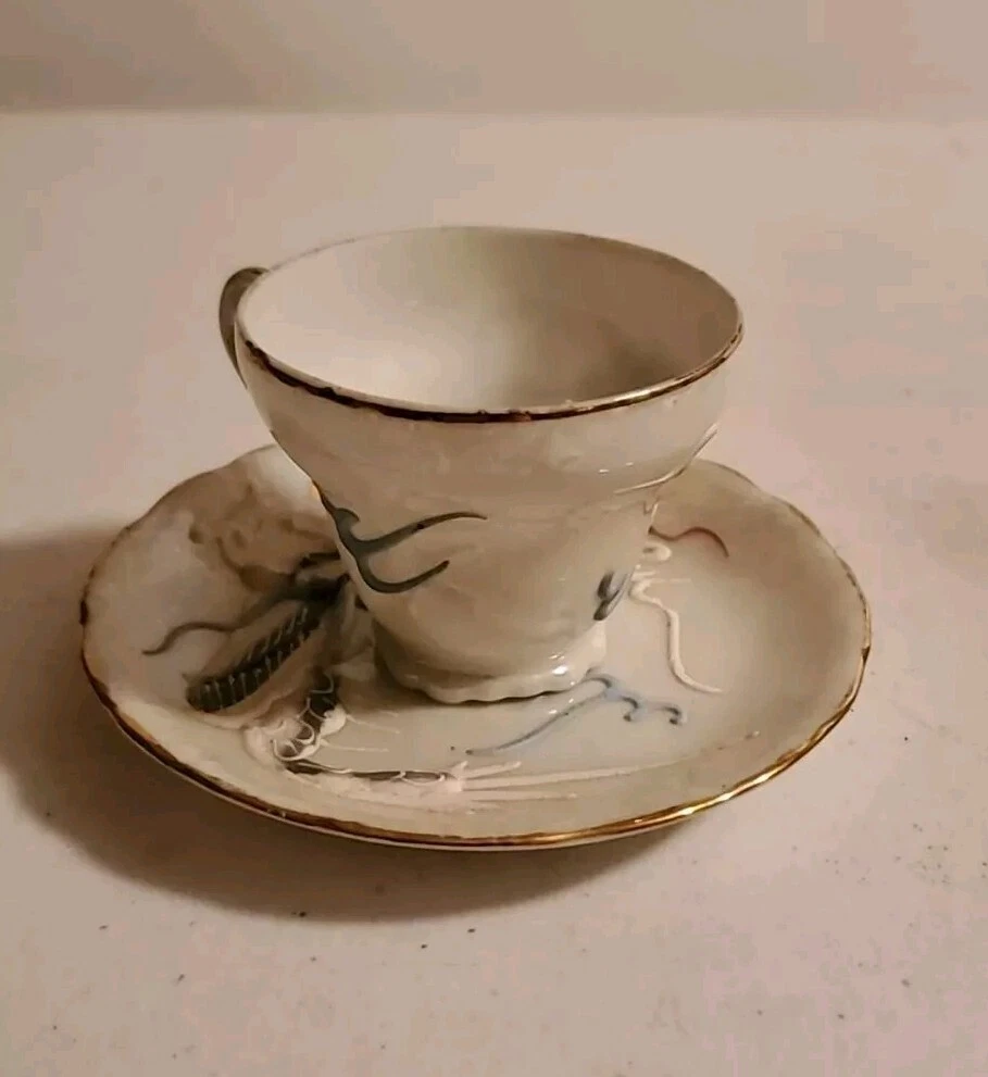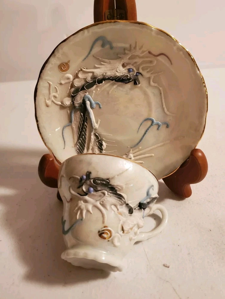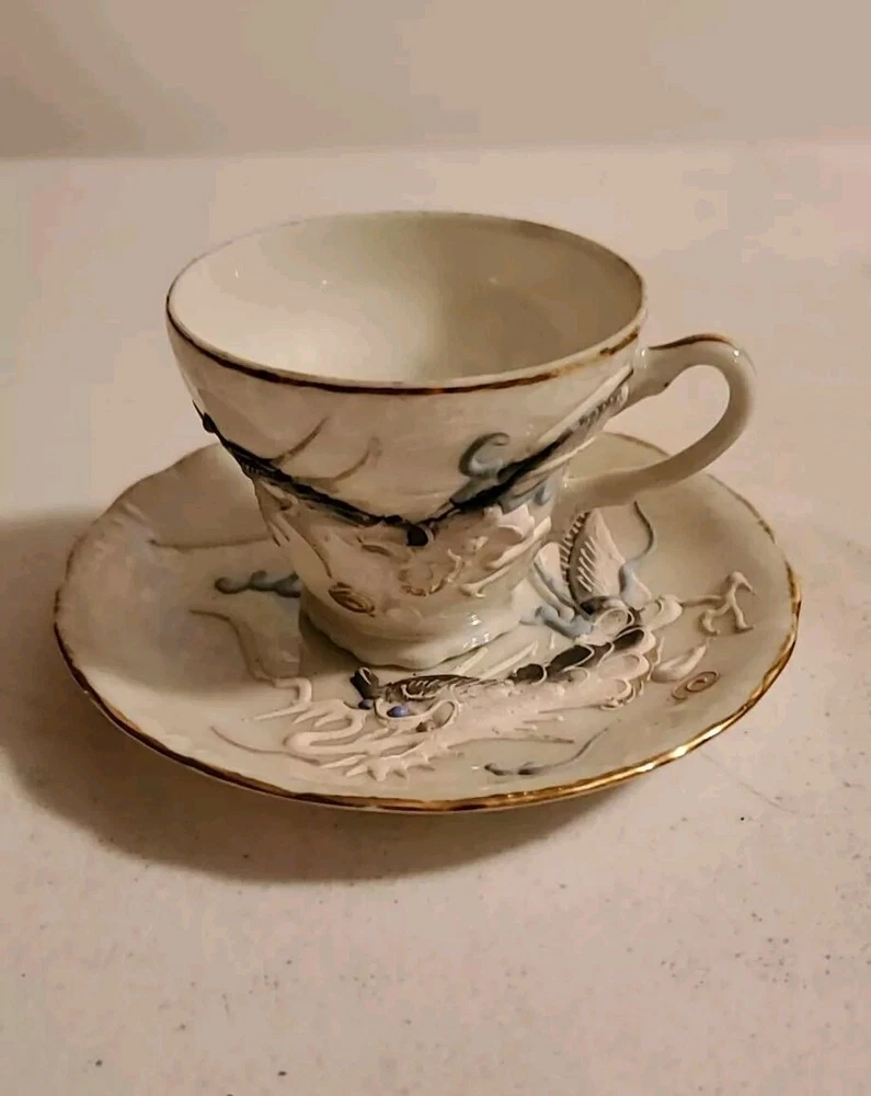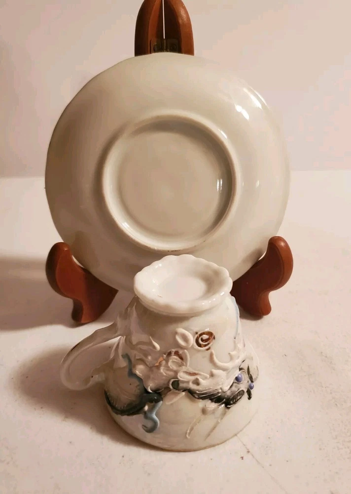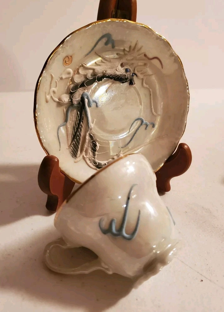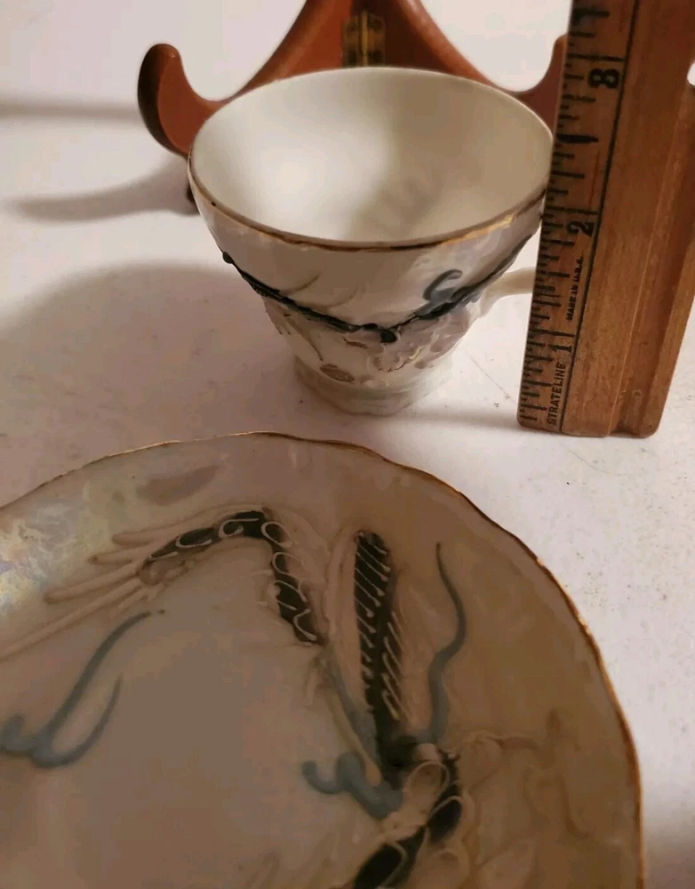 This is a vintage demitasse tea cup and saucer set with a Moriage dragon design. The set is made in Japan and features an opalescent finish. It is not handmade and is part of Japanese culture. The saucer measures 4.5 inches in diameter and cup is 2.25 inches in height. There is no damage reported on this set. Believe porcelain can see through it. No Damage no chips cracks or hairlines. Securely packed and shipped quickly. Thank you 😊
