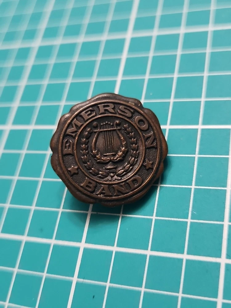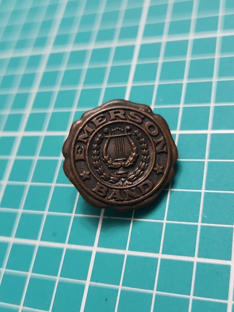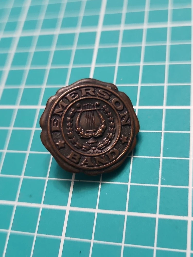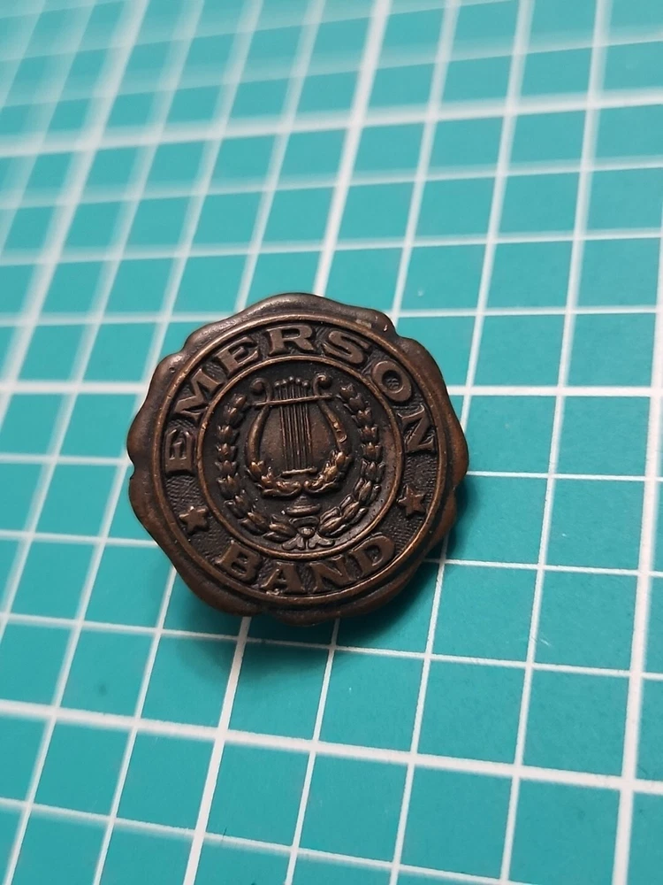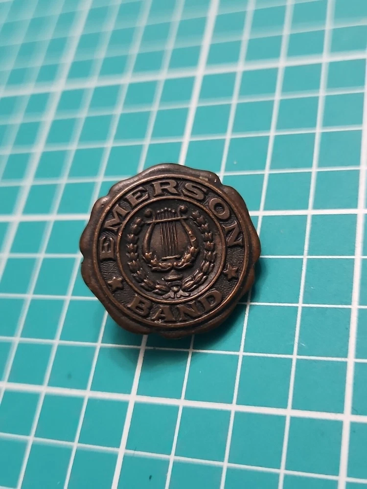 Add a touch of vintage elegance to your collection with this Emerson band screw back lapel pin. Crafted in gold tone, this collectible piece features a stunning design that will complement any outfit. The pin was manufactured in an unknown country/region and has not been modified. It is a perfect addition to any pinback collection and a great conversation starter. The pin is not handmade and belongs to the category of collectible pinbacks. Get your hands on this unique piece now and make a statement with your style.