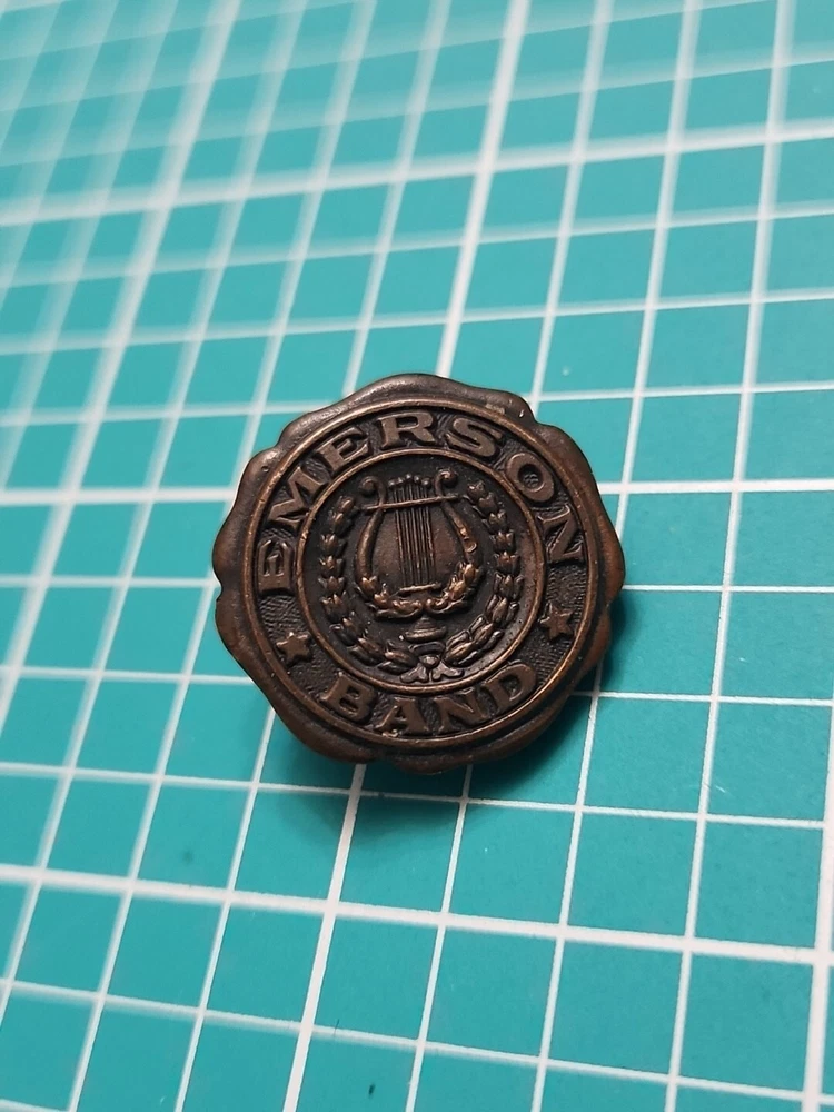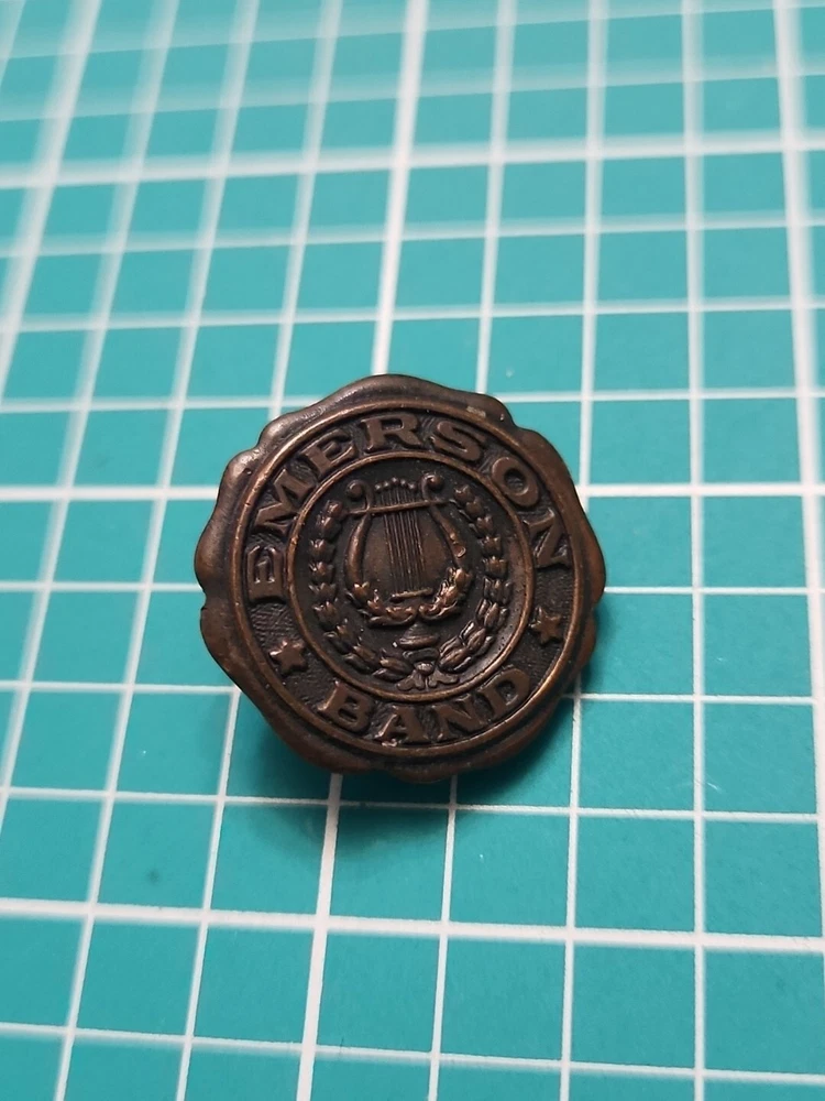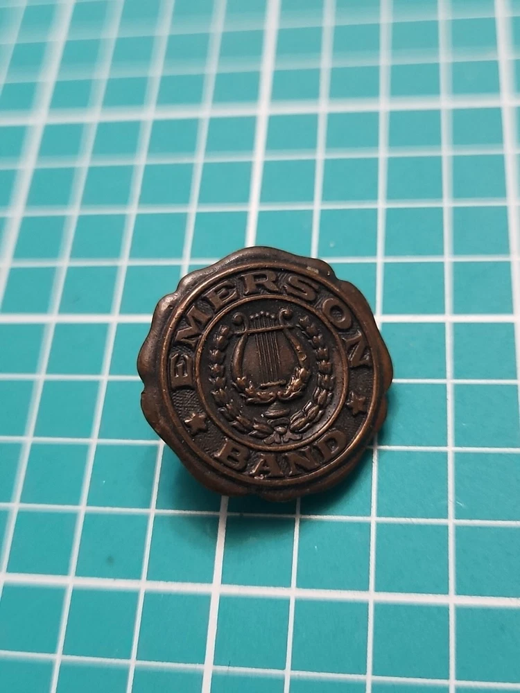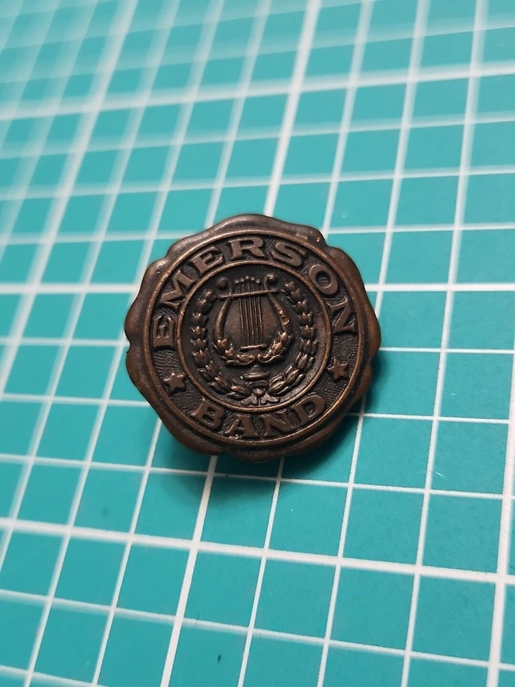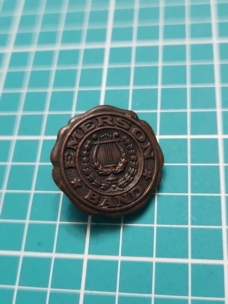 Add a touch of vintage elegance to your collection with this Emerson band screw back lapel pin. Crafted in gold tone, this collectible piece features a stunning design that will complement any outfit. The pin was manufactured in an unknown country/region and has not been modified. It is a perfect addition to any pinback collection and a great conversation starter. The pin is not handmade and belongs to the category of collectible pinbacks. Get your hands on this unique piece now and make a statement with your style.
