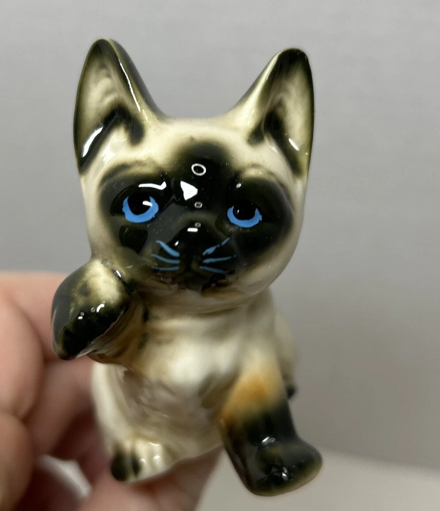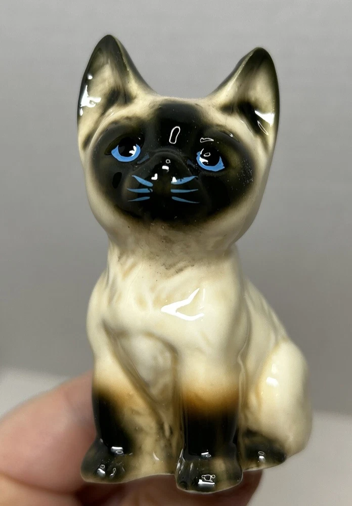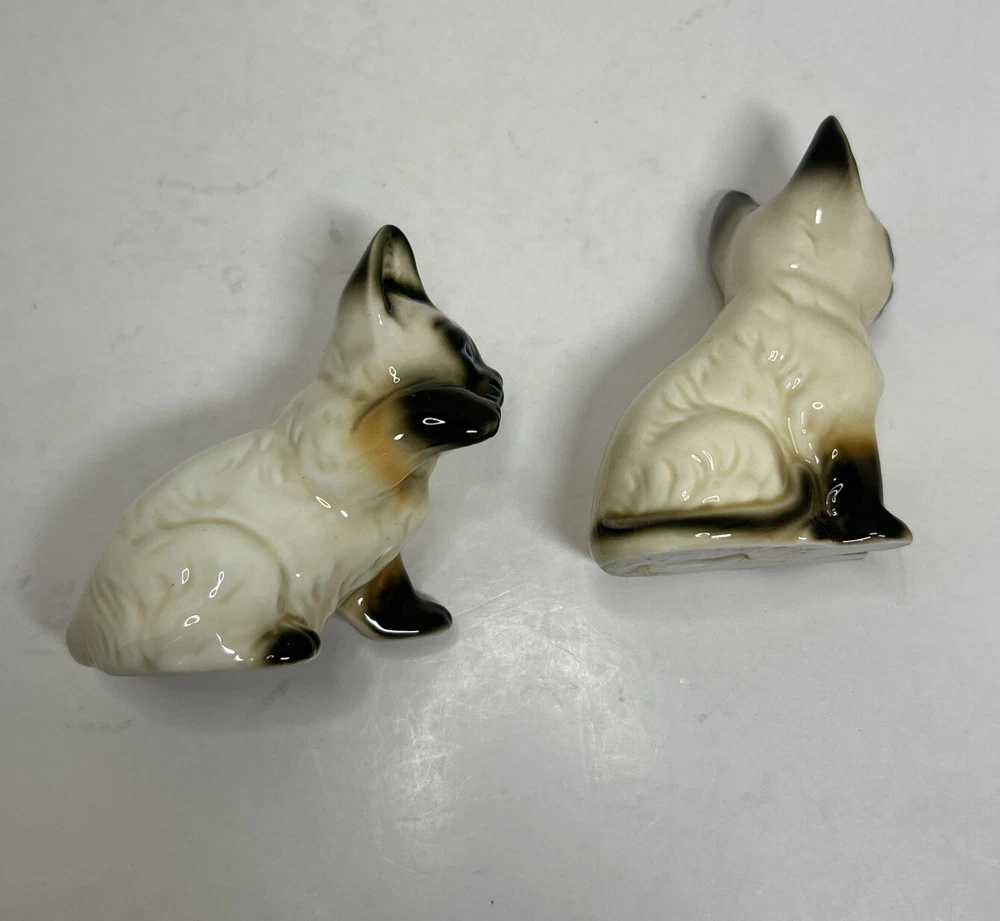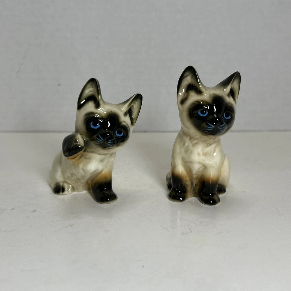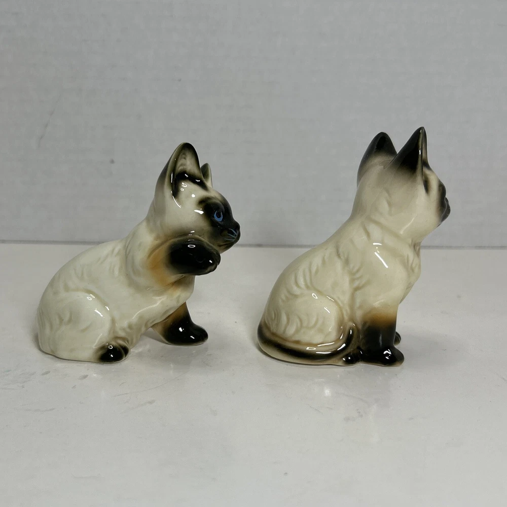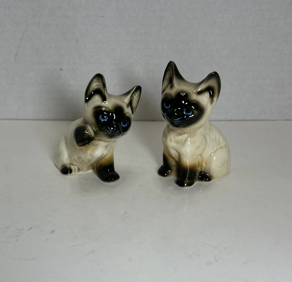 Set of 2 Enesco Siamese blue eyes kittens cats bone chine porcelain. Glossy finish cold painted eyes and blue whiskers Each is about 3 inches tall and about 2 inches in length and about 2 inches wide No chips and no cracks