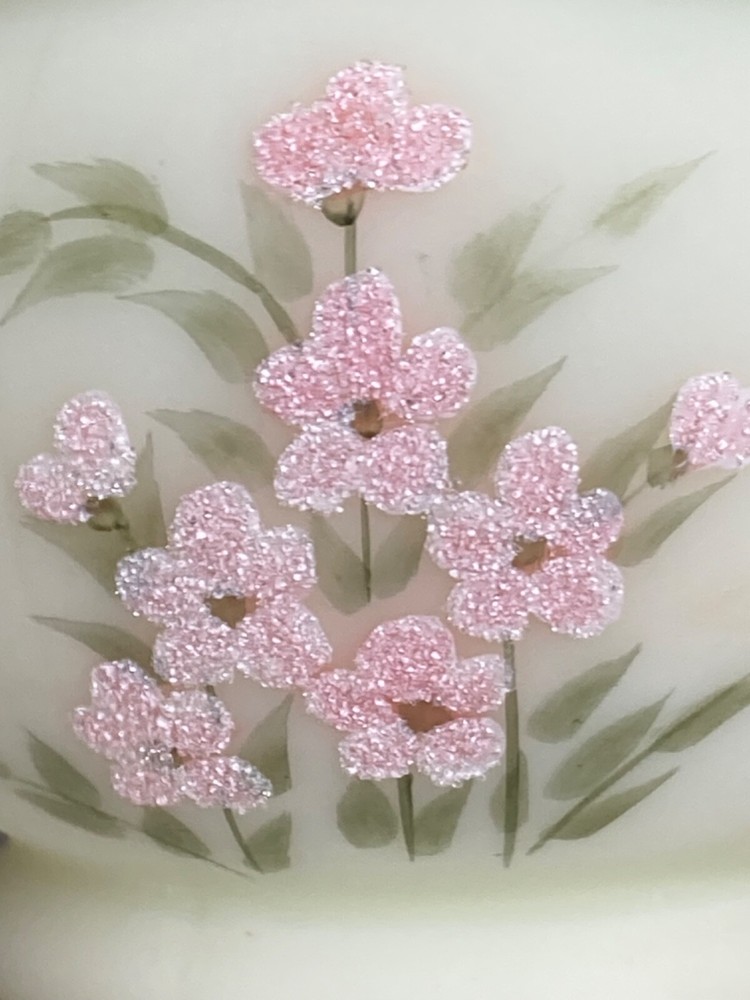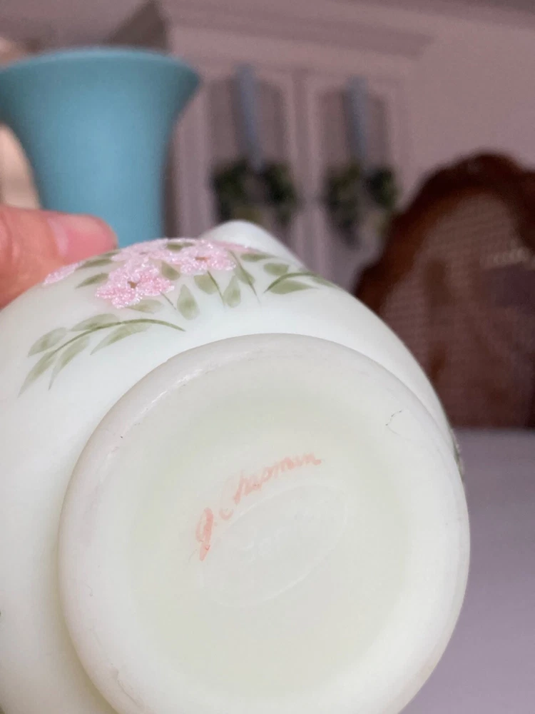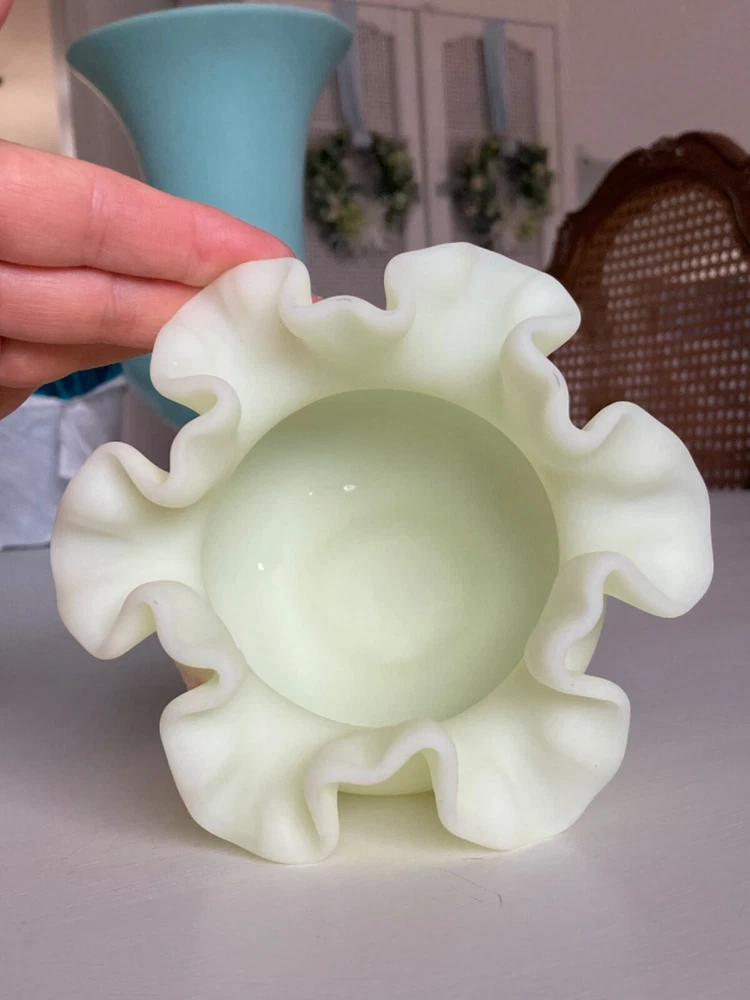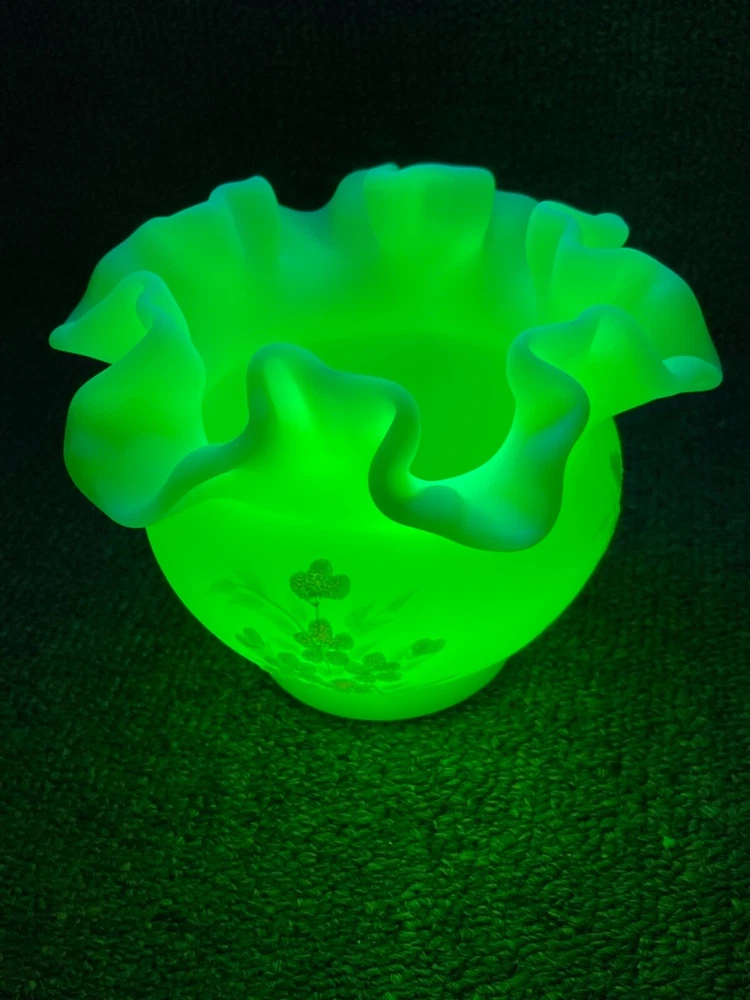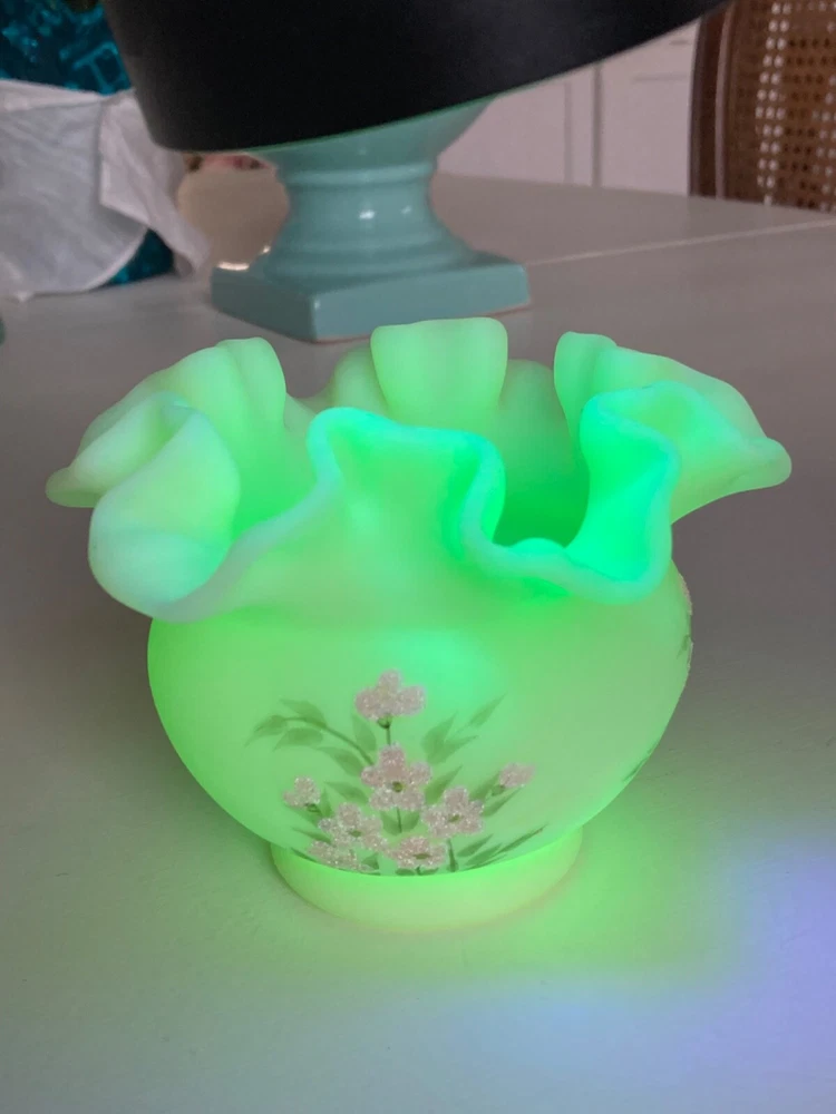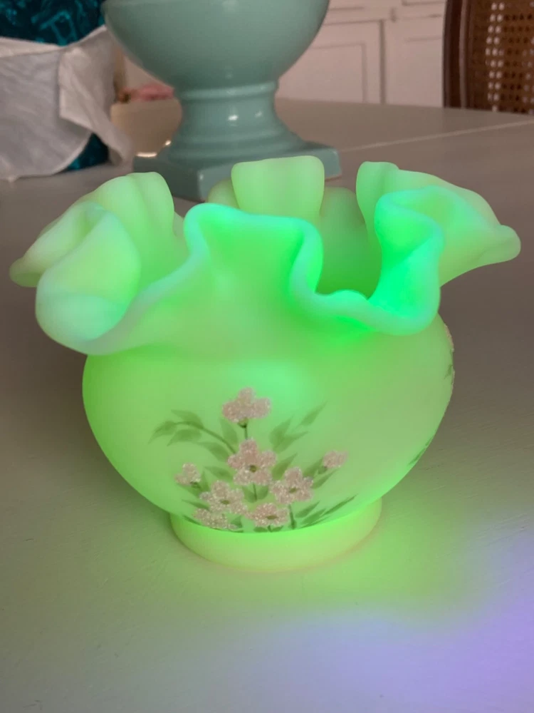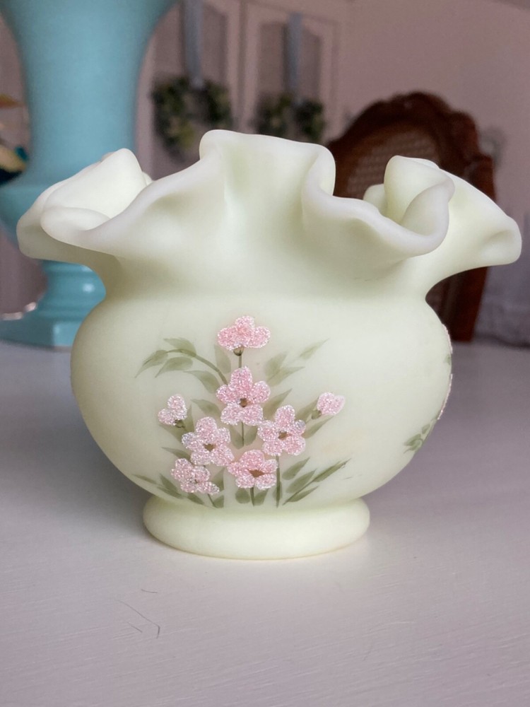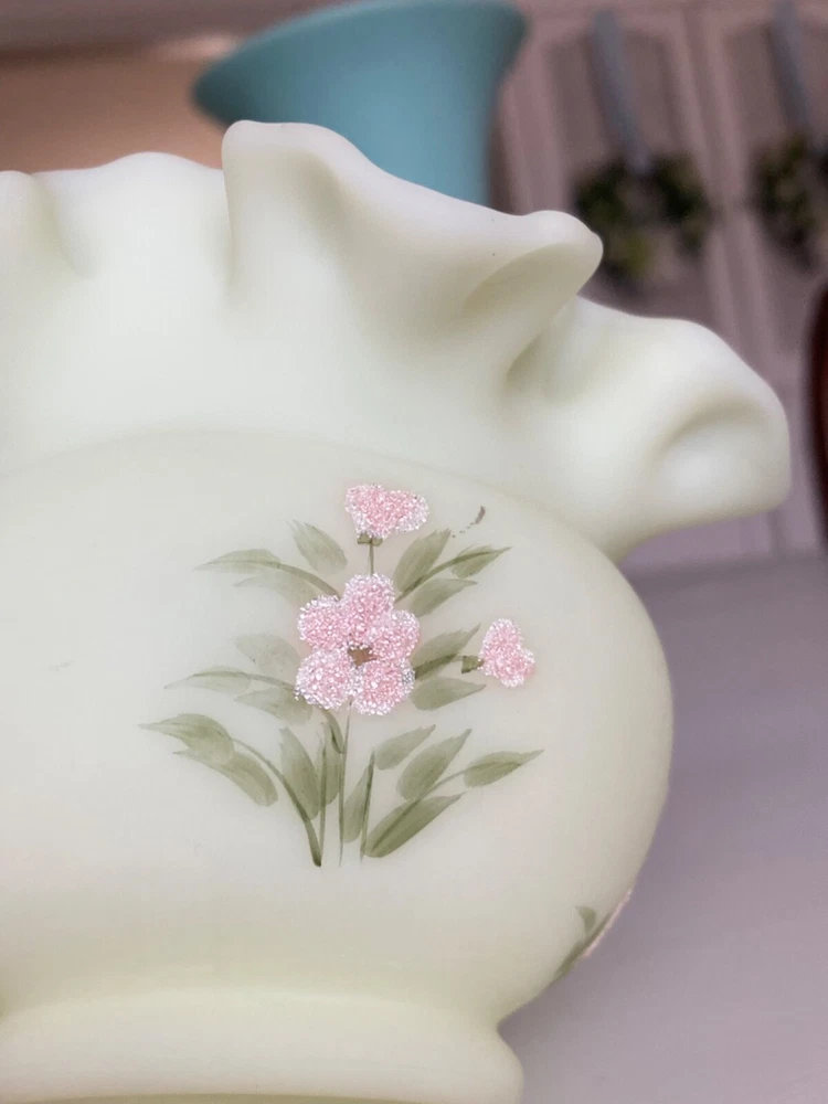 Vintage Fenton uranium custard glass in a very soft yellow with delicate hand painted pink blossoms that look “sugared” :-) It is a ruffled rose bowl with a faint embossed oval Fenton stamp on the bottom along with a signature of what looks like J Chapman. Such a pretty vase! Please email us with any questions and please check our Ebay store, Hooked-On-Vintage, for more great vintage items. We combine ship!