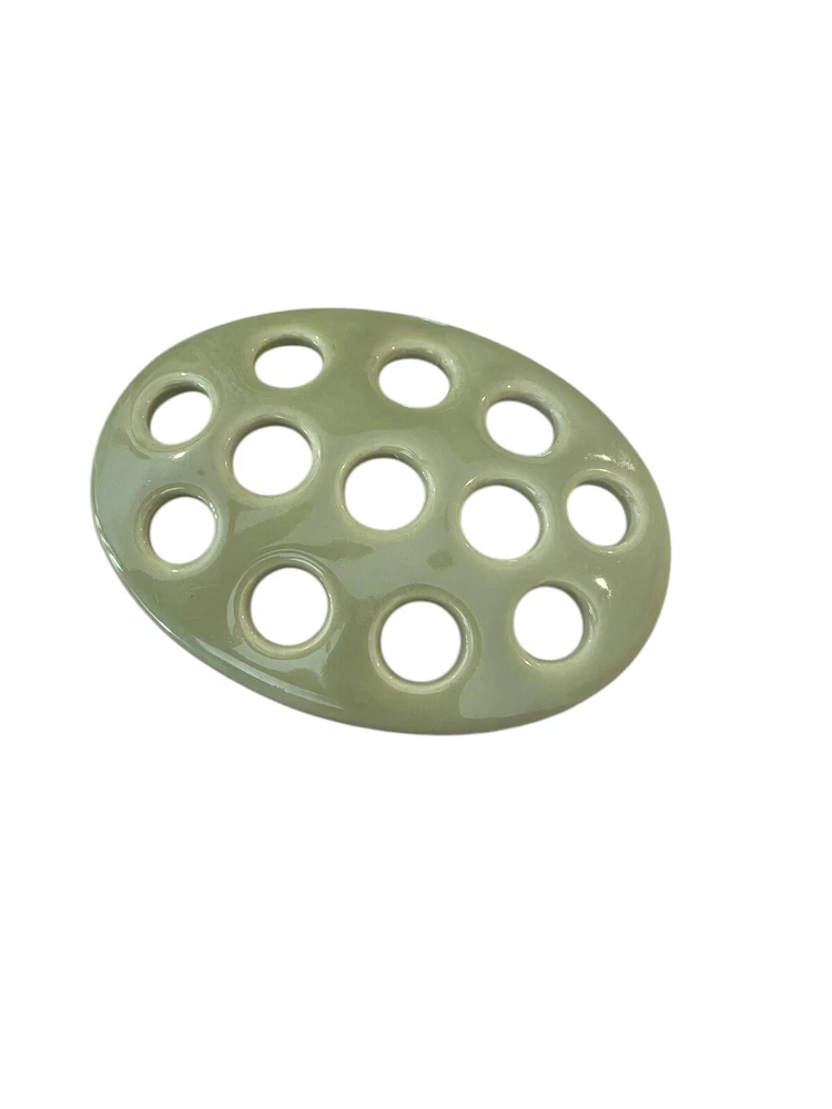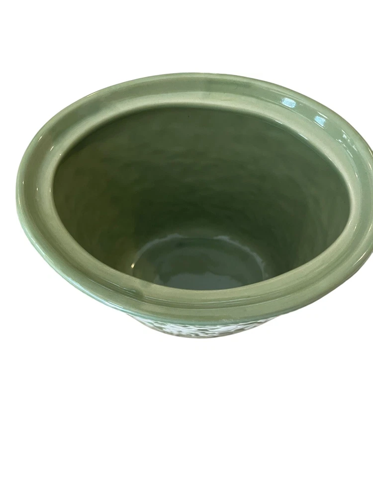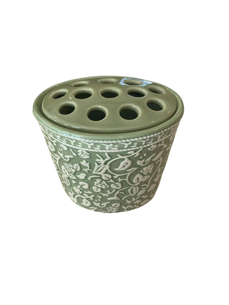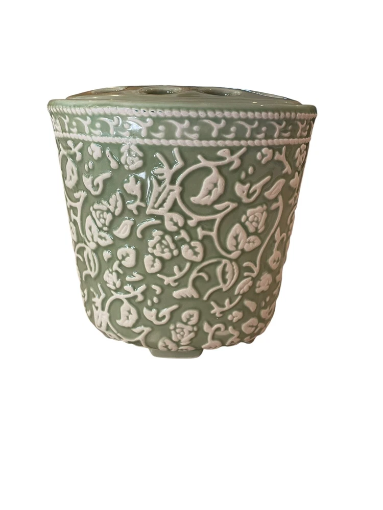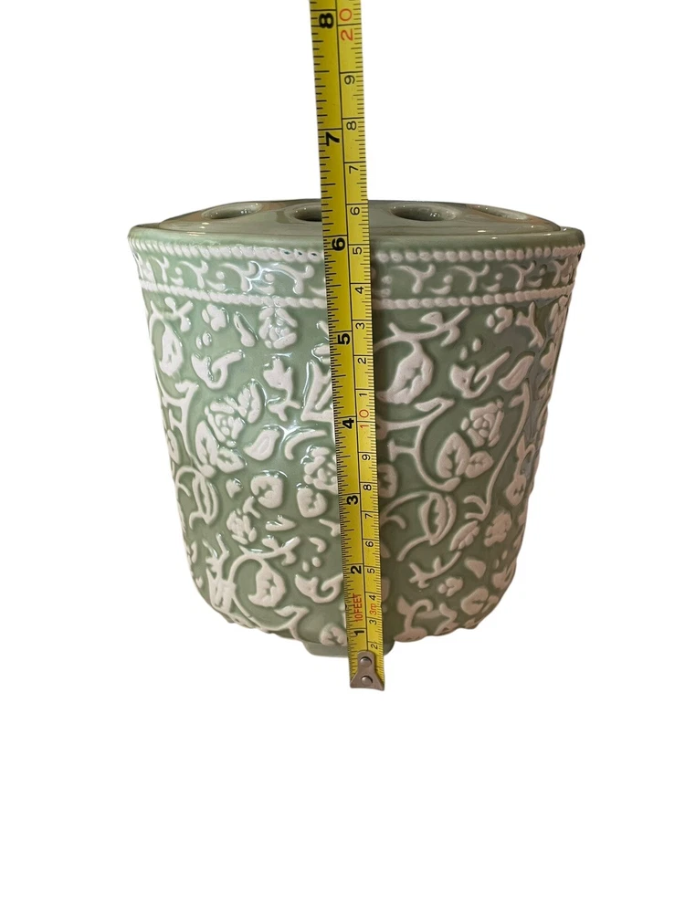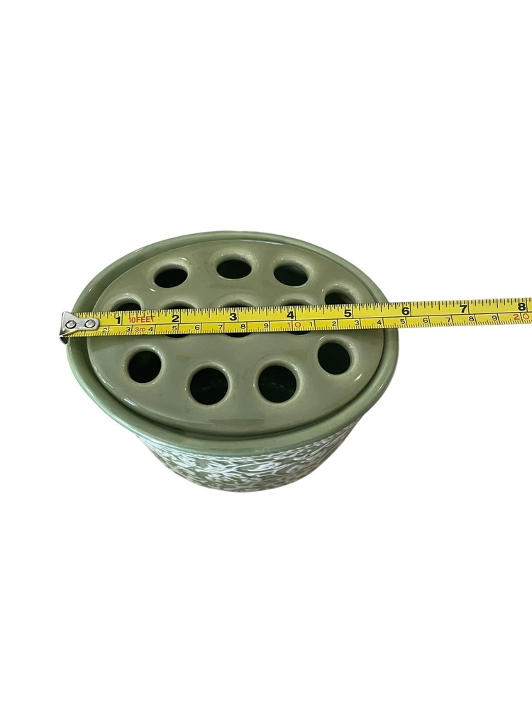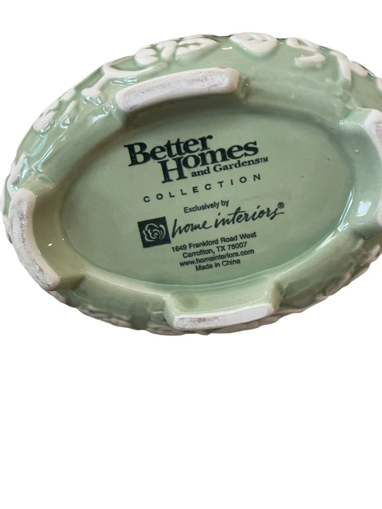 The product is a vintage flower vase with a frog toothbrush holder from Better Homes & Gardens Home Interiors. It features a floral pattern, green color, and serves as a decorative collectible item.
