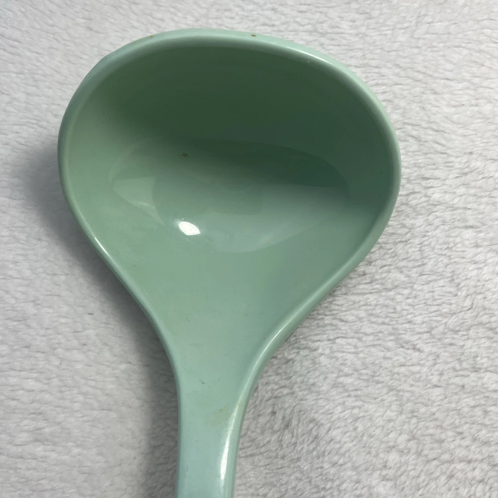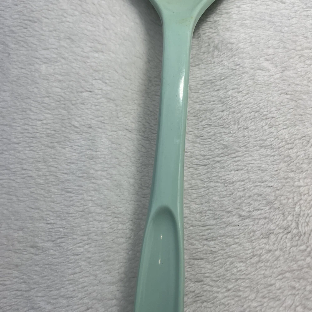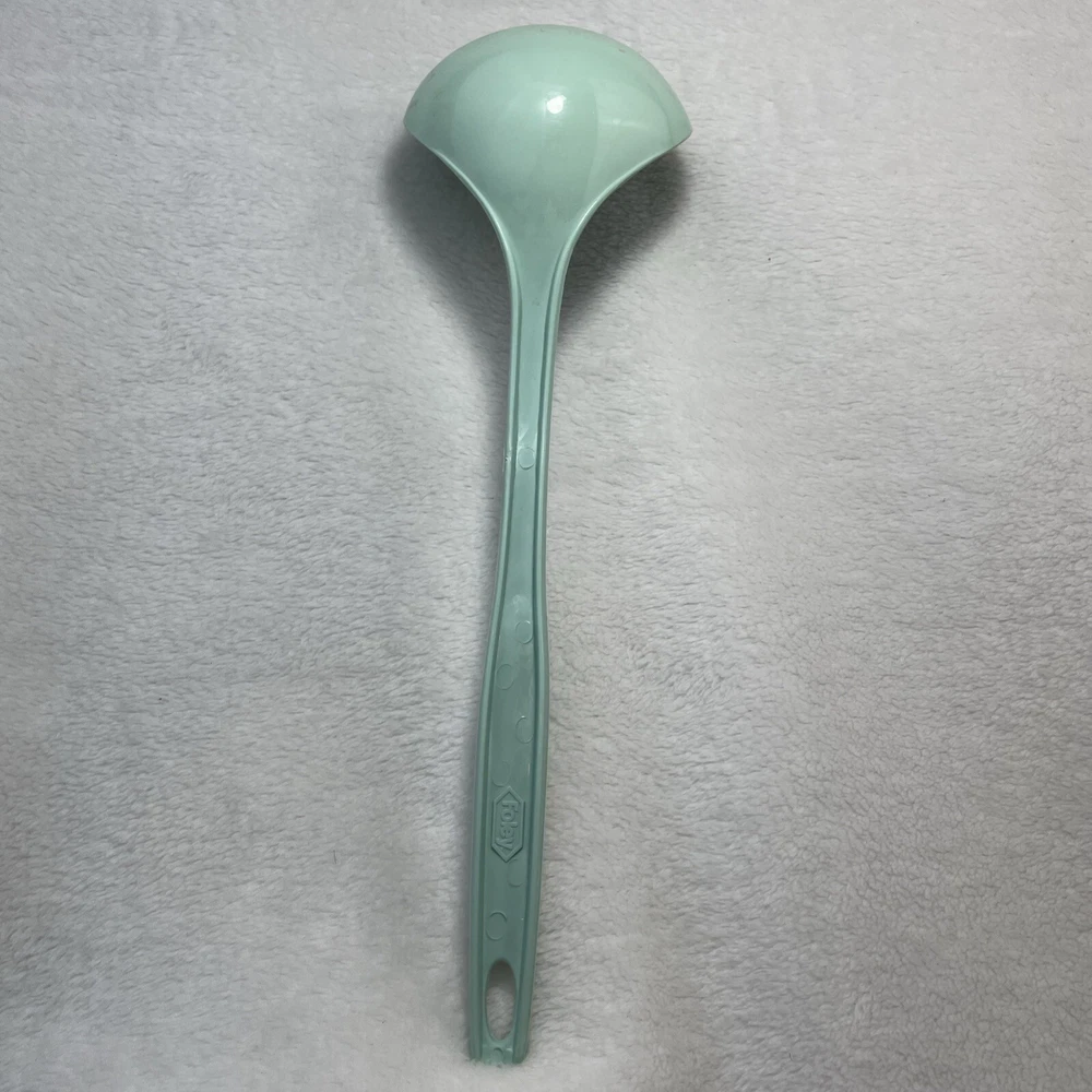 This vintage Foley nylon serving ladle is a must-have for any retro kitchen. The ladle comes in a beautiful green solid color and is made of durable plastic material. The ladle features a unique design with a curved lip and a solid pattern that makes it stand out from other ladles. The Foley nylon serving ladle is perfect for cooking and serving food. It is ideal for those who are looking for a retro-themed kitchen utensil that is both functional and stylish. The ladle is made in the United States and comes with a set that includes a ladle and a cooking spoon. The handle of the ladle is also made of plastic, making it easy to hold and use.