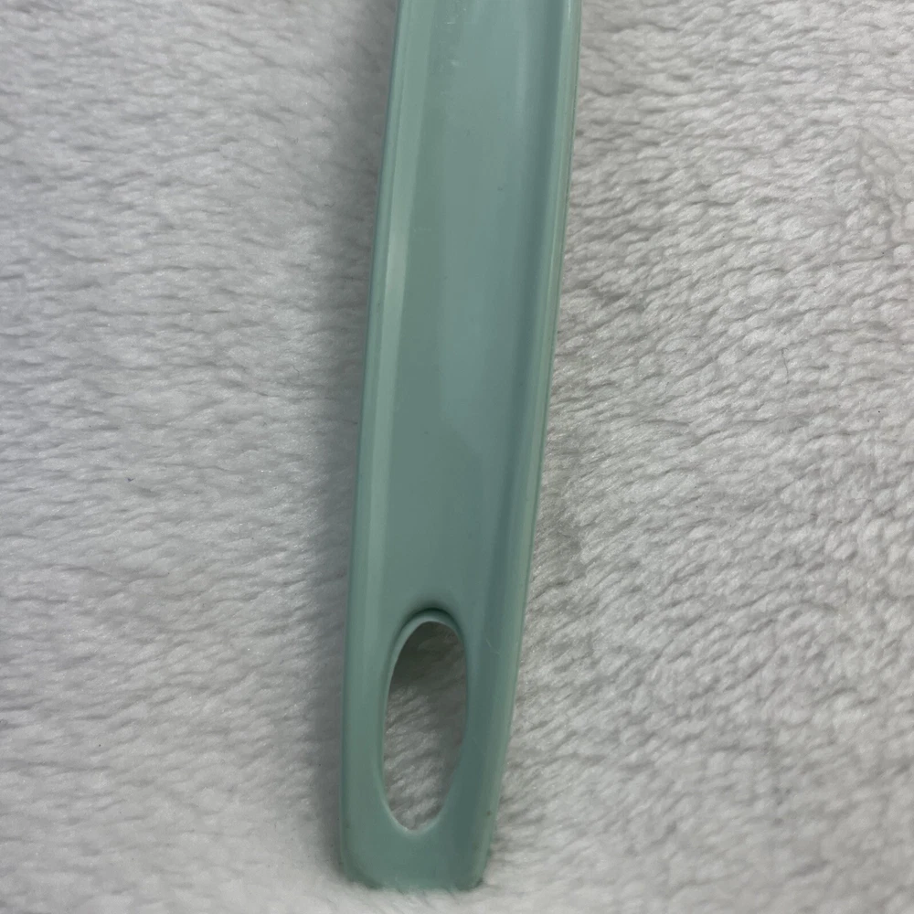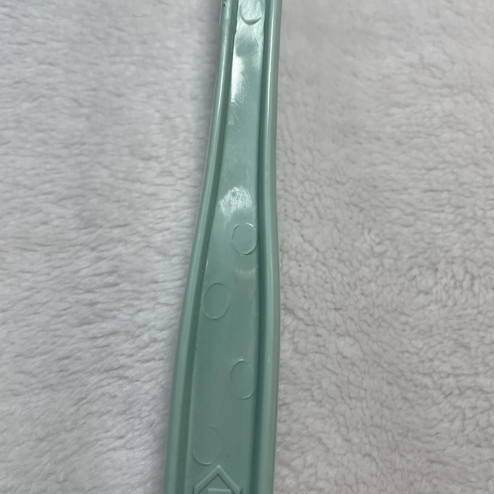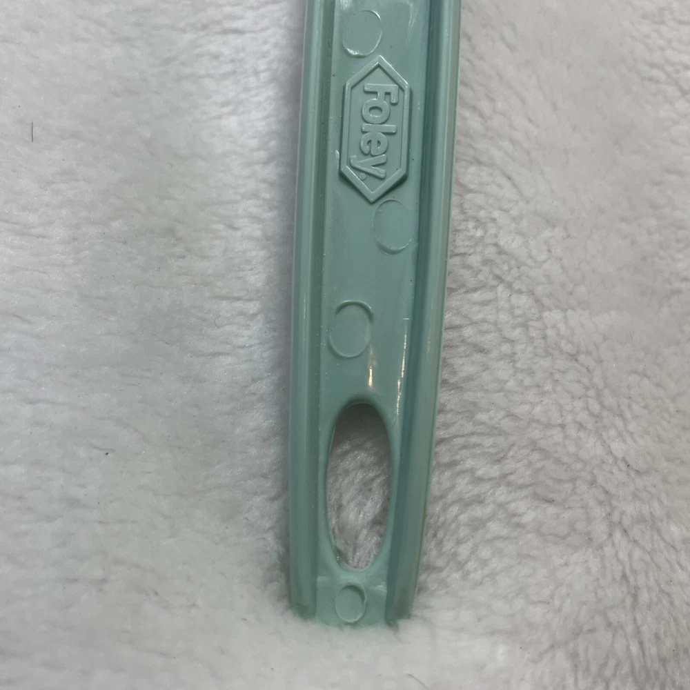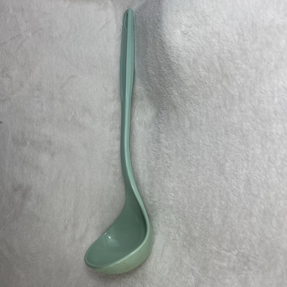 This vintage Foley nylon serving ladle is a must-have for any retro kitchen. The ladle comes in a beautiful green solid color and is made of durable plastic material. The ladle features a unique design with a curved lip and a solid pattern that makes it stand out from other ladles. The Foley nylon serving ladle is perfect for cooking and serving food. It is ideal for those who are looking for a retro-themed kitchen utensil that is both functional and stylish. The ladle is made in the United States and comes with a set that includes a ladle and a cooking spoon. The handle of the ladle is also made of plastic, making it easy to hold and use.