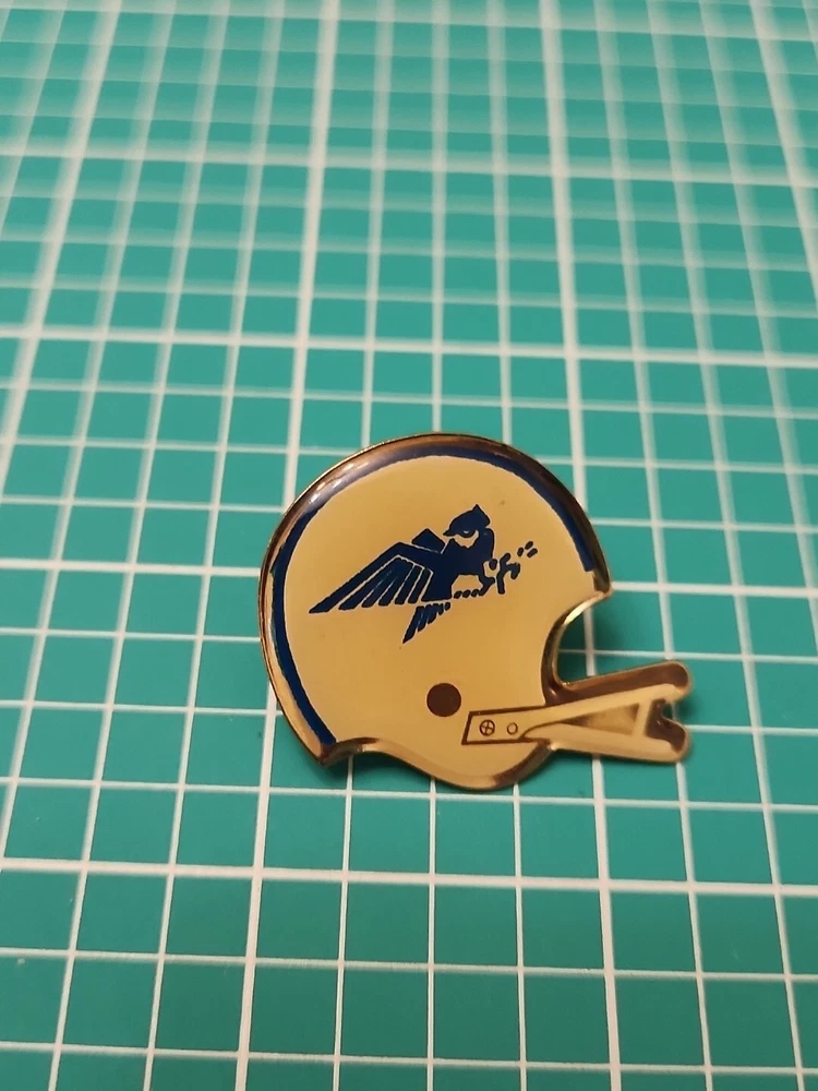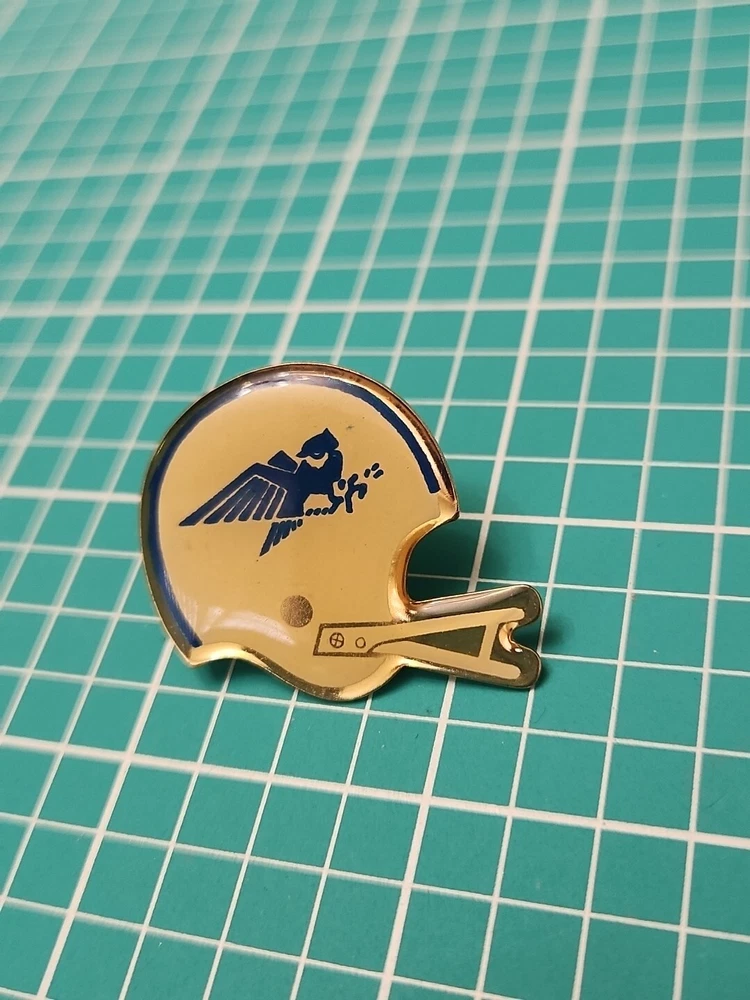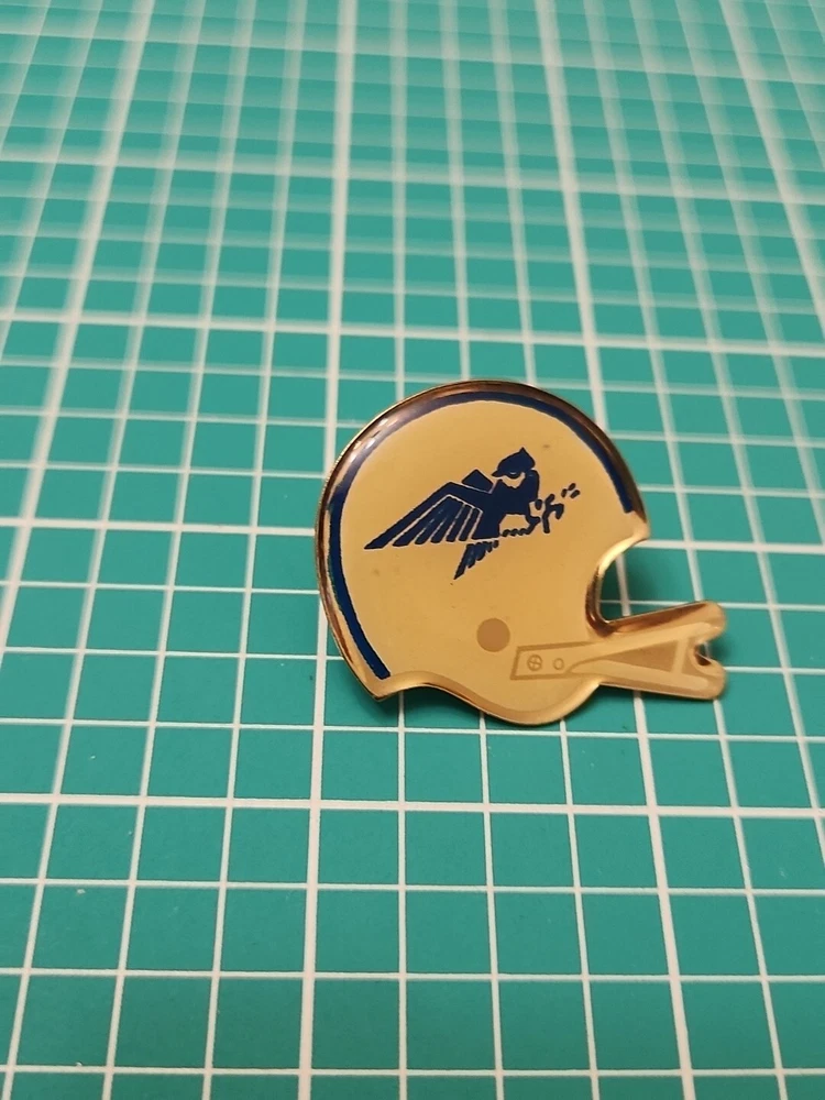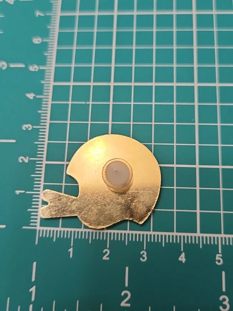 Show off your love for football with this vintage lapel pin. The gold tone helmet pin features a team logo that will make a great addition to any collection. Perfect for adding to a hat or jacket, this pin is a must-have for any football fan or collector. Crafted with care, this pin is sure to make a statement wherever it is worn. It's a great conversation starter and a unique way to show your team pride. Don't miss out on the opportunity to add this vintage football helmet lapel pin to your collection today.
