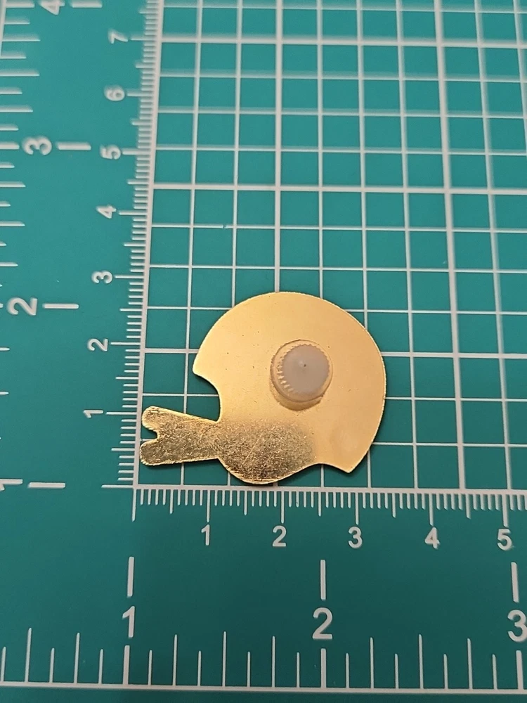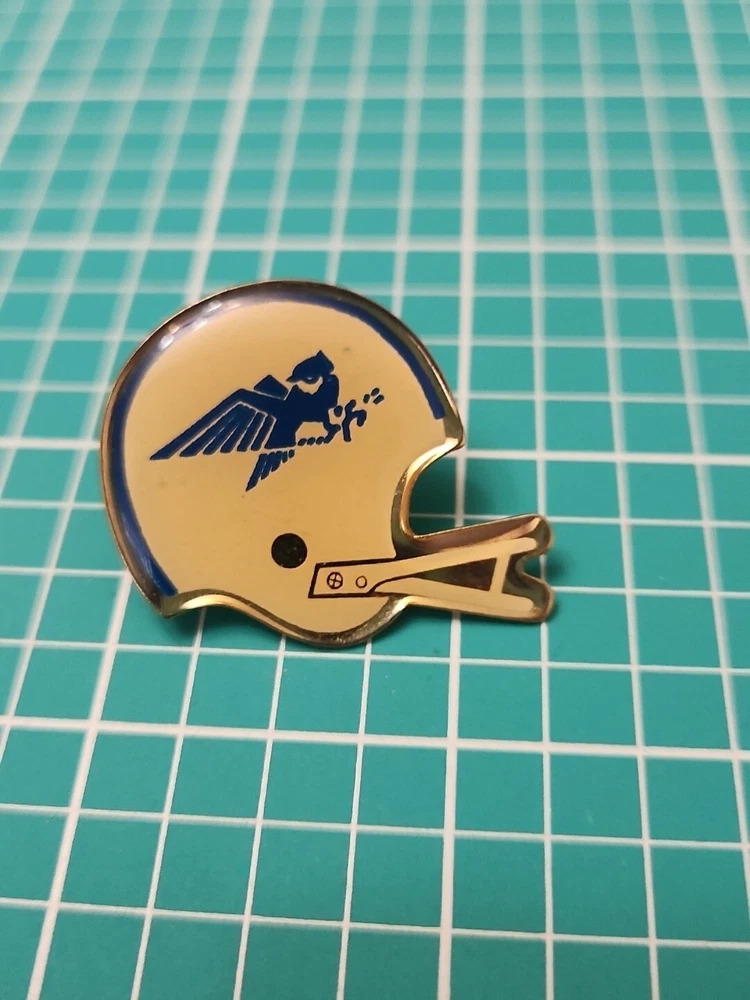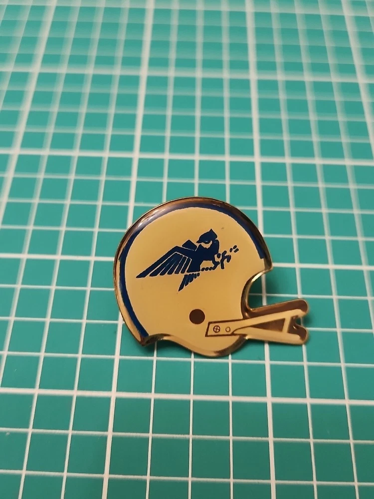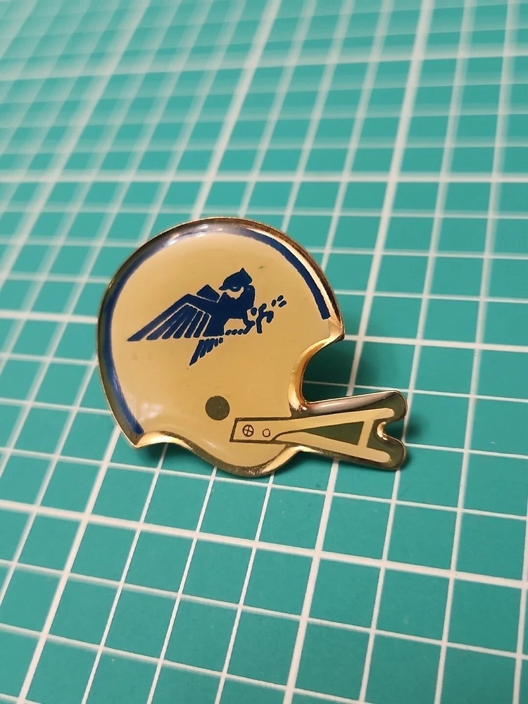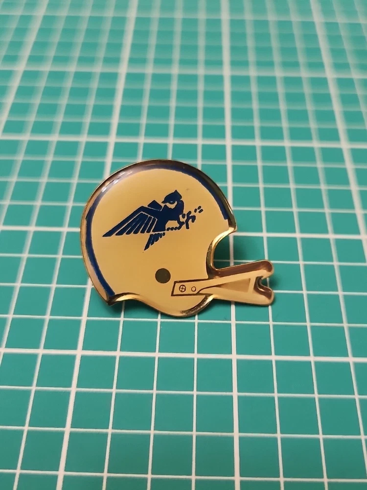 Show off your love for football with this vintage lapel pin. The gold tone helmet pin features a team logo that will make a great addition to any collection. Perfect for adding to a hat or jacket, this pin is a must-have for any football fan or collector. Crafted with care, this pin is sure to make a statement wherever it is worn. It's a great conversation starter and a unique way to show your team pride. Don't miss out on the opportunity to add this vintage football helmet lapel pin to your collection today.